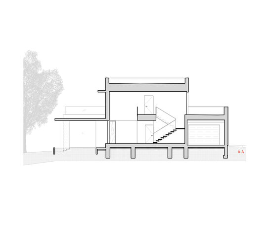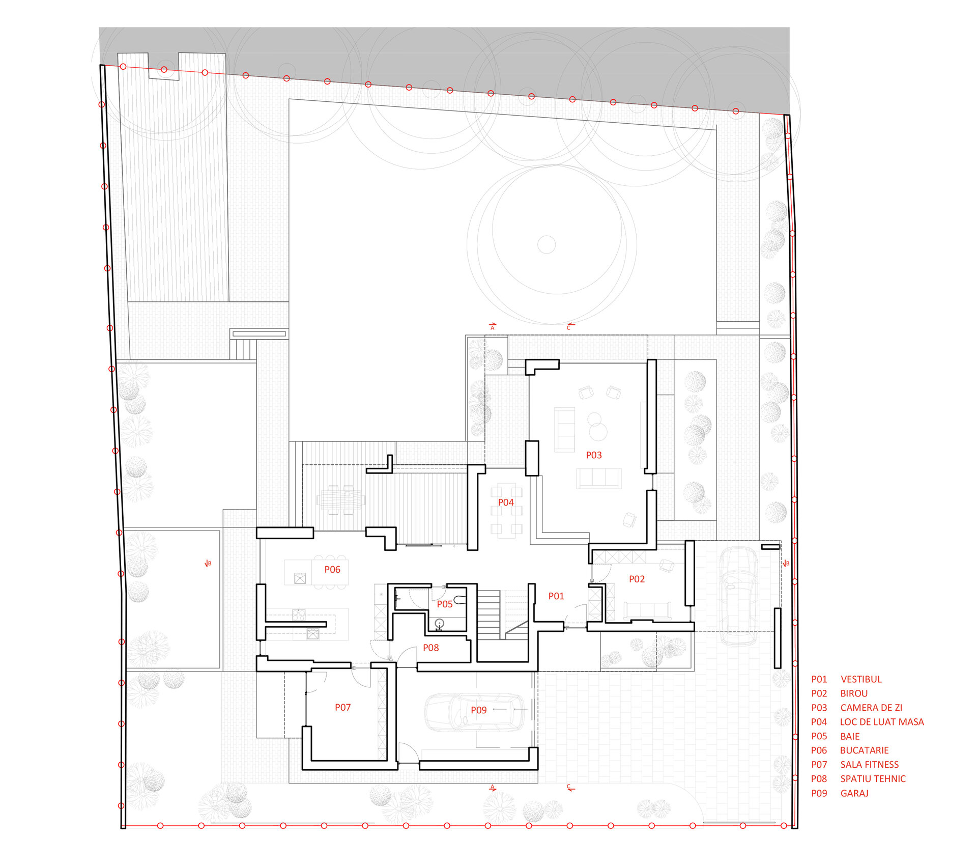 Planimetric, parterul cuprinde funcțiunile de zi: bucătăria, zona de luat masa, biroul și sala de fitness. Livingul este volumetric “atras”, aproape magnetic, catre stejar, ajungând să fie amplasat aproape în mijlocul grădinii. Urmând declivitatea terenului, aceasta zona este mai coborâtă față de restul parterului și se inserează discret în peisaj. Din acest spațiu se deschid perspective ample către lac și grădină.