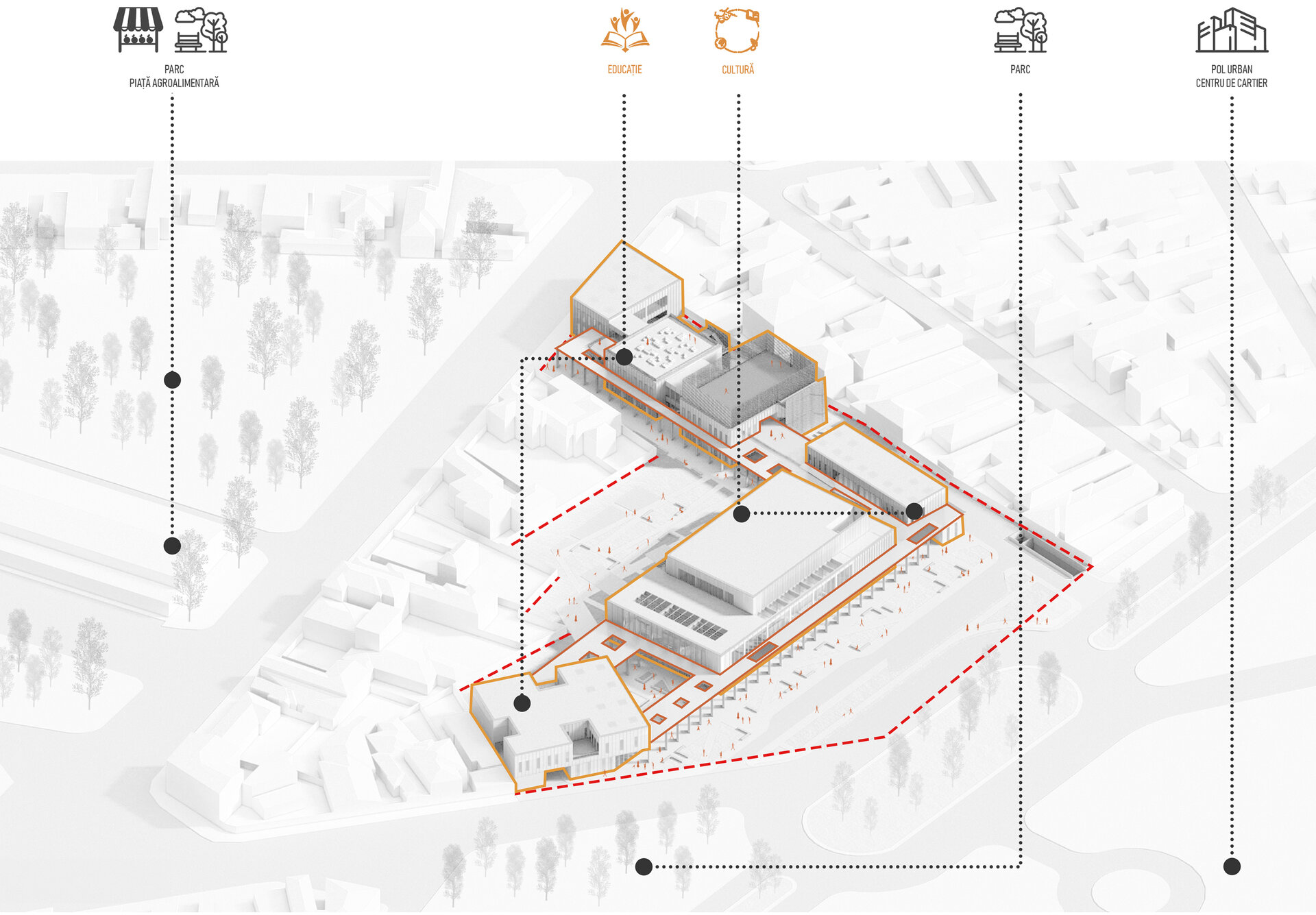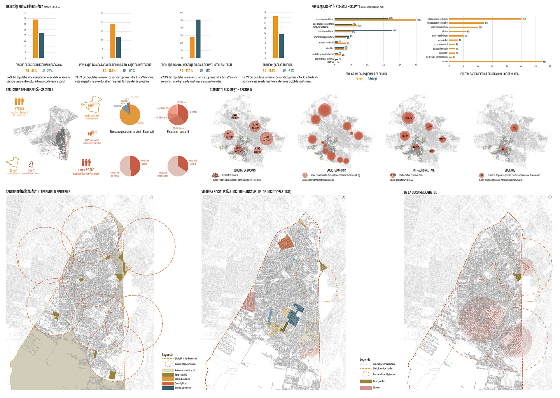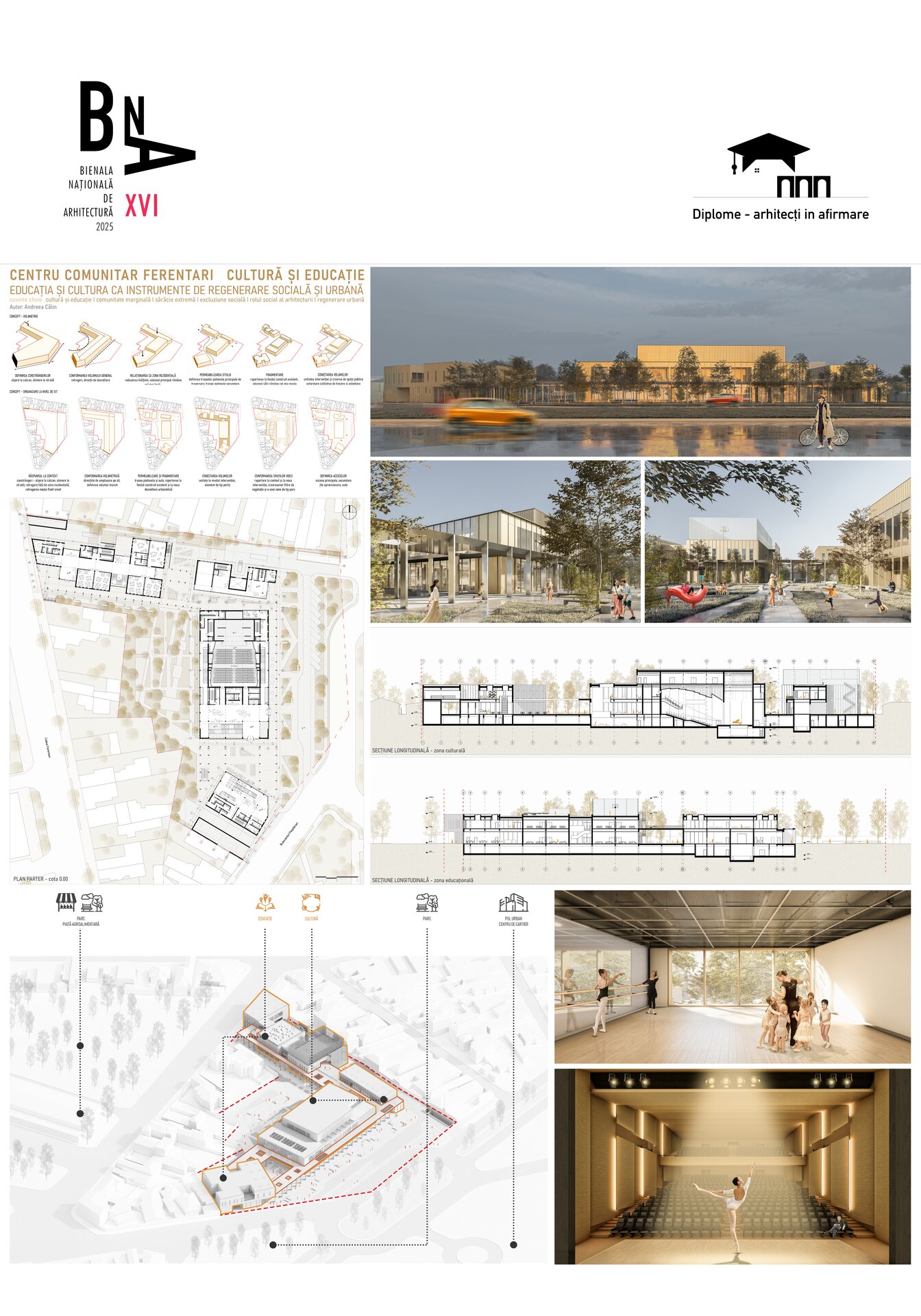 Tema proiectului constă în realizarea unui Centru Comunitar cu accent pe Cultură și Educație în Ferentari, care să devină un catalizator pentru coeziunea socială și regenerarea urbană. Centrul va încorpora valorile locale, incluzând spații care redau identitatea culturală a comunității de romi, cu zone dedicate muzicii și dansului. Va stabili un dialog urban prin crearea unei conexiuni fizice și vizuale cu vechiul coridor feroviar și cu zona industrială, transformând traseul feroviar într-o alee publică vie. Programul va fi diversificat și va combina activități educaționale non-formale, precum after-school, cluburi de lectură și ateliere creative, cu evenimente culturale – expoziții de artă, proiecții de film și spectacole de teatru comunitar. Spațiul va fi incluziv, cu zone interioare și exterioare concepute atât pentru activități de grup de mari dimensiuni, cât și pentru colțuri intime de studiu și reflecție. Învățarea experiențială va fi susținută printr-un „laborator urban” în aer liber – o grădină educațională, o mică fermă urbană și zone de joacă pedagogică. Nu în ultimul rând, sustenabilitatea și inovația vor fi principii fundamentale, prin utilizarea tehnologiilor verzi precum acoperișuri verzi, panouri solare și sisteme pasive de ventilație.
