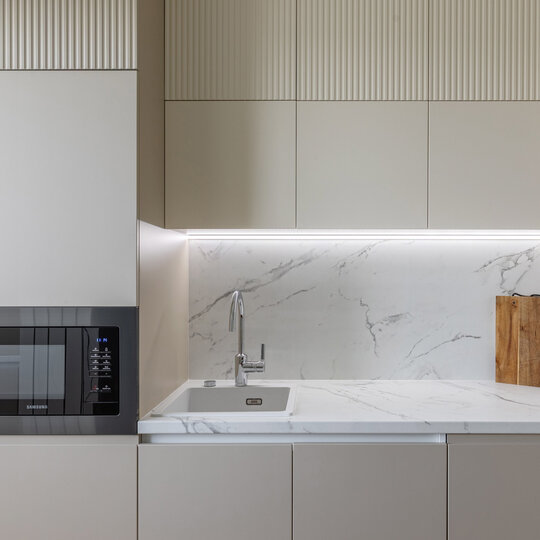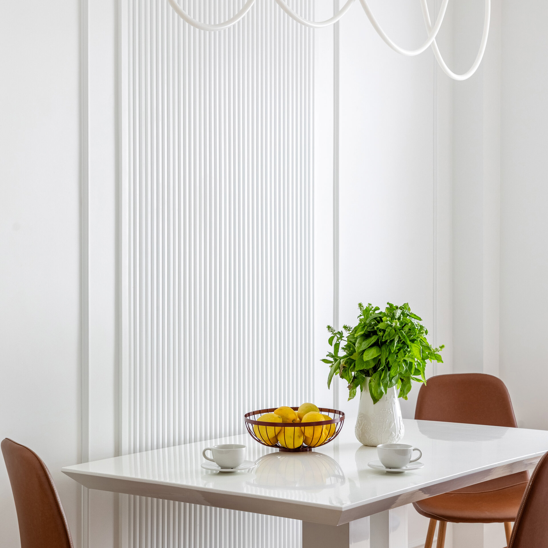 Locul de luat masa se regăsește în inima apartamentului. Am păstrat masa existentă și am pus-o în valoare printr-un fundal luminos și texturat, completat de un corp de iluminat sculptural care creează o atmosferă caldă și elegantă. „Momentul principal de adunare este luatul mesei”, iar aici începe totul: cu un spațiu funcțional, care invită la gătit și la a fi împreună cu familia. Nu e doar o adresă, e senzația care te întâmpină când intri pe ușă.