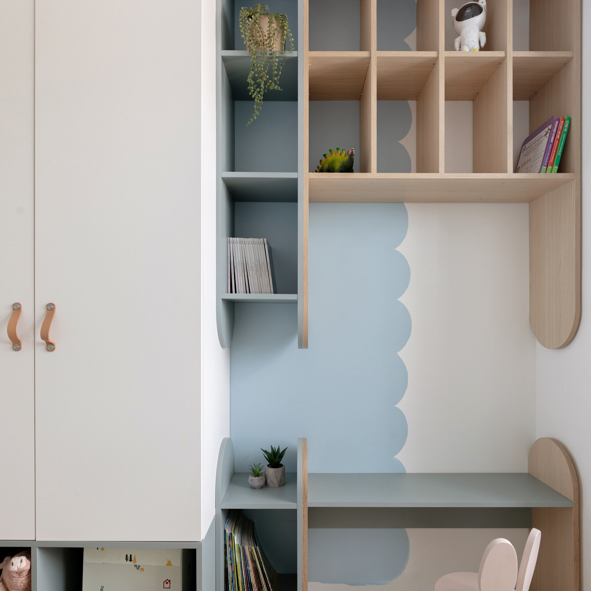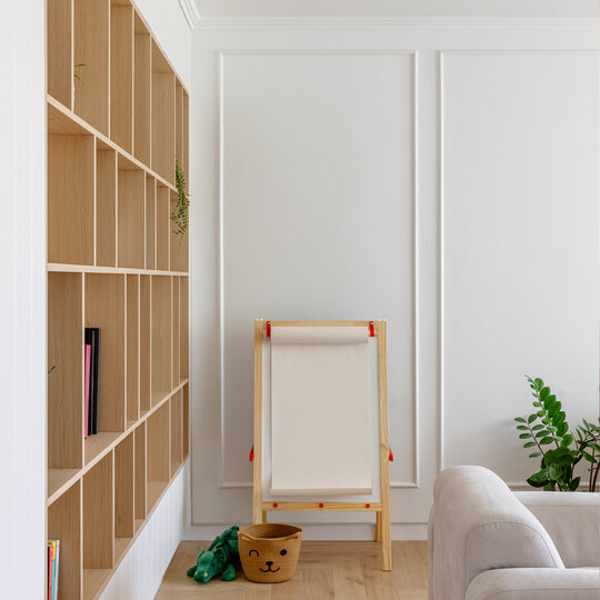 Biblioteca este piesa de rezistență a livingului: cu rafturi deschise pentru cărți și obiecte dragi, alături de spații închise care păstrează ordinea discret. Rafturile coborâte aproape de podea permit copilului să ajungă singur la cărți și jucării, iar în același timp am creat o zonă de joacă și desen, astfel încât să fie parte din acest spațiu comun și să se simtă în largul lui. Ritmul mobilierului transmite veselie și armonie, iar fiecare detaliu susține ideea de spațiu trăit și adaptabil.