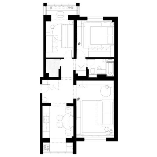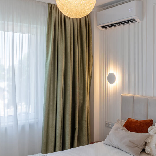 Dormitoarele păstrează liniștea esențială, cu texturi moi, culori calde și lumină difuză, transformând fiecare cameră într-un refugiu intim. Amenajarea aduce împreună simplitatea și funcționalitatea, dar și căldura vieții de zi cu zi, astfel încât ordinea și claritatea spațiului permit relaxarea și reconectarea zilnică.
