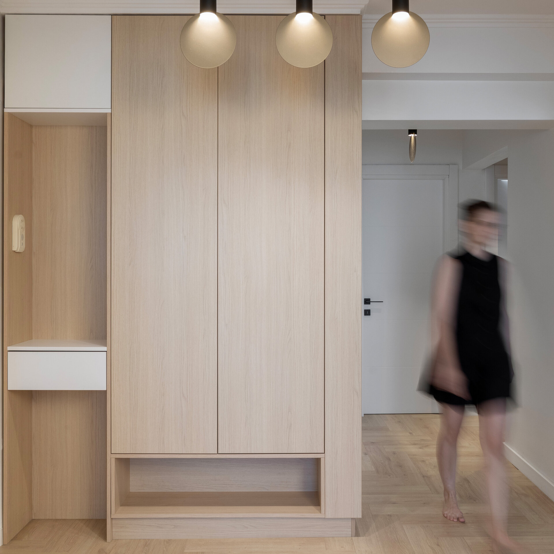 Acest apartament cu 3 camere a fost gândit pentru o familie cu un copil, un spațiu în care fiecare membru își găsește locul și fiecare gest cotidian se desfășoară firesc. Primul pas în casă este și primul moment de liniște. Holul devine un filtru între exterior și interior, un loc care spune „Bine ai venit” și invită să lași ziua în urmă. Depozitarea ascunsă, integrată într-un mobilier înalt și discret, aduce ordine și claritate, iar tonurile calde și texturile naturale fac ca spațiul să fie primitor încă de la intrare.