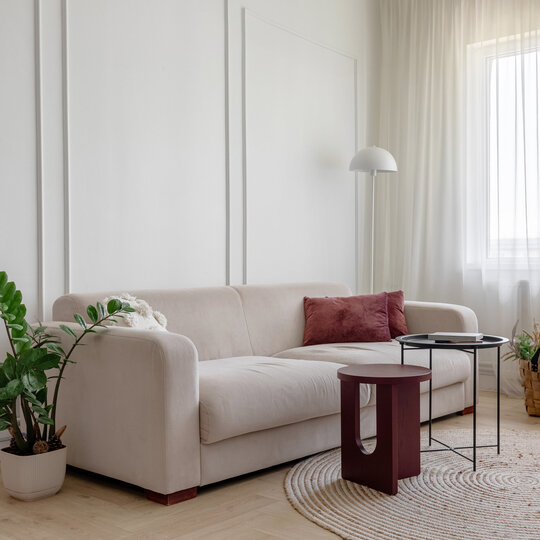 Livingul este zona de respiro: lumină naturală filtrată, perne catifelate în tonuri calde și o alăturare de mese de cafea pentru flexibilitate. Un perete lăsat liber și spațiul aerisit din jur permit să respiri și să iei o pauză, fără să fie încărcată privirea cu decor. Spațiul este gândit pentru citit, discuții liniștite sau seri de film în familie. „Acasă vreau să mă liniștesc” — iar acest colț este creat exact pentru asta.