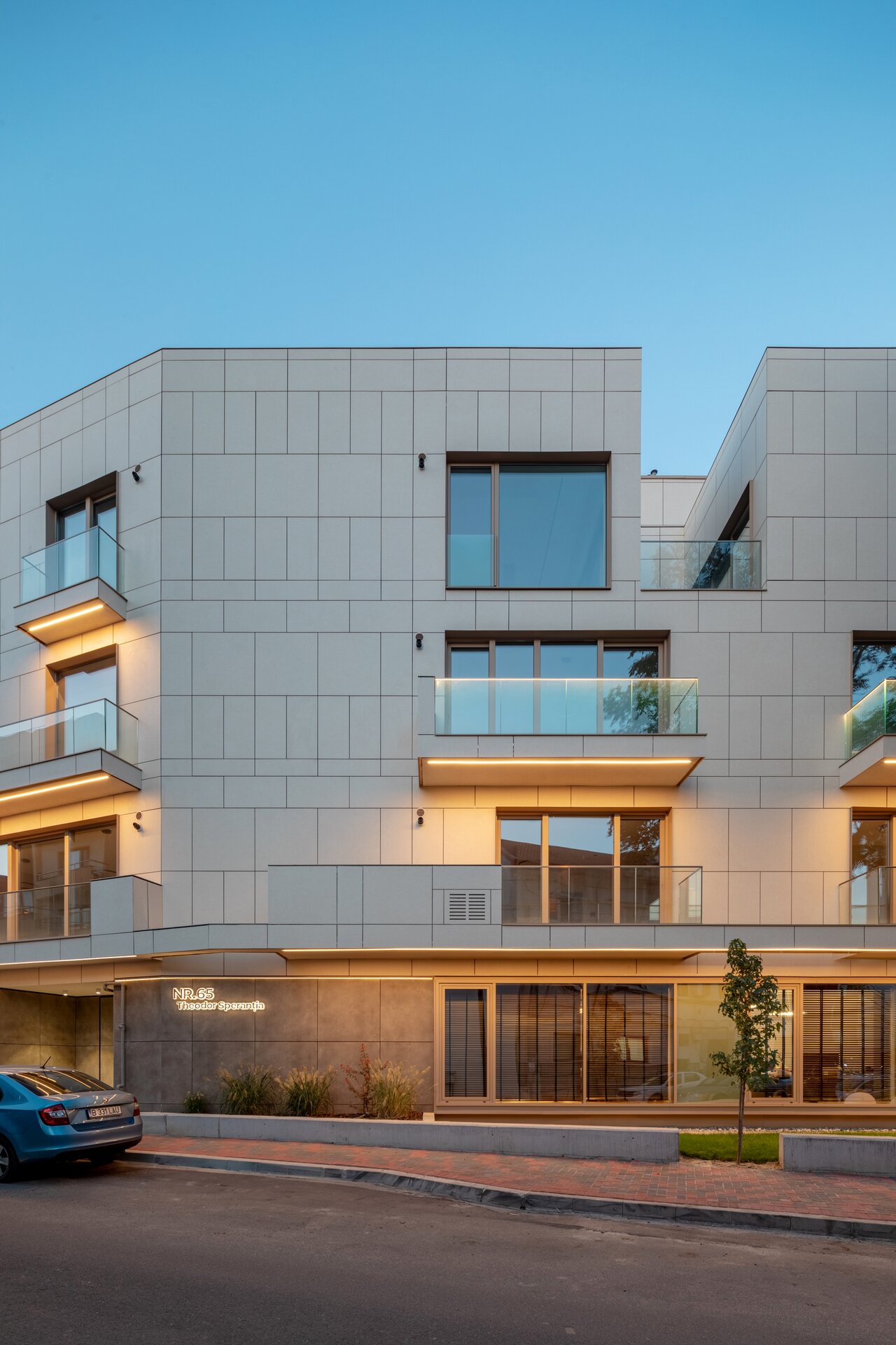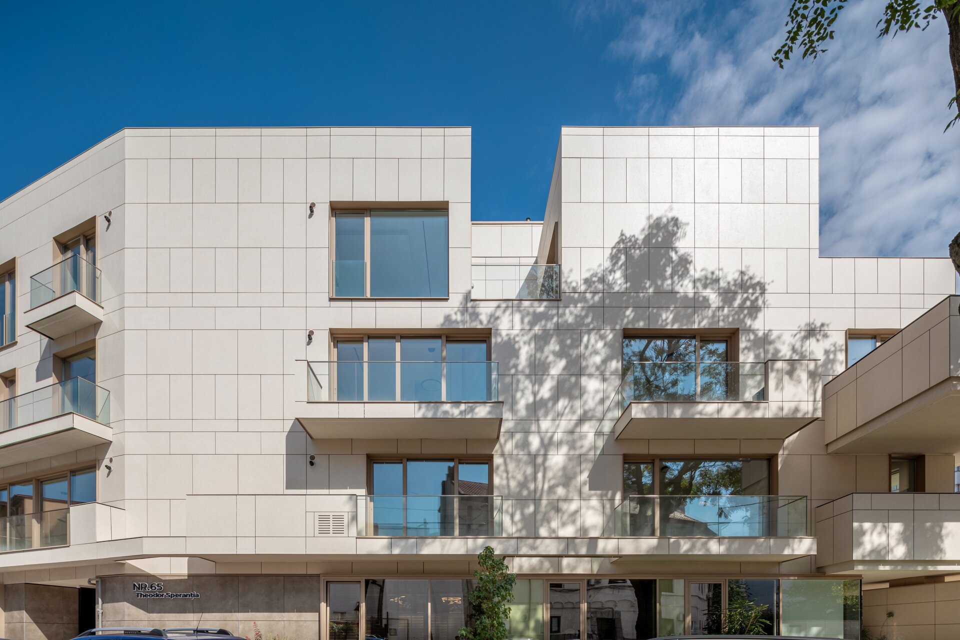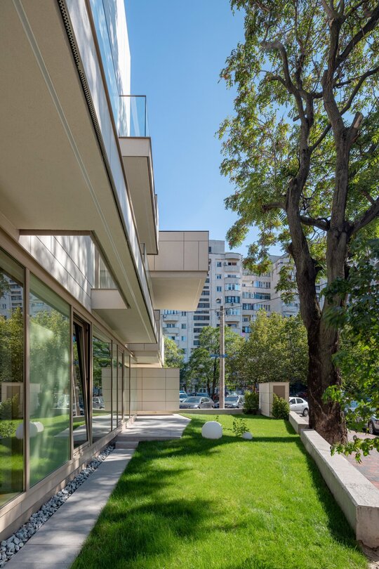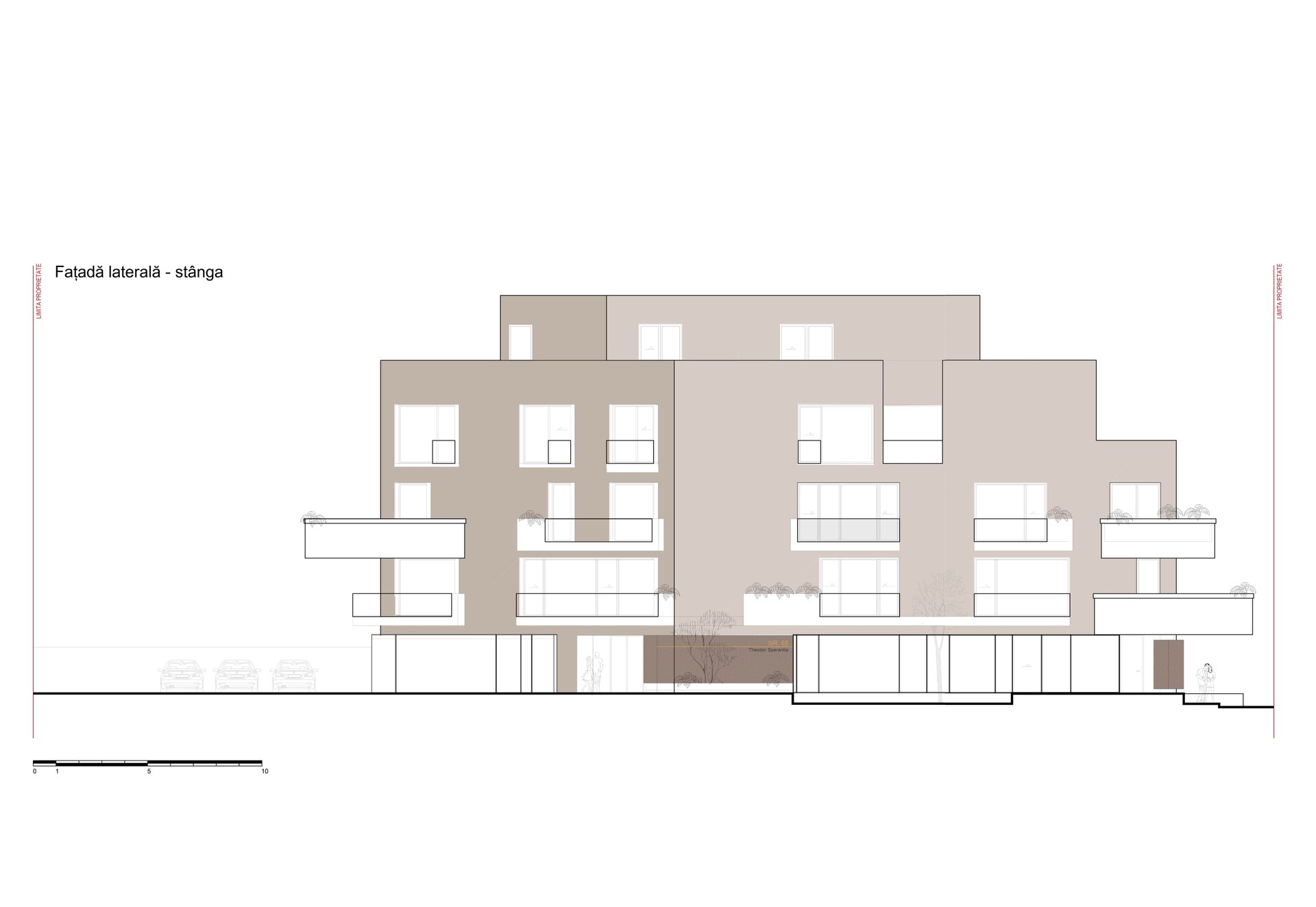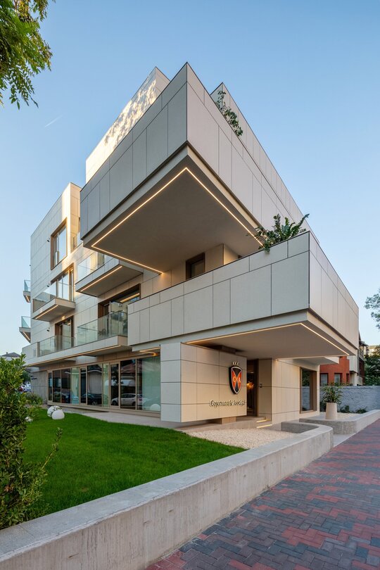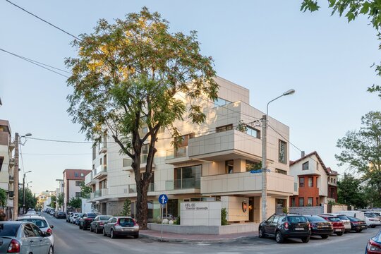 Programul de arhitectură convenit împreună cu beneficiarii acestui teren are în vedere 11 apartamente cu dotări superioare și un spațiu comercial la parter, pe o suprafață construită la sol de 370 mp și desfășurata totală de 1400 mp. Volumetria compactă se dezvoltă pe patru niveluri peste un subsol pe întreg perimetrul construibil, ultimele două etaje fiind parțiale și retrase, așa încât vederea dinspre intersecție să ofere cea mai bună relație cu scara generală a construcțiilor învecinate. Modelarea retragerilor în volumul general construibil permis de regulamentul zonei este foarte bine dozată și generează o bună varietate vizuală la nivelul percepției pietonale, atât de pe strada Cezar Bolliac (fațada lungă, vestică, cu accesul la apartamente), cât și de pe strada Theodor D. Speranția (fațada scurtă, sudică, cu accesul la birourile de la parter). Dificultatea proiectului a constat așadar în negocierea dintre modelarea volumetriei care răspunde cu succes constrângerilor contextuale și formularea unui program capabil să combine locuirea privată și diversificată cu funcțiunea publică. Apartamentele cu suprafețe utile generoase, terase mari, ferestre extinse și mai ales cu un design atent elaborat, peste nivelul ofertelor imobiliare obișnuite, poartă acum eticheta „boutique” care exprimă așteptări mult mai înalte din partea beneficiarilor la nivelul concepției de proiectare, dotărilor și calității de construcție. Primele două etaje grupează cinci apartamente diferite pe nivel, nodul de circulație verticală fiind în contact cu fațada vestică, în punctul în care volumul se „frânge” datorită conturului neregulat al terenului și colțului neconstruibil sud-vestic. Etajul al treilea se reduce progresiv prin modul extractiv al generării celor trei terase în volumetrie, iar etajul al patrulea reține doar un volum retras către fațada estică (cea mai puțin vizibilă) în care se continuă prin intermediul scărilor interioare private zona de noapte a celor mai mari două apartamente de la etajul trei. Suprafețele utile ale apartamentelor variază între 50-54 mp la două camere, 75-80 mp la trei camere pe un singur nivel și 135-162 mp la trei și patru camere pe dublu-nivel. Varietatea tipologică a apartamentelor și modul în care sunt configurate terasele scobite sau extinse în console foarte curajoase produc experiențe spațiale remarcabile între interiorul privat și exteriorul public. Cele două intrări de la parter și colțul sud-vestic în care se întâlnesc fațadele principale constituie locurile cele mai importante din punctul de vedere al percepției urbane, tratate cu multă grijă la nivelul îmbinărilor geometrice de planuri și al punerii în operă a materialelor de finisaj. Colțul sud-vestic nu a fost neglijat nici la nivelul amenajării peisagistice a terenului, astfel încât să participe împreună cu fațadele la interacțiunea pietonală permisă de funcțiunea publică a parterului. Subsolul asigură accesul auto printr-o rampă pentru 17 autoturisme și spațiul necesar pentru funcțiunile tehnice. Parterul, ocupat integral de spațiul de birouri și de micul hol de intrare cu nodul vertical de circulație pentru apartamentele de la etaj, profită de avantajul expunerii perimetrale către curtea care marchează inelar terenul, configurată în urma retragerilor urbanistice. Accentul principal cade pe zona intrării la birouri, expusă către intersecție, bine modelată prin retragerea peretelui vitrat și prin extinderea îndrăzneață în consolă a terasei de la etaj. Tratamentul sculptural al volumetriei, care continuă la fel de dinamic și la celelalte etaje prin retragerile și avansările teraselor, răspunde dorinței beneficiarilor de a pune în valoare funcțiunea publică a parterului și imaginea caracteristică a unui bloc-boutique, capabile să transmită caracterul adecvat al arhitecturii într-o zonă încărcată cu memorie istorică.