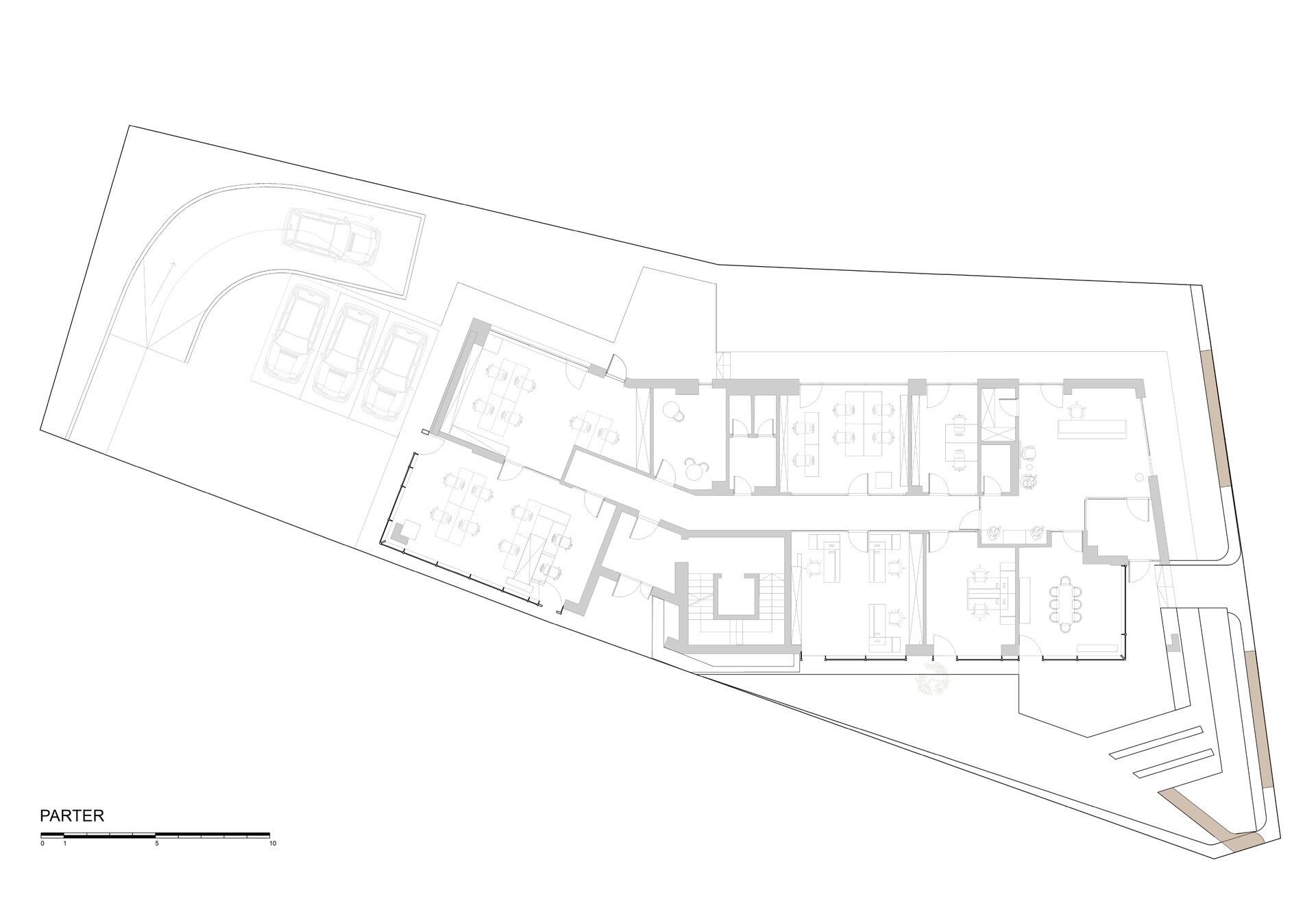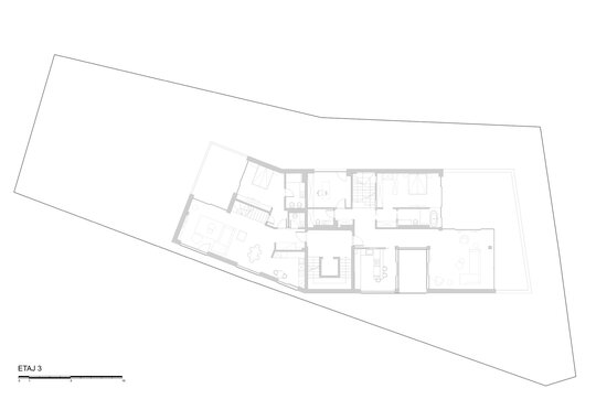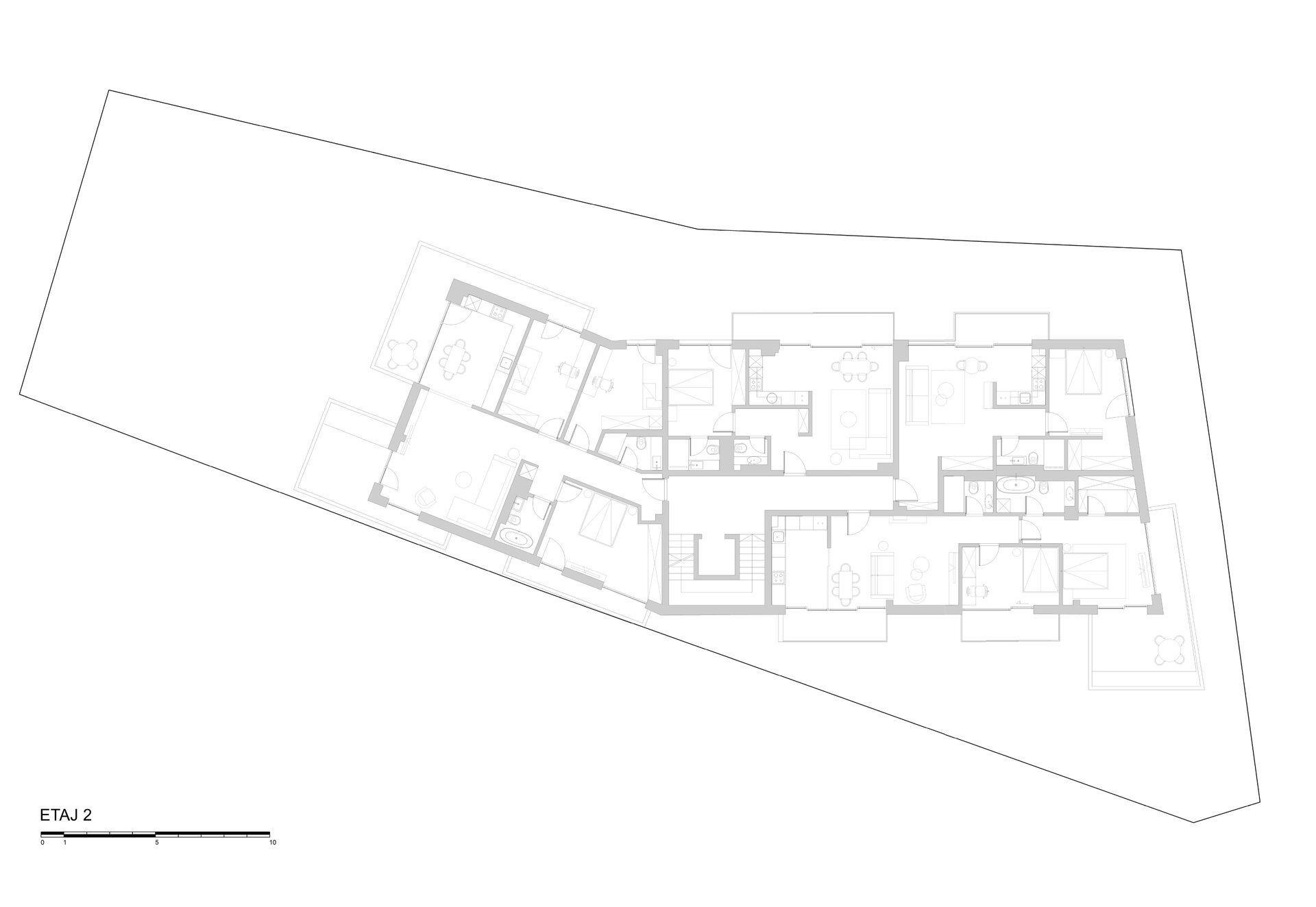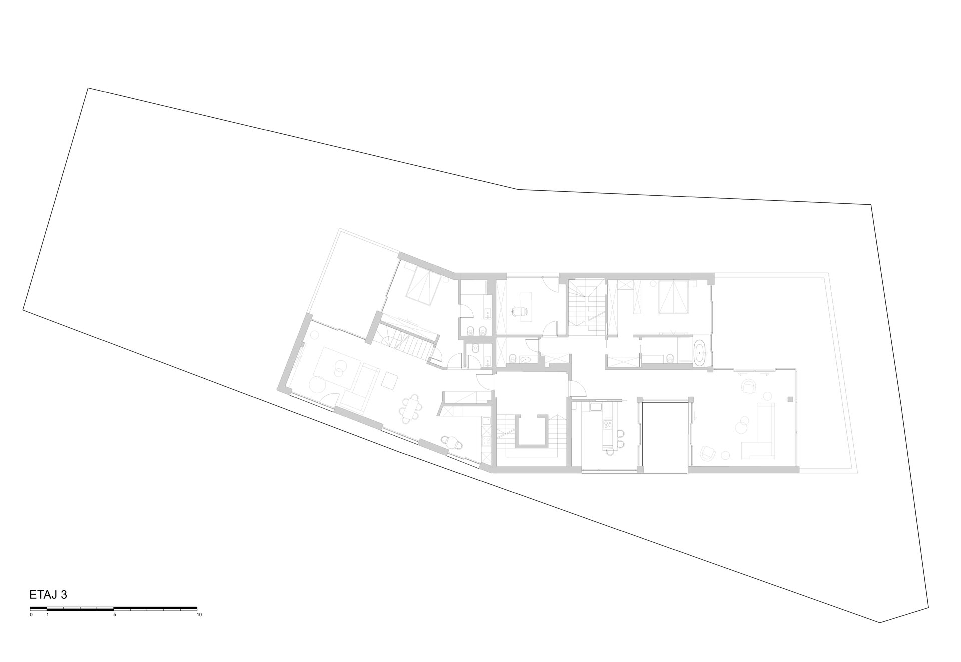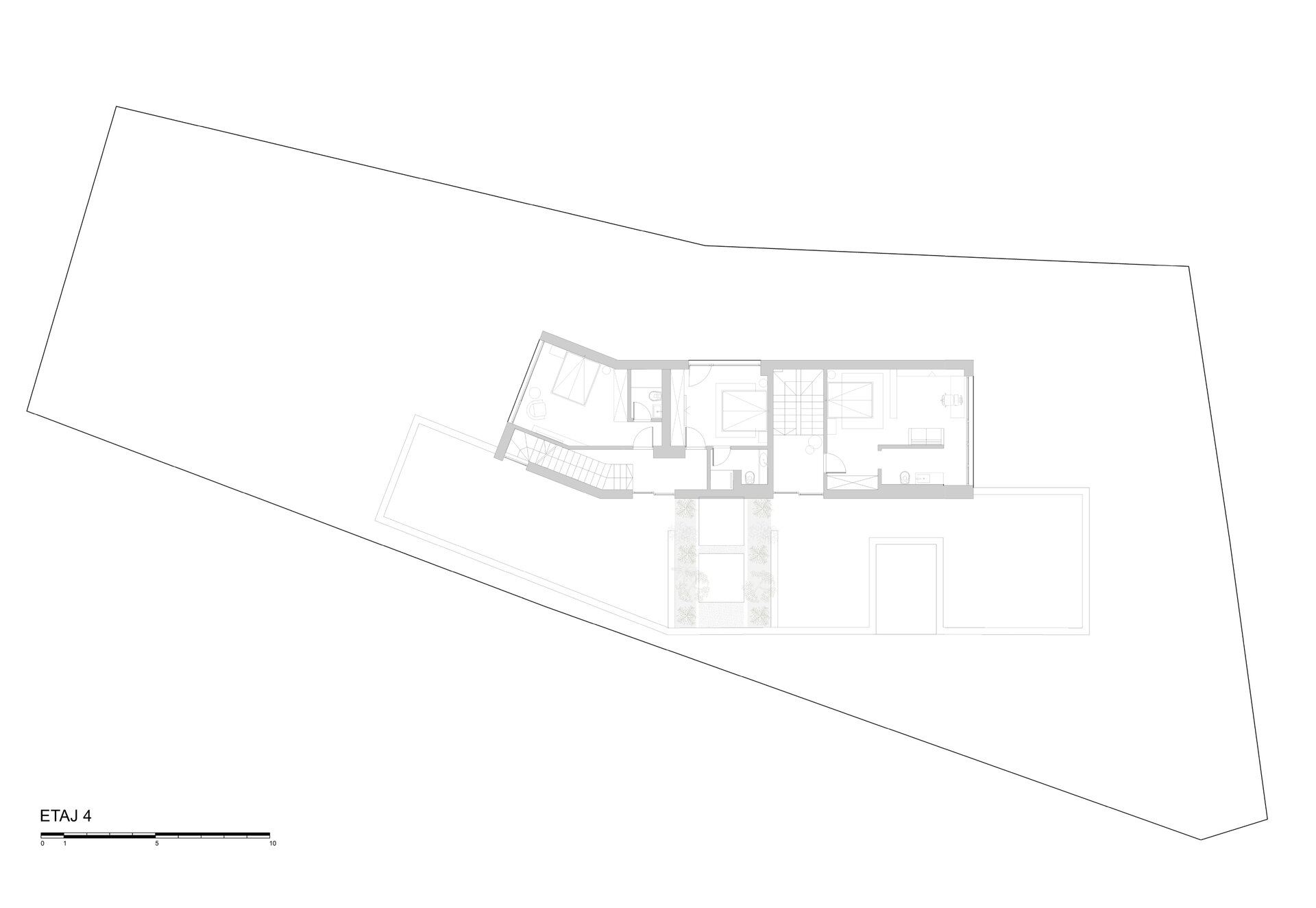 Programul de arhitectură convenit împreună cu beneficiarii acestui teren are în vedere 11 apartamente cu dotări superioare și un spațiu comercial la parter, pe o suprafață construită la sol de 370 mp și desfășurata totală de 1400 mp. Volumetria compactă se dezvoltă pe patru niveluri peste un subsol pe întreg perimetrul construibil, ultimele două etaje fiind parțiale și retrase, așa încât vederea dinspre intersecție să ofere cea mai bună relație cu scara generală a construcțiilor învecinate. Modelarea retragerilor în volumul general construibil permis de regulamentul zonei este foarte bine dozată și generează o bună varietate vizuală la nivelul percepției pietonale, atât de pe strada Cezar Bolliac (fațada lungă, vestică, cu accesul la apartamente), cât și de pe strada Theodor D. Speranția (fațada scurtă, sudică, cu accesul la birourile de la parter). Dificultatea proiectului a constat așadar în negocierea dintre modelarea volumetriei care răspunde cu succes constrângerilor contextuale și formularea unui program capabil să combine locuirea privată și diversificată cu funcțiunea publică. Apartamentele cu suprafețe utile generoase, terase mari, ferestre extinse și mai ales cu un design atent elaborat, peste nivelul ofertelor imobiliare obișnuite, poartă acum eticheta „boutique” care exprimă așteptări mult mai înalte din partea beneficiarilor la nivelul concepției de proiectare, dotărilor și calității de construcție. Primele două etaje grupează cinci apartamente diferite pe nivel, nodul de circulație verticală fiind în contact cu fațada vestică, în punctul în care volumul se „frânge” datorită conturului neregulat al terenului și colțului neconstruibil sud-vestic. Etajul al treilea se reduce progresiv prin modul extractiv al generării celor trei terase în volumetrie, iar etajul al patrulea reține doar un volum retras către fațada estică (cea mai puțin vizibilă) în care se continuă prin intermediul scărilor interioare private zona de noapte a celor mai mari două apartamente de la etajul trei. Suprafețele utile ale apartamentelor variază între 50-54 mp la două camere, 75-80 mp la trei camere pe un singur nivel și 135-162 mp la trei și patru camere pe dublu-nivel. Varietatea tipologică a apartamentelor și modul în care sunt configurate terasele scobite sau extinse în console foarte curajoase produc experiențe spațiale remarcabile între interiorul privat și exteriorul public. Cele două intrări de la parter și colțul sud-vestic în care se întâlnesc fațadele principale constituie locurile cele mai importante din punctul de vedere al percepției urbane, tratate cu multă grijă la nivelul îmbinărilor geometrice de planuri și al punerii în operă a materialelor de finisaj. Colțul sud-vestic nu a fost neglijat nici la nivelul amenajării peisagistice a terenului, astfel încât să participe împreună cu fațadele la interacțiunea pietonală permisă de funcțiunea publică a parterului. Subsolul asigură accesul auto printr-o rampă pentru 17 autoturisme și spațiul necesar pentru funcțiunile tehnice. Parterul, ocupat integral de spațiul de birouri și de micul hol de intrare cu nodul vertical de circulație pentru apartamentele de la etaj, profită de avantajul expunerii perimetrale către curtea care marchează inelar terenul, configurată în urma retragerilor urbanistice. Accentul principal cade pe zona intrării la birouri, expusă către intersecție, bine modelată prin retragerea peretelui vitrat și prin extinderea îndrăzneață în consolă a terasei de la etaj. Tratamentul sculptural al volumetriei, care continuă la fel de dinamic și la celelalte etaje prin retragerile și avansările teraselor, răspunde dorinței beneficiarilor de a pune în valoare funcțiunea publică a parterului și imaginea caracteristică a unui bloc-boutique, capabile să transmită caracterul adecvat al arhitecturii într-o zonă încărcată cu memorie istorică.