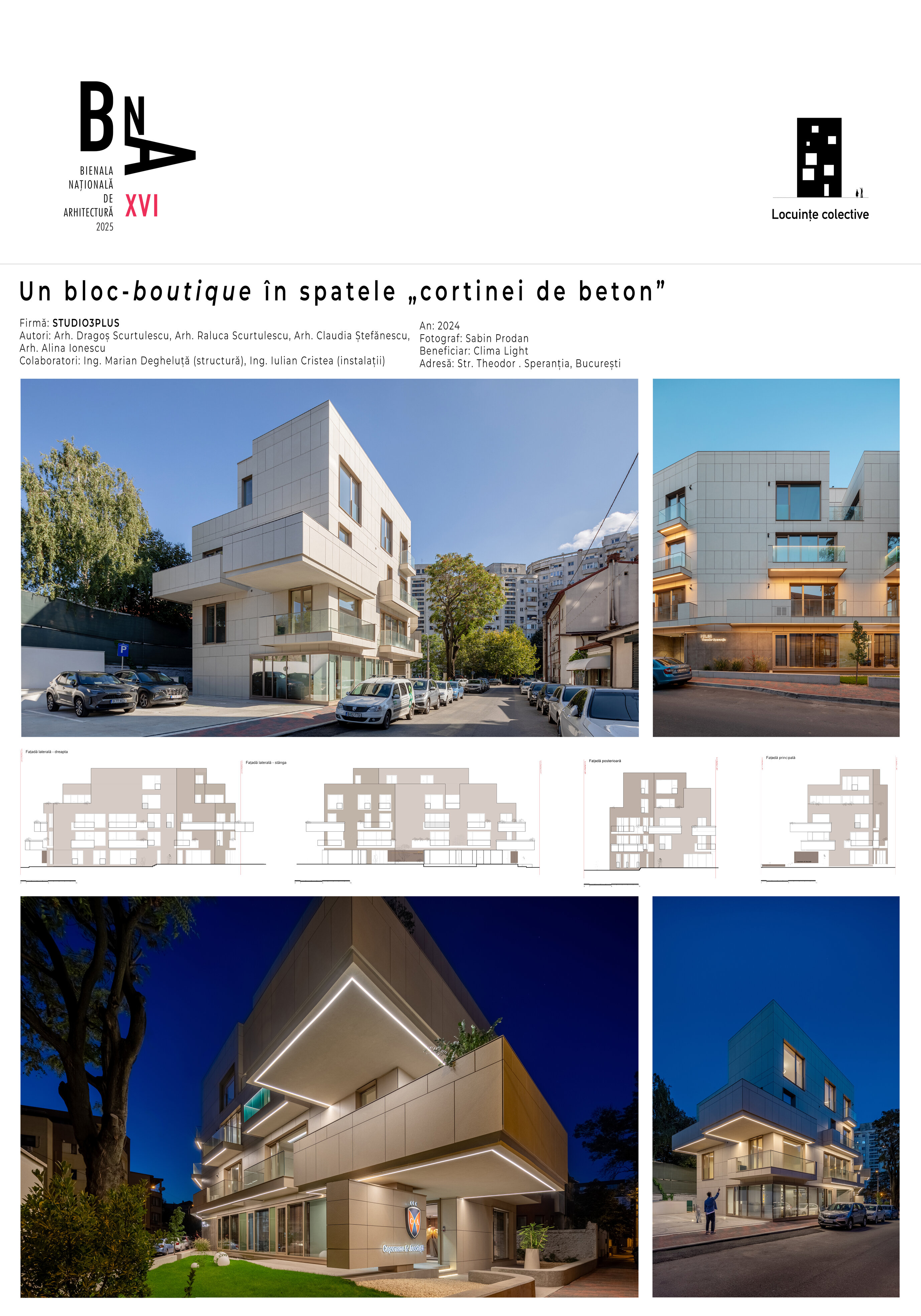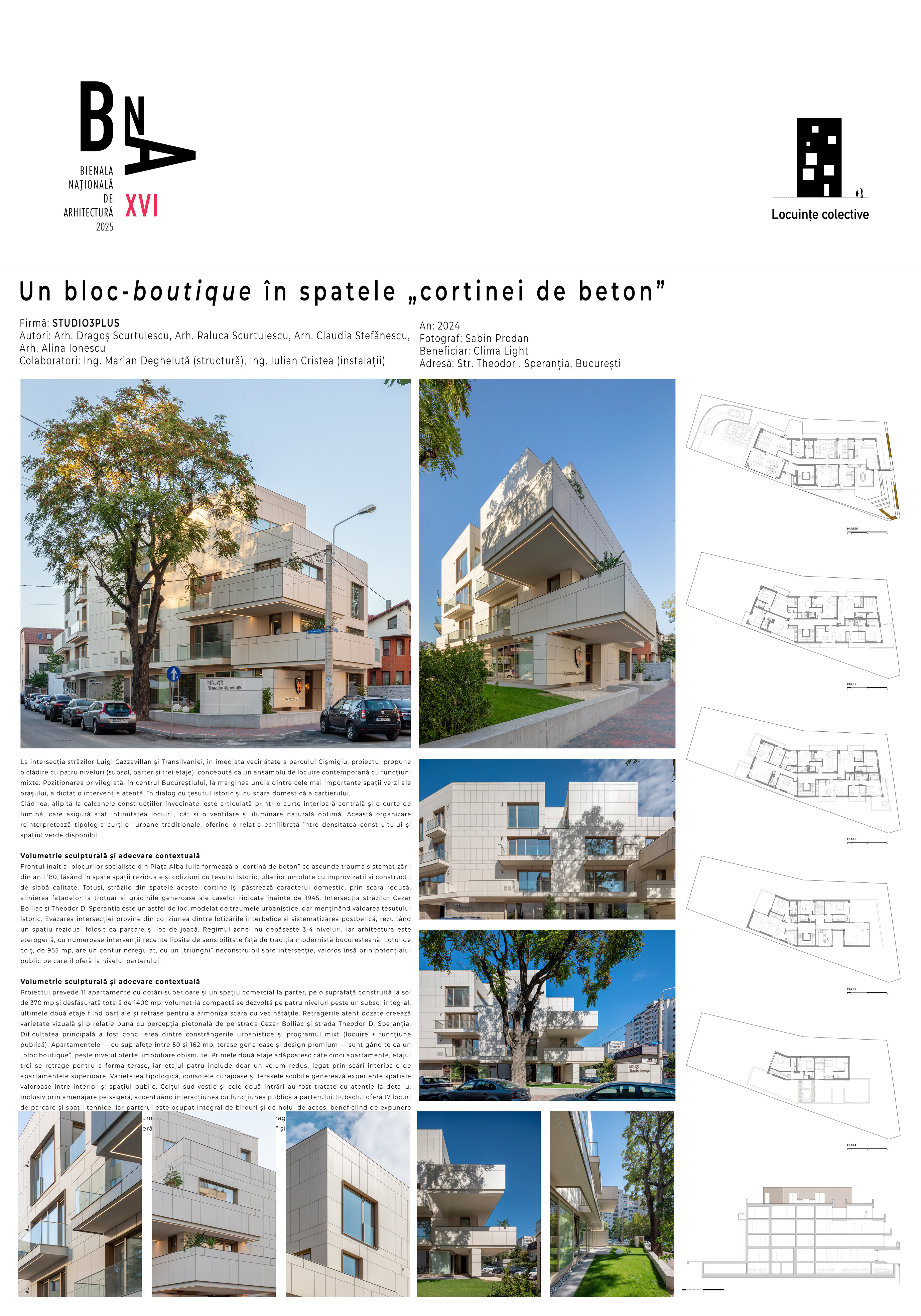 La intersecția străzilor Cezar Bolliac și Theodor D. Speranția din București, în spatele frontului nordic de blocuri socialiste al Pieței Alba Iulia, pe un teren de 955 mp cu dublă deschidere, într-un context eterogen dominat de locuințe de joasă și medie înălțime construite în perioada interbelică, cu multe adăugări recente, biroul studio3plus a realizat un bloc de patru etaje, cu 11 apartamente de calitate superioară, cu design interior inclus, cu terase foarte generoase și cu un parter transparent, dedicat integral unui birou pentru o echipă de executori judecătorești, în holul căruia sunt expuse trei sculpturi inedite ale artiștilor Ileana și Cătălin Oancea.