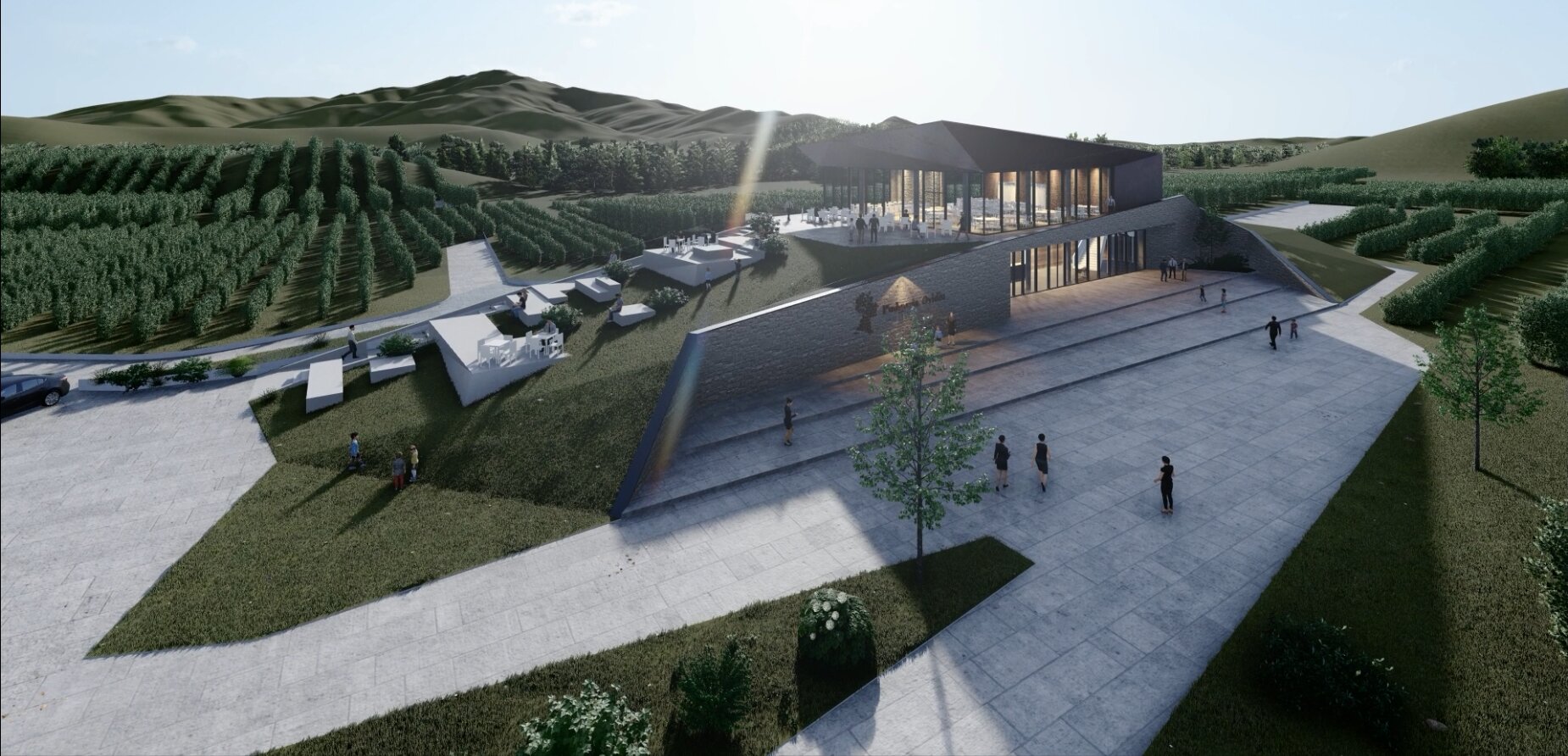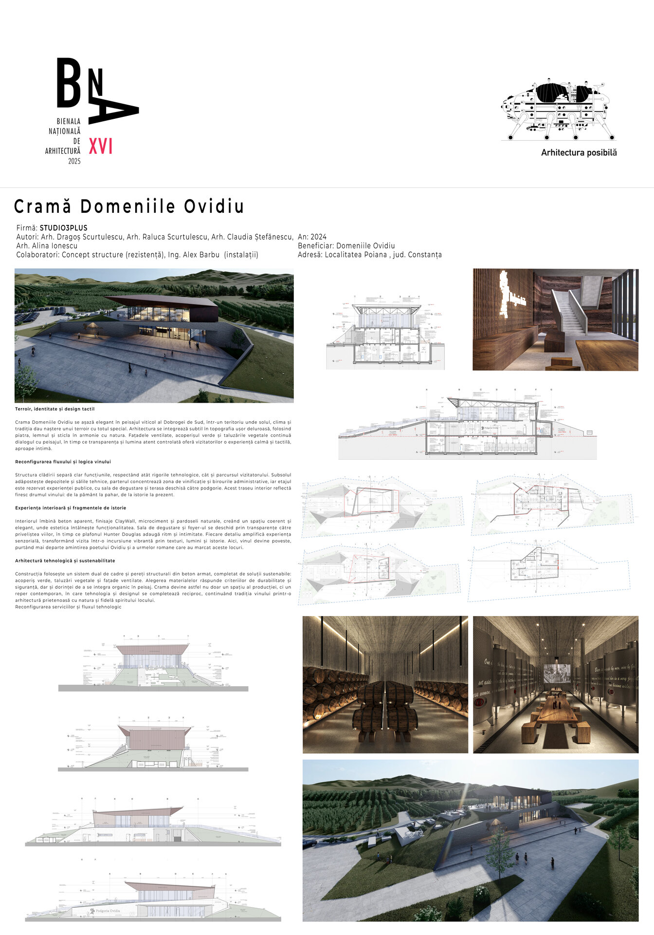 Clădirea se integrează armonios în topografia podgoriei Dobrogei de Sud, iar acoperișul vegetal și taluzările vegetale ajută la menținerea unei temperaturi controlate în interior. Terasa și sala de degustare oferă priveliști panoramice asupra viilor, în timp ce materialele naturale și lumina atent dozată creează un ambient intim și elegant, punând în valoare atât vinul, cât și moștenirea culturală a zonei. Fluxul vizitatorului se desfășoară ca o poveste coerentă, de la strugure la vin, de la pământ la pahar, iar experiența este completată de atenția la detalii și calitatea spațiului.