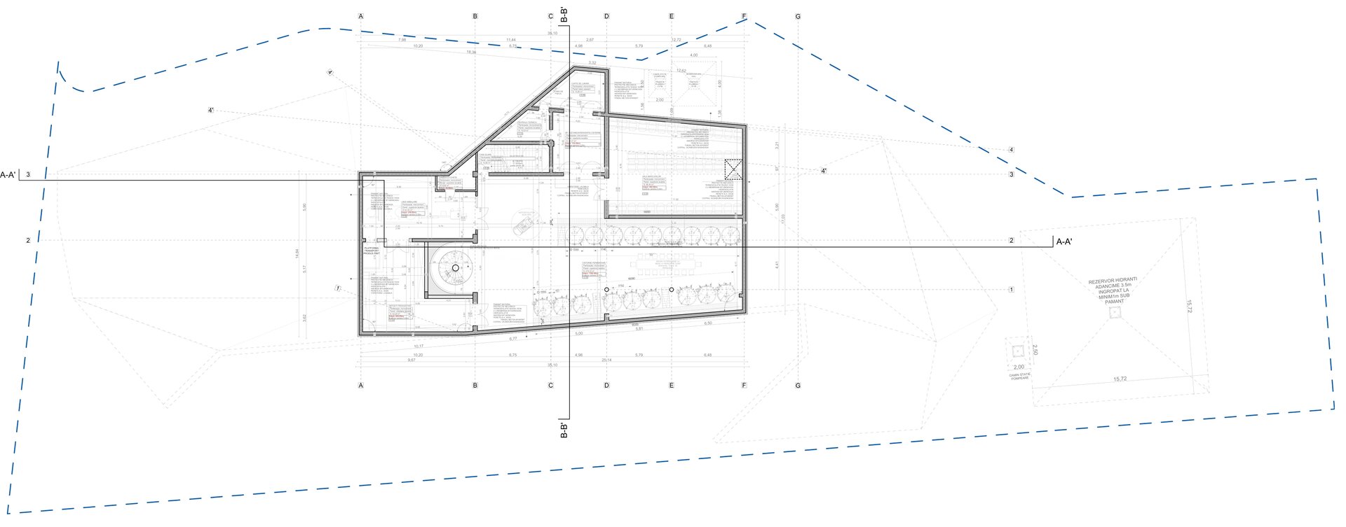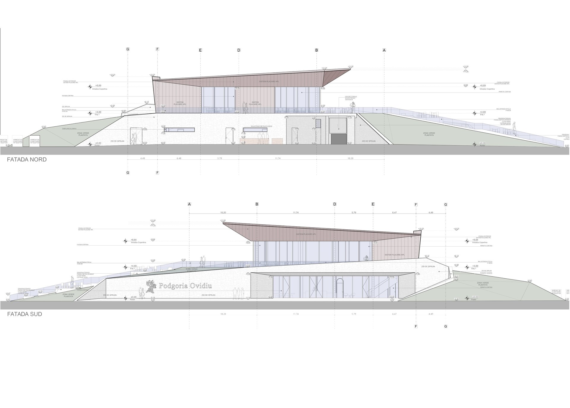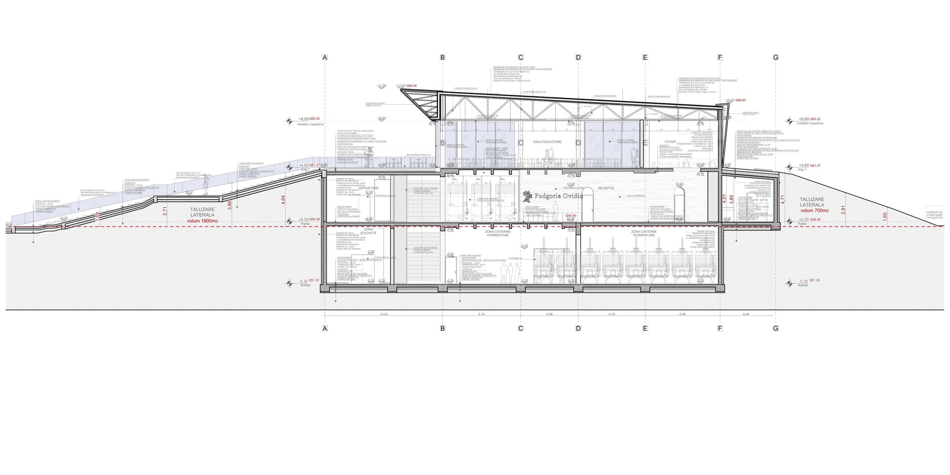 Construcția folosește un sistem dual de cadre și pereți structurali din beton armat, completat de soluții sustenabile: acoperiș verde, taluzări vegetale și fațade ventilate, pentru eficiență energetică și durabilitate. Materialele au fost alese pentru longevitate, rezistență la foc și integrare estetică, respectând normele PSI și de protecția muncii. Tehnologia și designul se completează reciproc, creând o cramă modernă, funcțională, prietenoasă cu mediul și fidelă spiritului locului.