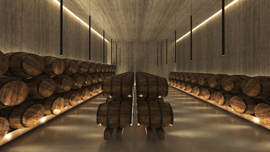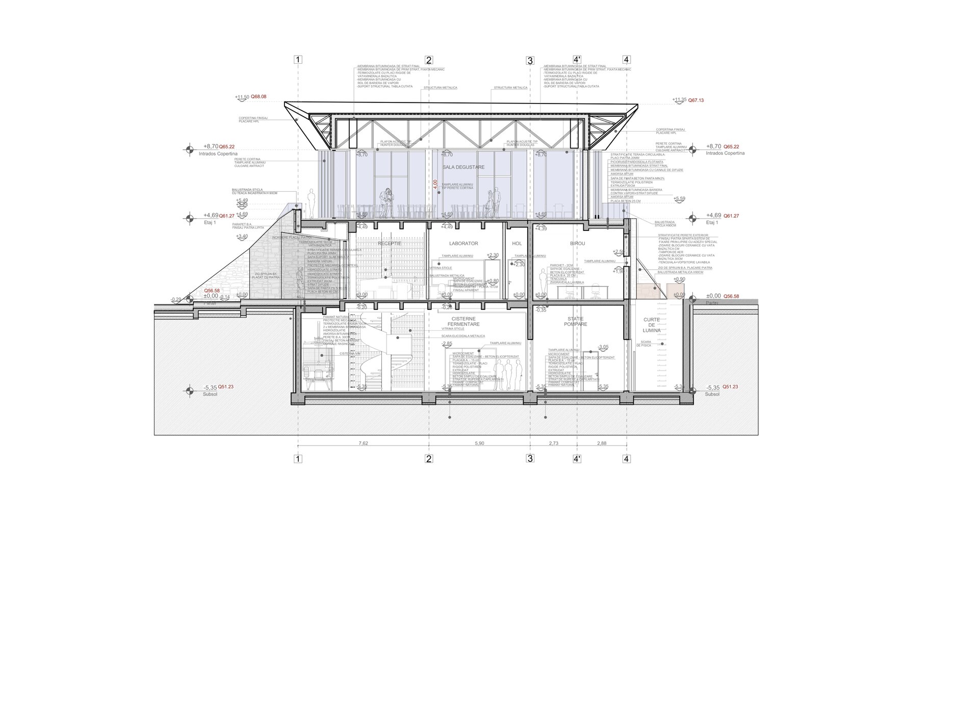 Structura cramei reflectă logica procesului viticol, separând clar zonele de producție de cele dedicate vizitatorilor. Subsolul adăpostește depozitele, sălile tehnice și spațiile pentru baricuri și cisternele de fermentare, asigurând un flux tehnologic sigur și eficient. Parterul concentrează zona de vinificație, birourile administrative și recepția materiilor prime, în timp ce etajul este destinat experienței vizitatorilor, cu sala de degustare și terasa orientată către podgorie. Accesul publicului este complet separat de fluxurile tehnologice, astfel încât vizita devine o experiență intuitivă și confortabilă, fără interferențe, punând în valoare atât vinul, cât și arhitectura clădirii.