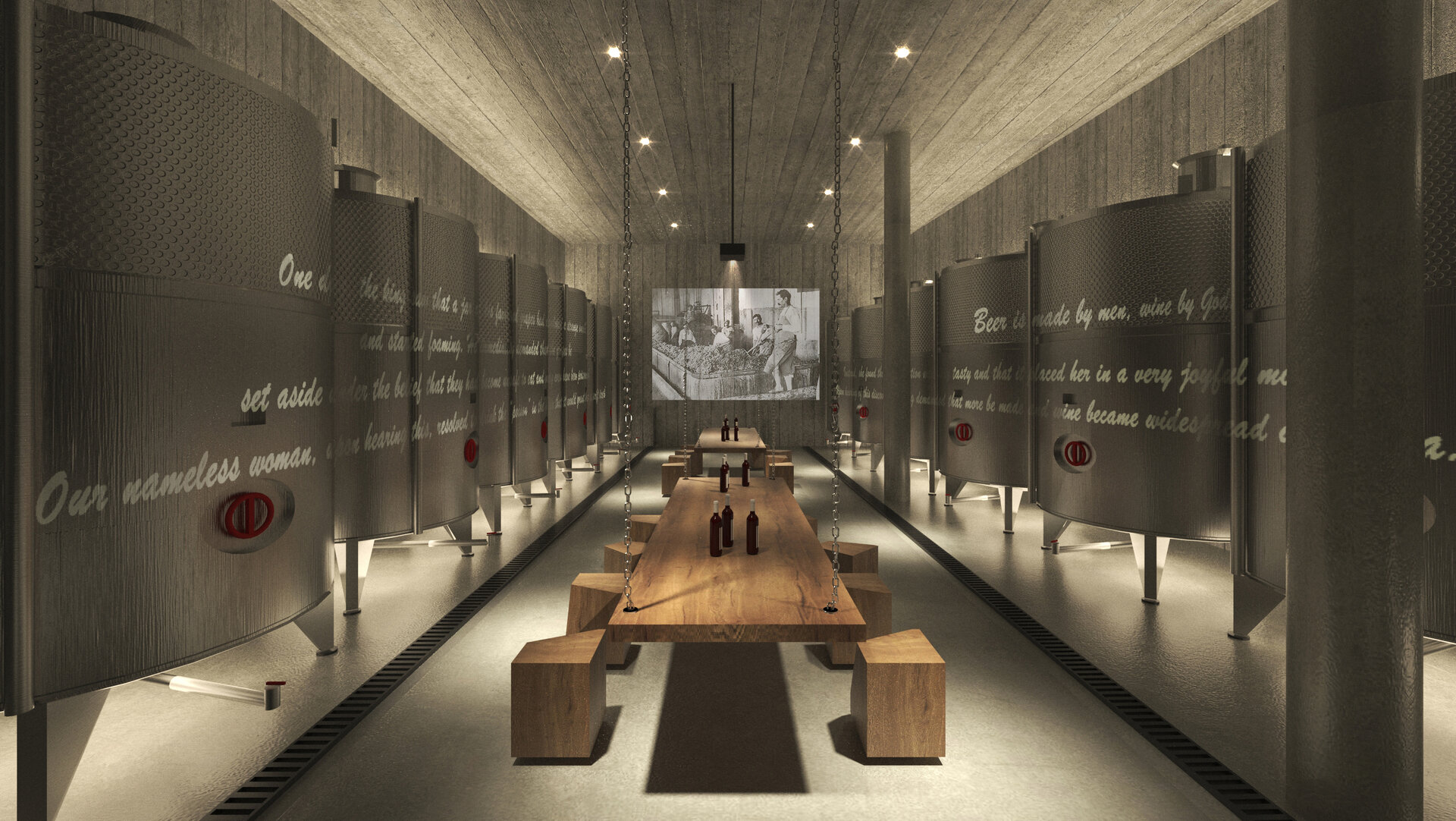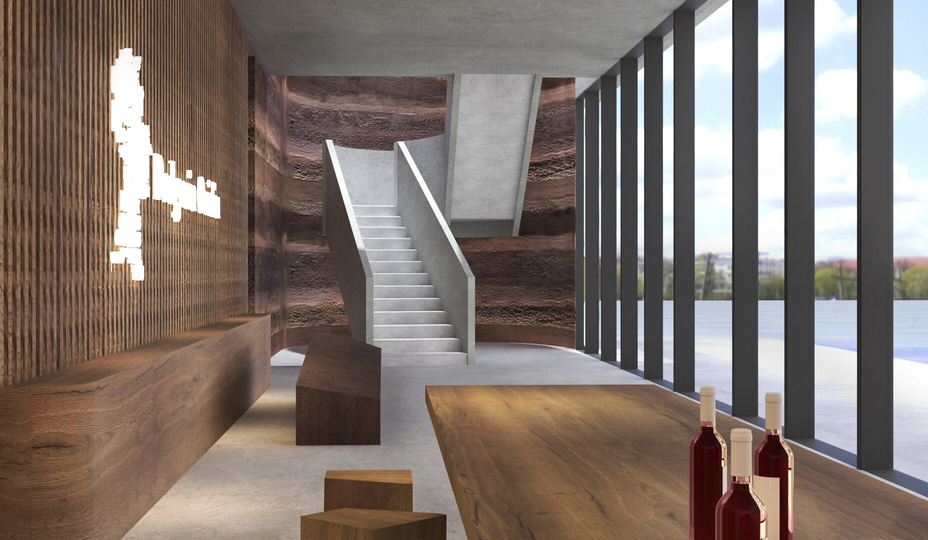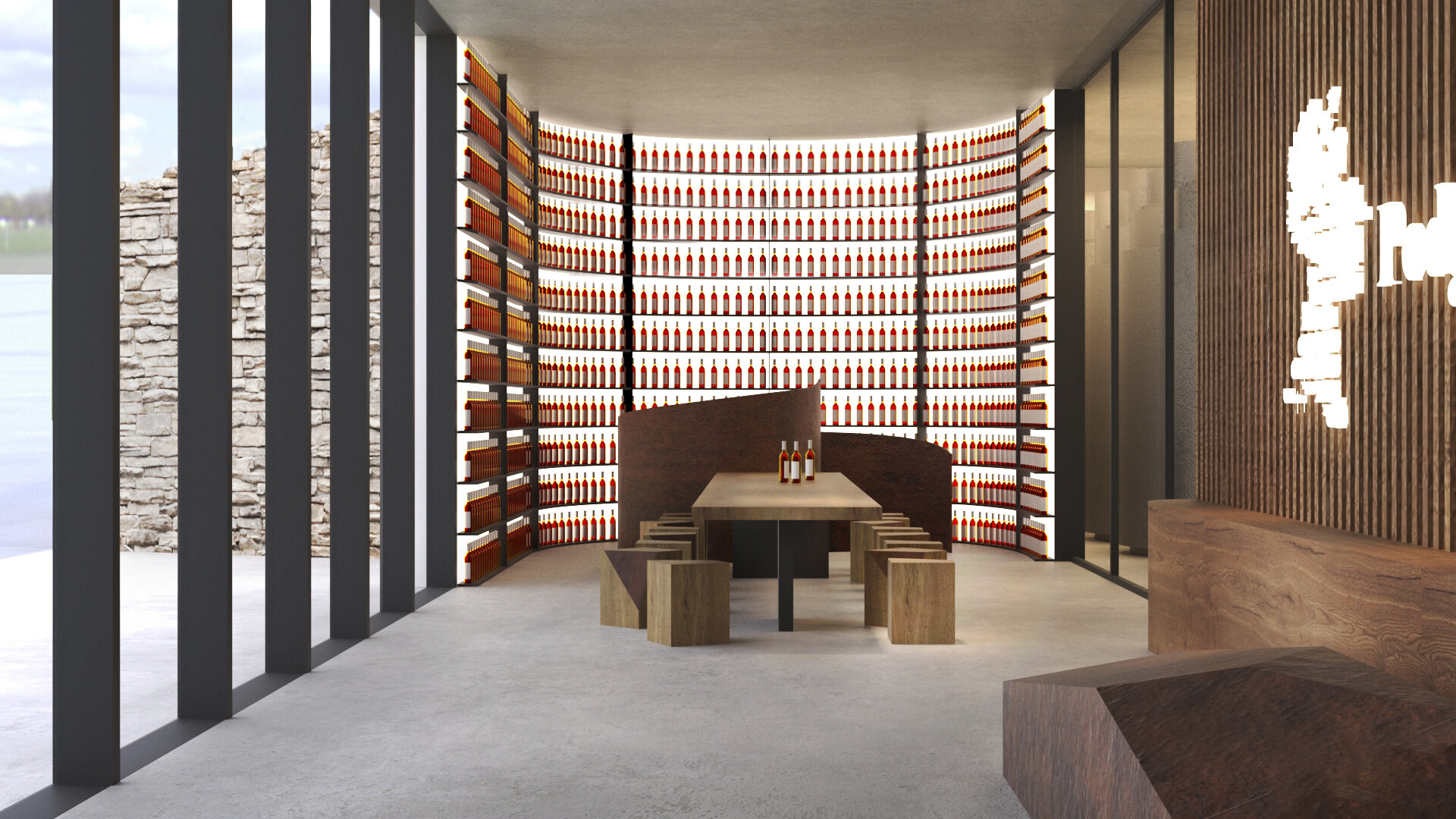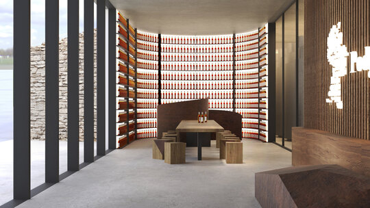 Interiorul cramei combină beton aparent, finisaje ClayWall, microciment și pardoseli naturale, creând spații coerente, elegante și tactile. Sala de degustare și foyer-ul se deschid către priveliștea viilor, în timp ce plafonul Hunter Douglas imprimă ritm și intimitate. Fiecare detaliu interior – de la texturile materiale, la lumina controlată și transparența spațiilor – amplifică experiența senzorială a vizitatorilor, transformând vizita într-o incursiune vibrantă prin istoria și terroir-ul podgoriei. Vinul adună în el fragmente de memorie: urmele soldaților romani care apărau apeductul Tomisului, legenda poetului Ovidiu și tradiția milenară a locului, toate integrate subtil în fiecare pahar și în fiecare spațiu.