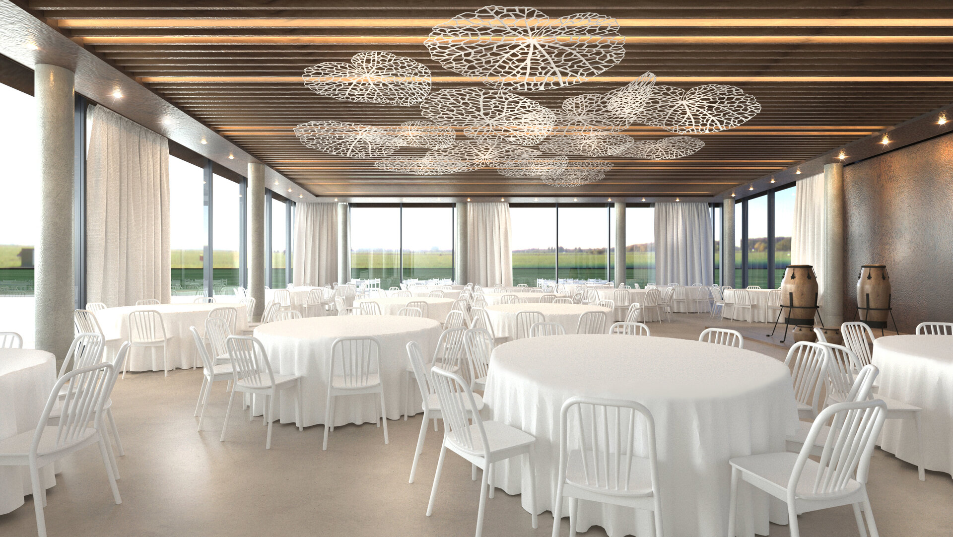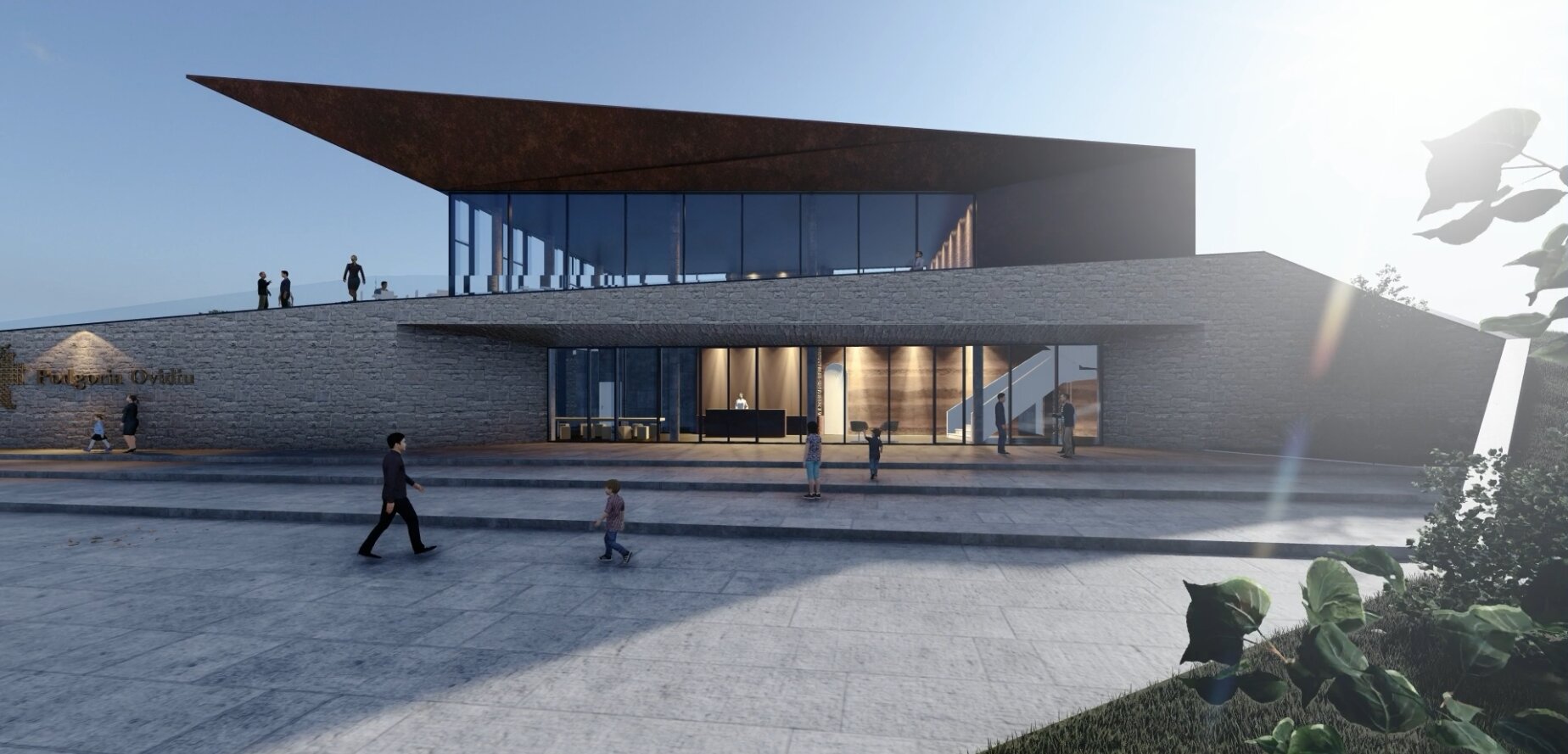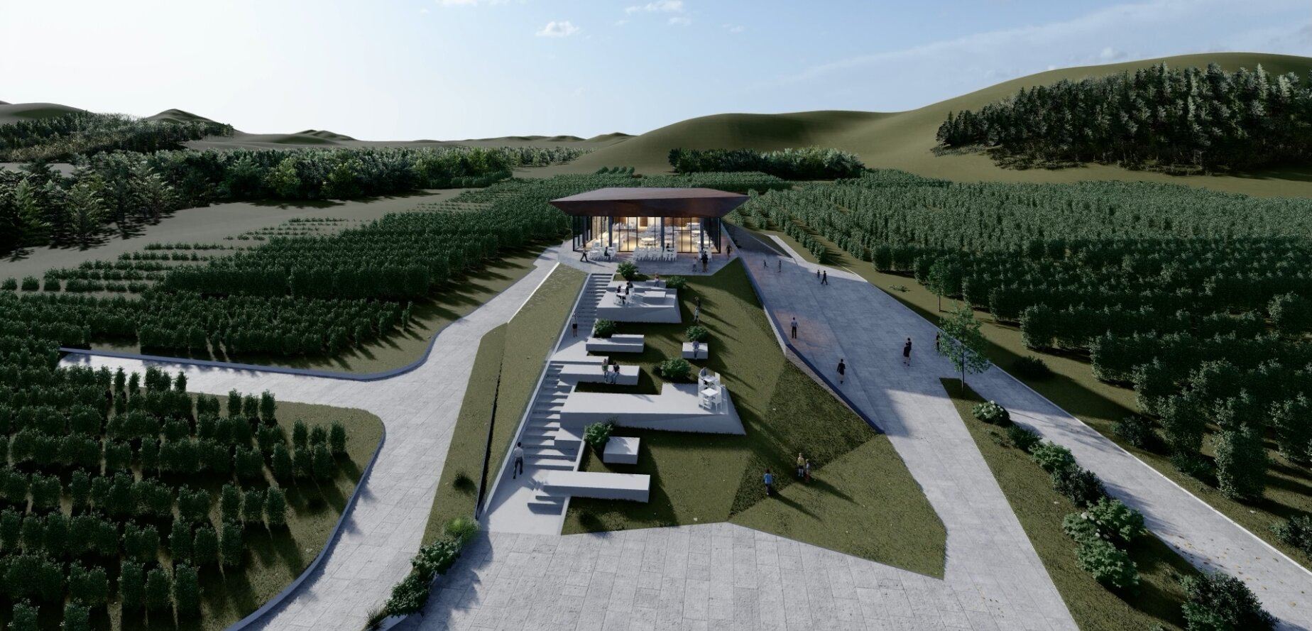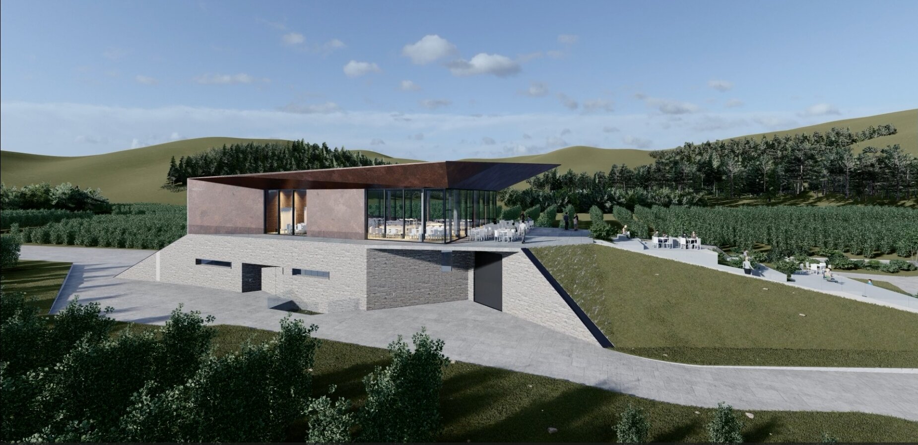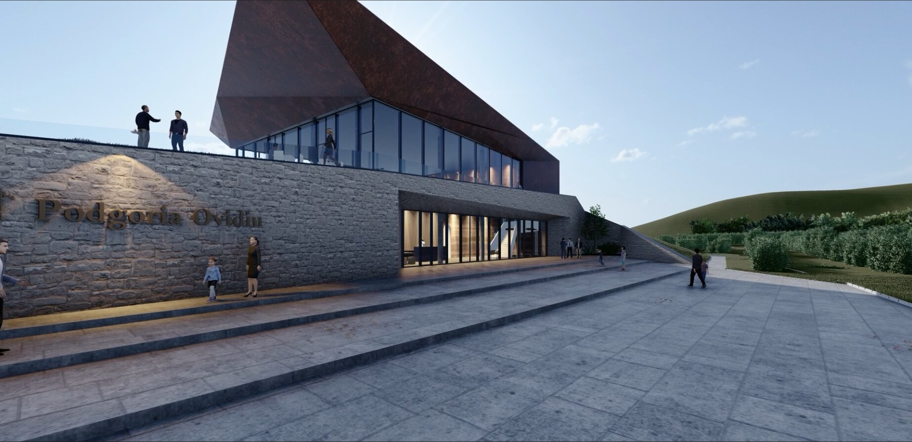 Crama Domeniile Ovidiu se așază cu discreție și eleganță în peisajul viticol al Dobrogei de Sud, într-un teritoriu unde solul fertil, clima blândă și tradiția viticolă dau naștere unui terroir unic. Arhitectura clădirii dialoghează subtil cu topografia ușor deluroasă, folosind piatra, lemnul și sticla ca materiale care armonizează construcția cu natura. Fațadele ventilate, acoperișul verde și taluzările vegetale extind continuitatea între clădire și peisaj, în timp ce transparența atent controlată și lumina naturală creează vizitatorilor o experiență calmă, tactilă și aproape intimă, pregătindu-i pentru întâlnirea cu vinul și povestea sa.