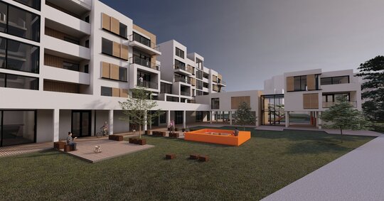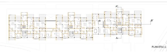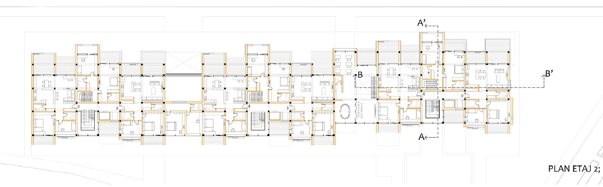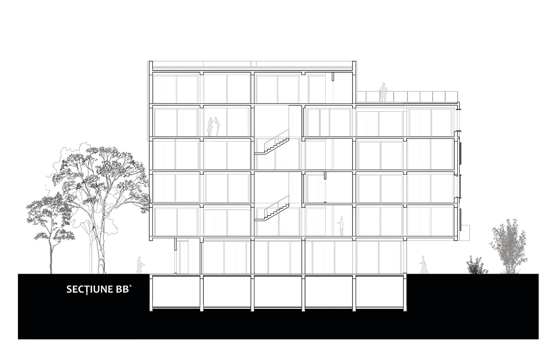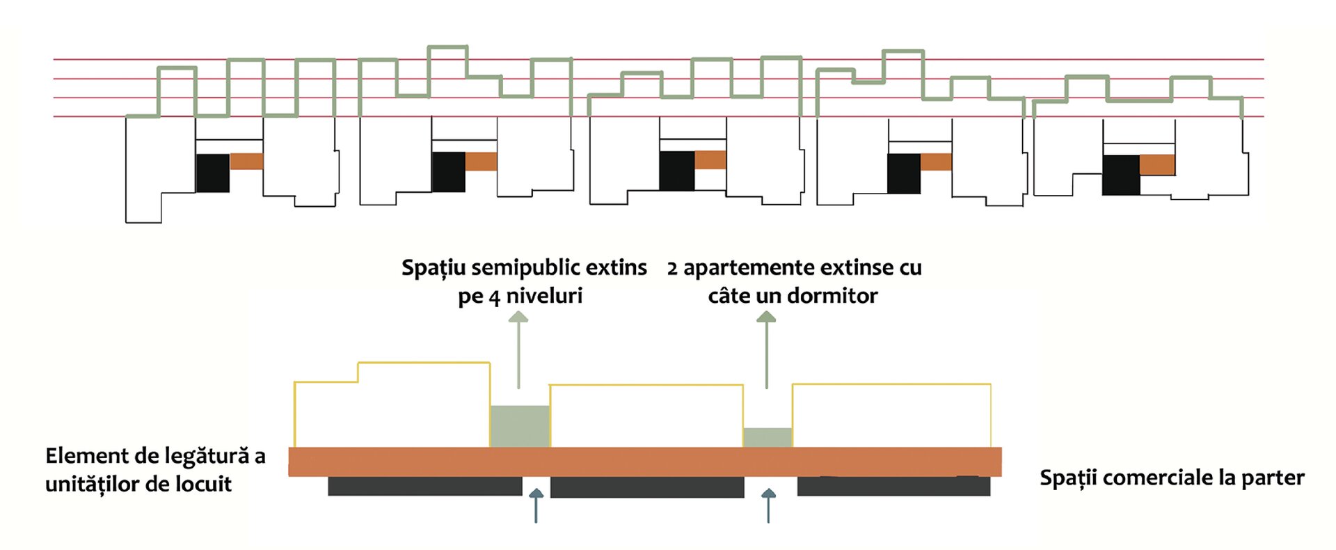 Cele trei corpuri sunt legate și pe verticală printr-un spațiu public desfășurat pe patru niveluri, precum și prin apartamente extinse cu încă o cameră, ce aduc diversitate tipologică. Pentru a conserva cât mai mult teren verde la nivelul solului, parcarea a fost amplasată în totalitate la subsol, fiecare unitate de locuit beneficiind de cel puțin un loc de parcare.