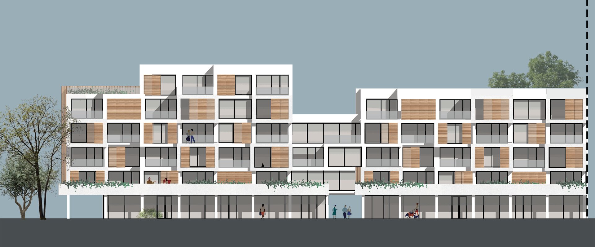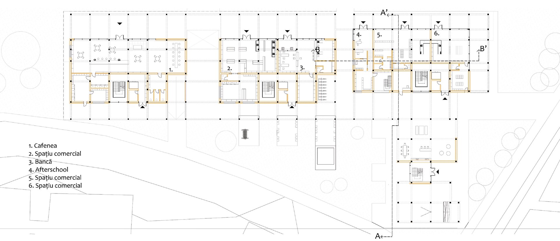 La nivelul parterului, ansamblul este susținut de o serie de spații comerciale dispuse de-a lungul unui portic, separate de stradă printr-o fâșie verde menită să creeze o tranziție plăcută între spațiul public și cel construit. Elementul orizontal care unește volumele este gândit ca o pasarelă verde, plantată și ritmată de terase placate cu lemn, ce accentuează caracterul natural al proiectului. Jocul de retrageri și extensii pe fațadă a fost realizat în raport cu trei axe paralele de referință, generând dinamism și diversitate spațială.