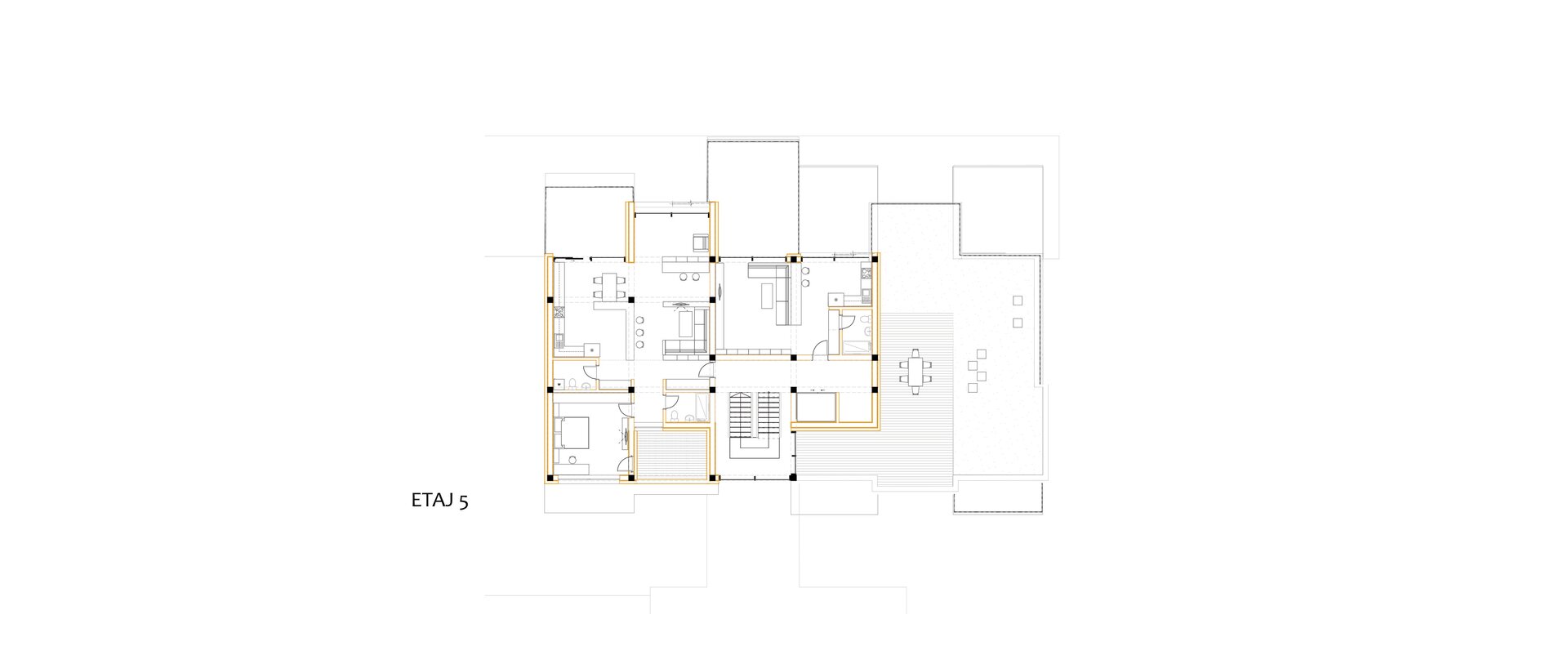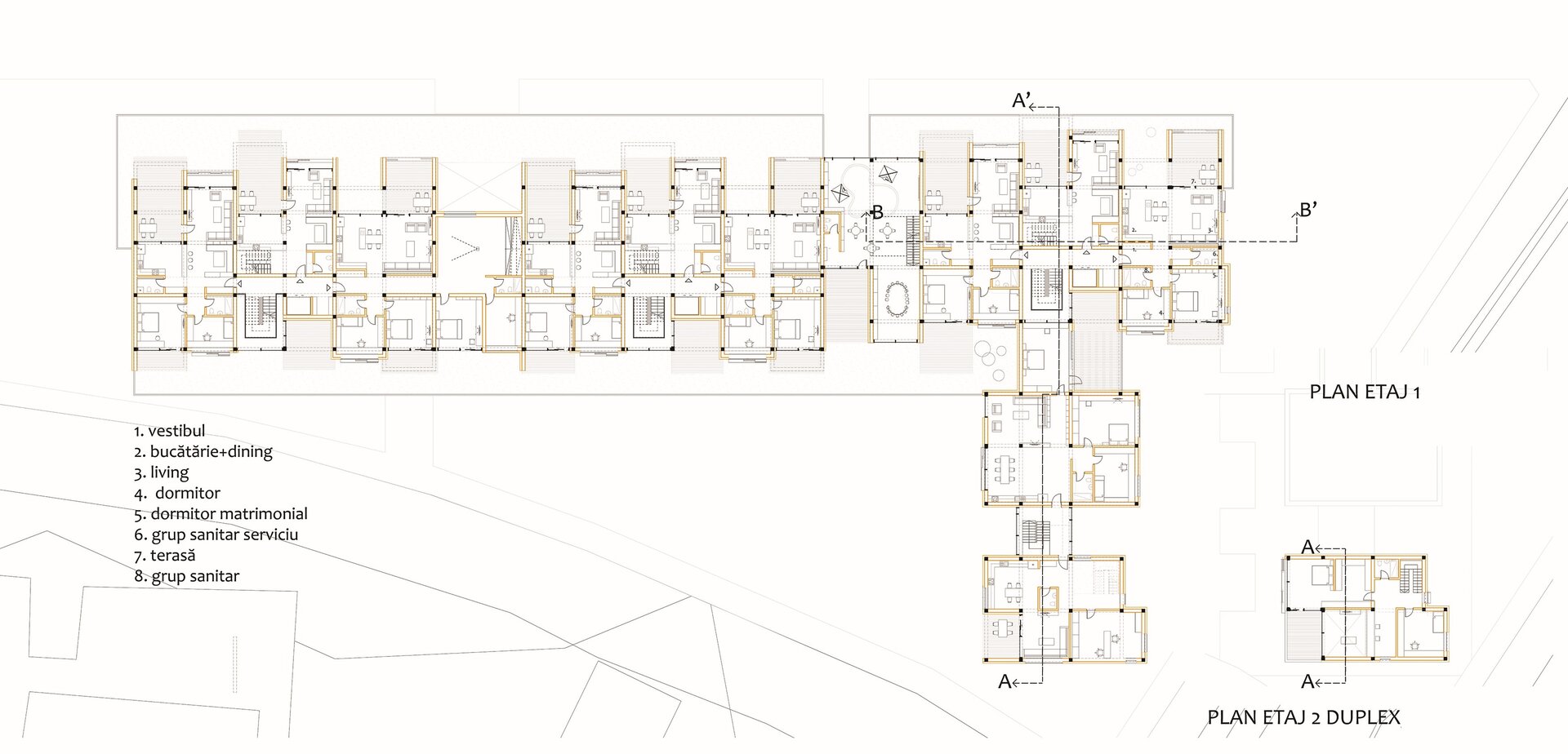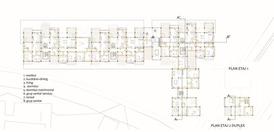 Organizarea interioară a apartamentelor urmează aceleași principii. La etajul 1 se află două apartamente și zona de zi a unui duplex desfășurat pe două niveluri. Dormitoarele locuințelor pe un singur nivel sunt orientate către curtea interioară privată a ansamblului, pentru a oferi liniște și intimitate. Fiecare apartament beneficiază de toate funcțiunile necesare, dar este unic prin amplasarea și dimensiunea teraselor verzi. La ultimul nivel se regăsesc un apartament simplu și o garsonieră, ambele conectate direct la terasa comună a ansamblului, gândită ca un spațiu de socializare și coeziune pentru întreaga comunitate.