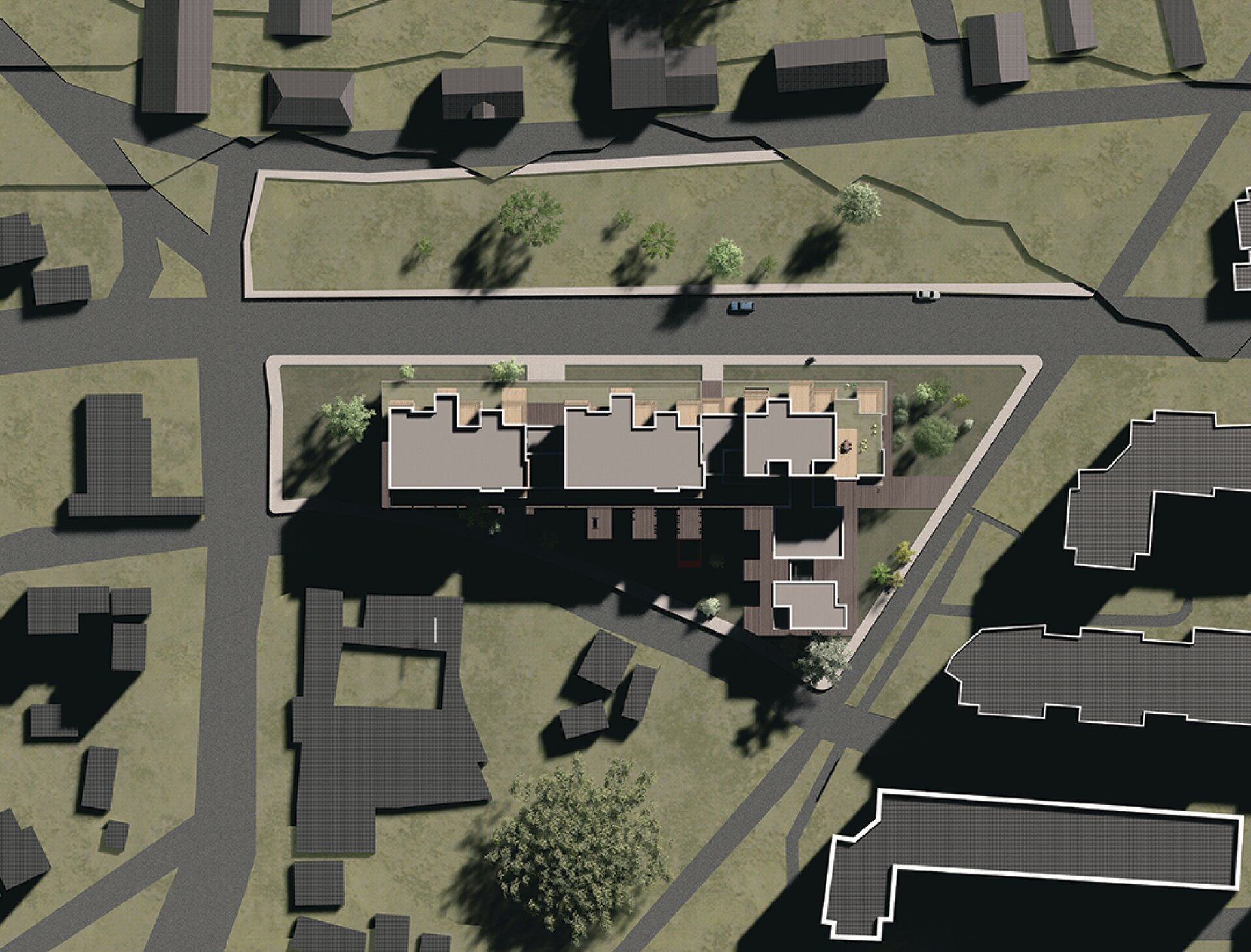 Din punct de vedere urbanistic, situl analizat se prezenta fragmentat, fără un ritm sau o regulă clară care să-i confere identitate și atmosferă. Singurul element cert era aliniamentul stradal, marcat de frontul continuu al locuințelor colective de pe bulevardul Tudor Vladimirescu. Pornind de la această observație, am conceput un ansamblu format din trei corpuri principale, unite printr-un element de legătură care asigură atât continuitatea frontului, cât și un volum dinamic, adaptat contextului.