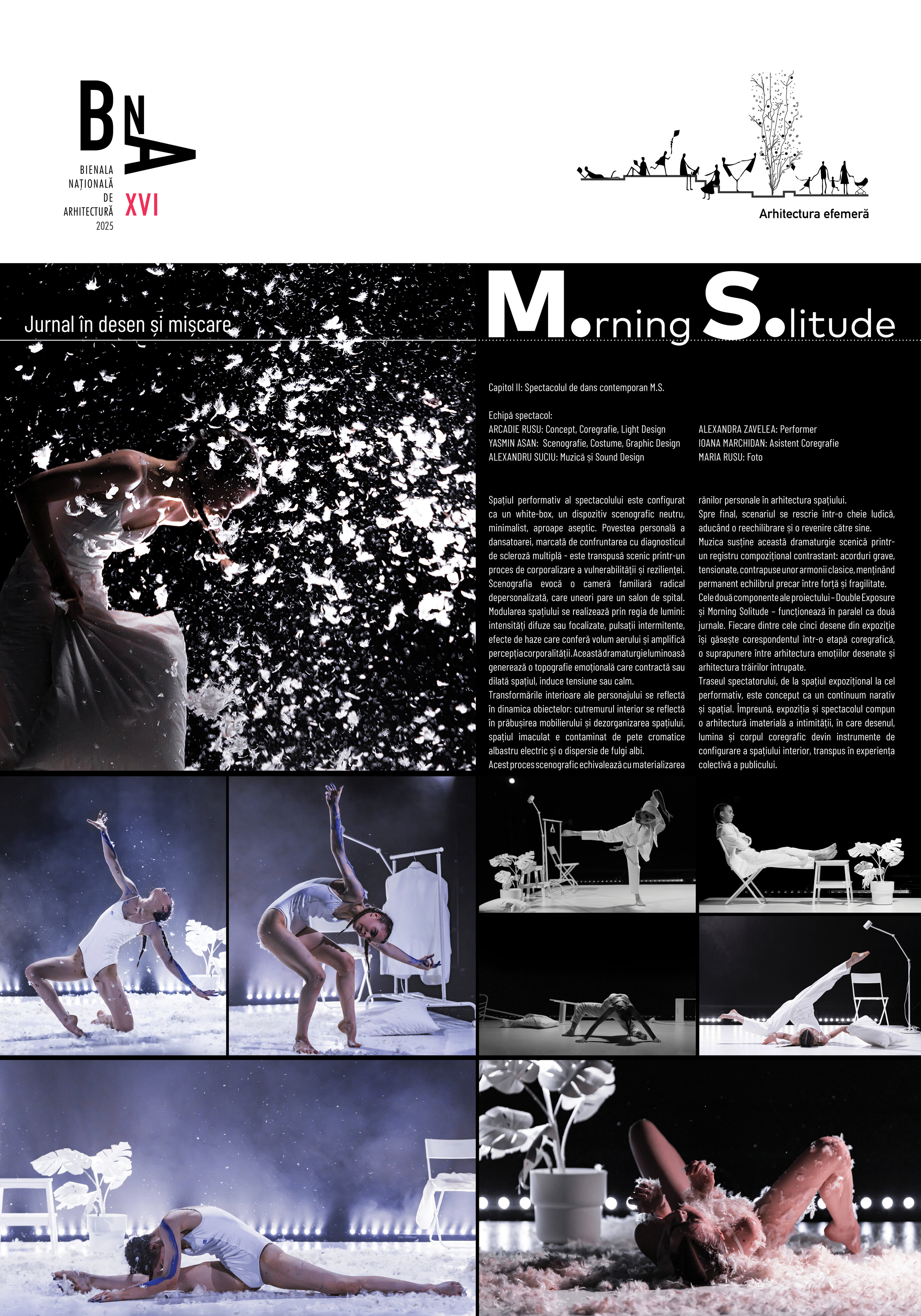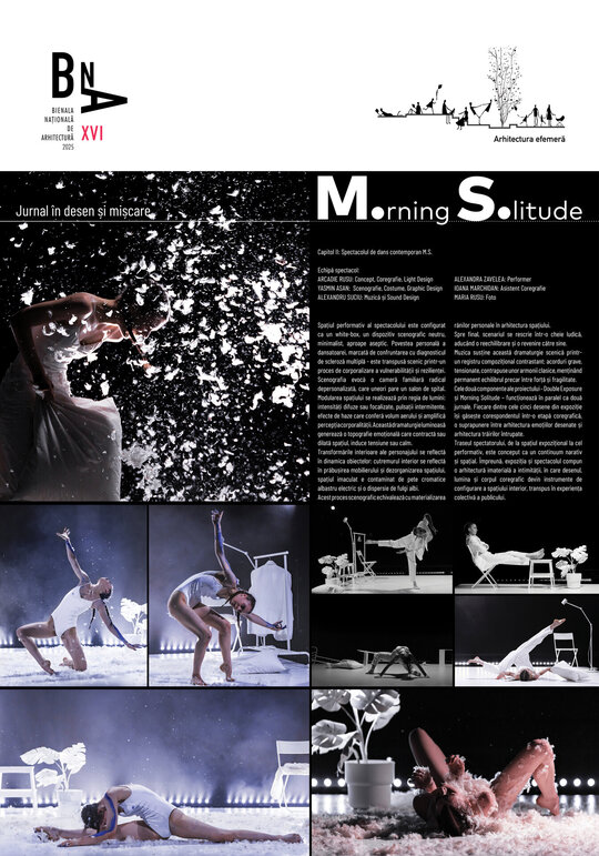 Din expoziție, spectatorul este invitat să pășească mai departe către spectacolul Morning Solitude. Într-o regie coregrafică ce reia stările din desene, povestea Alexandrei se desfășoară ca un jurnal în mișcare, traversând tensiunea, fragilitatea și, în final, ajungând la liniștea și puterea interioară de a continua.