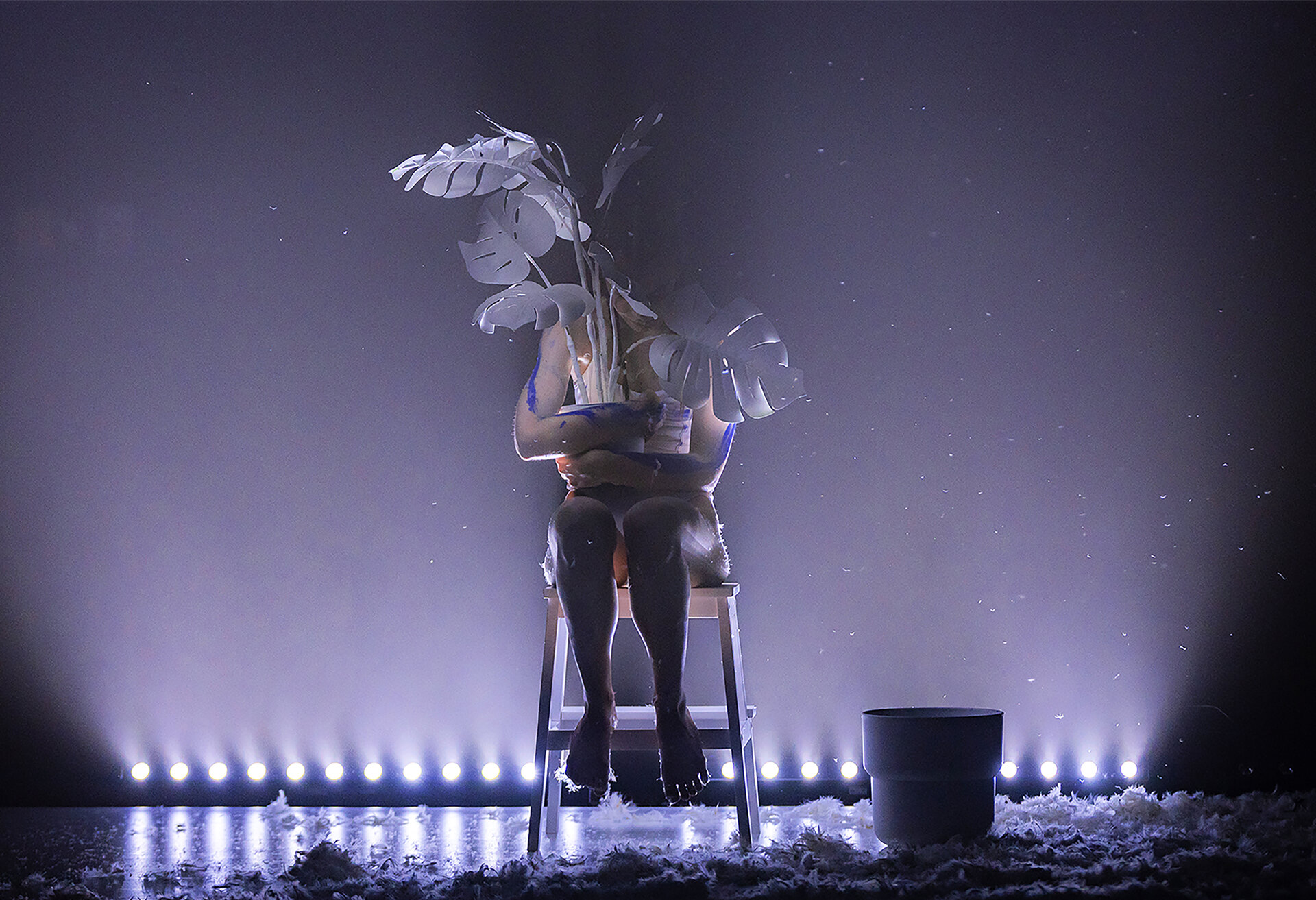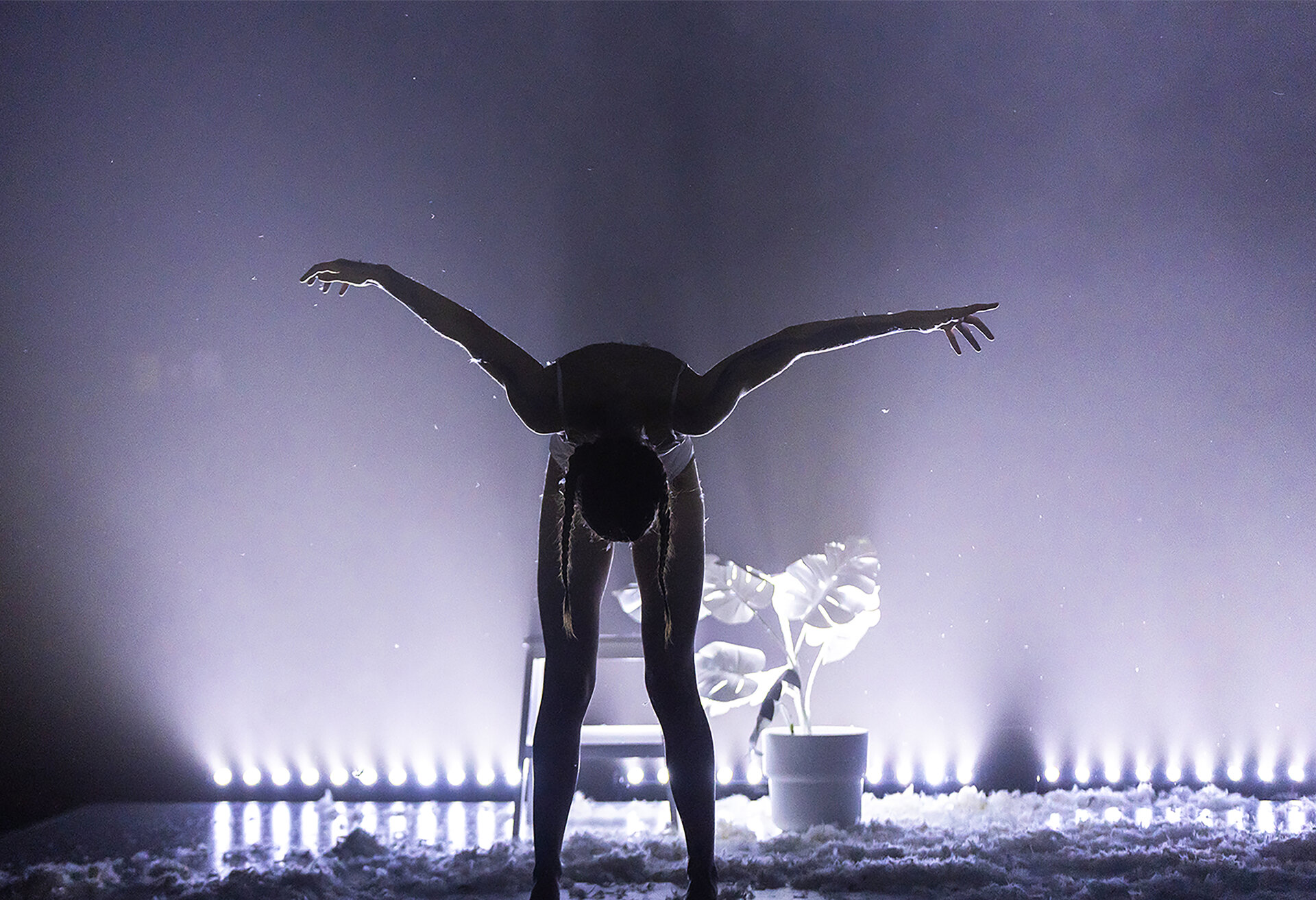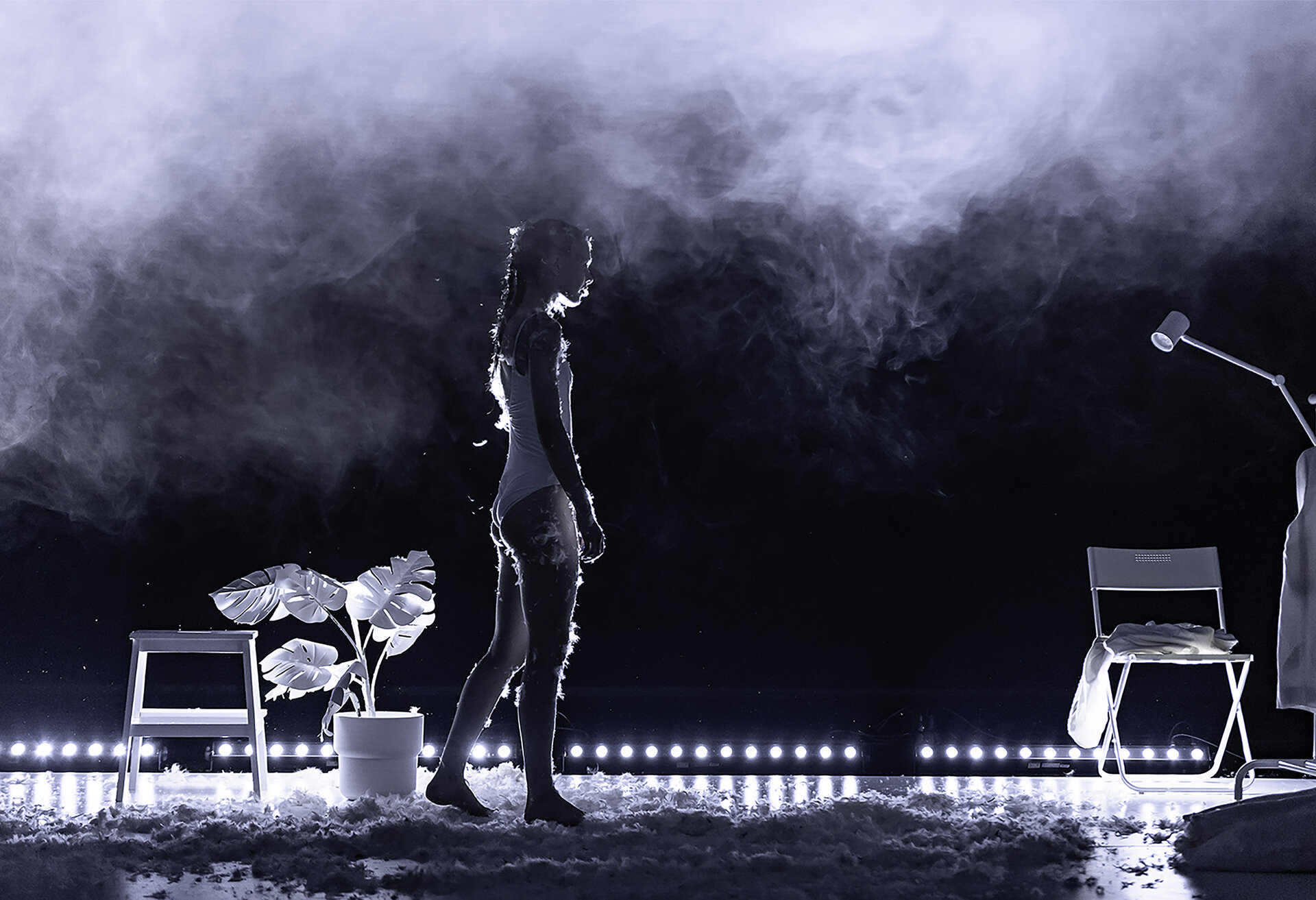 Modularea spațiului se realizează prin regia de lumini: intensități difuze sau focalizate, pulsații intermitente, efecte de haze care conferă volum aerului și amplifică percepția corporalității.