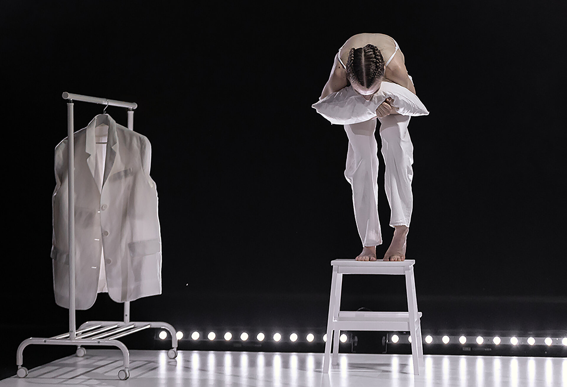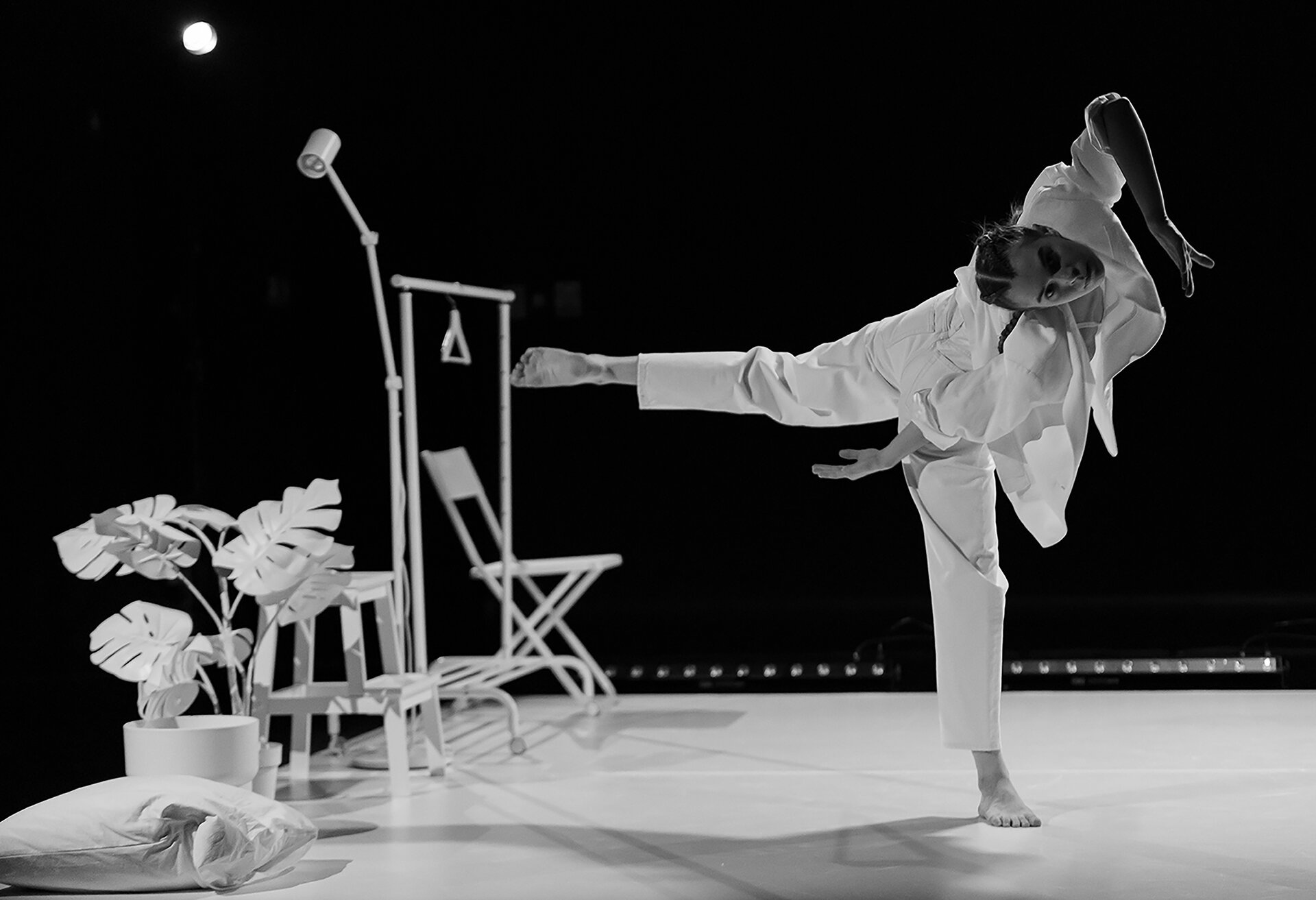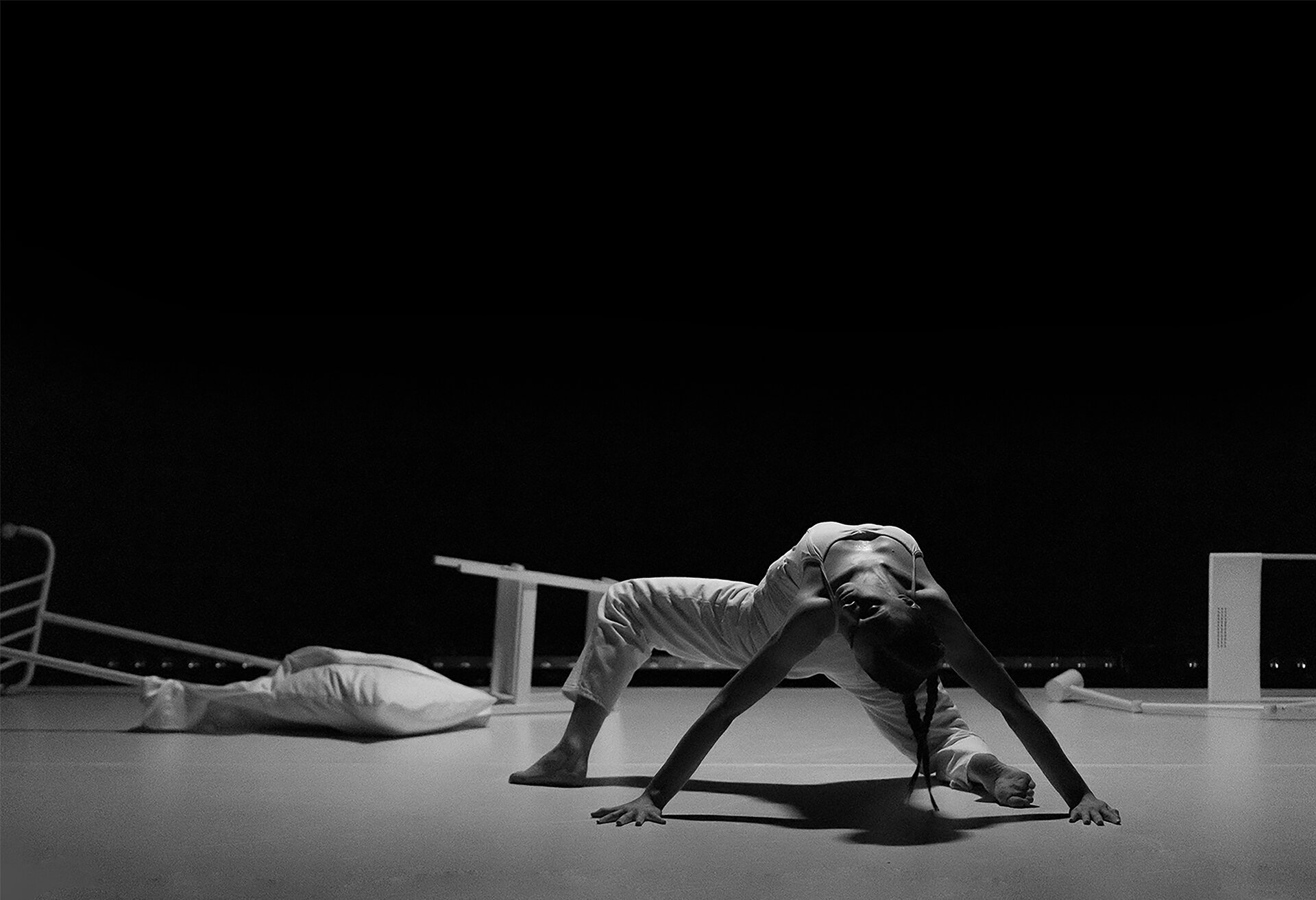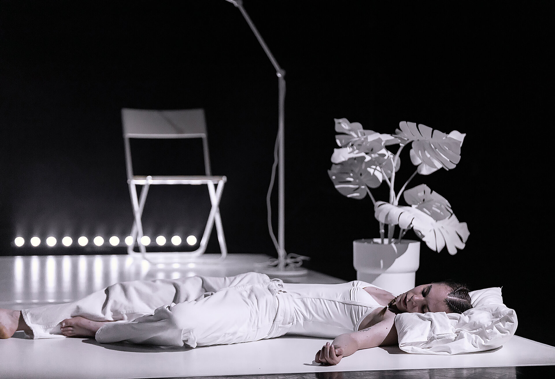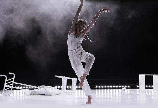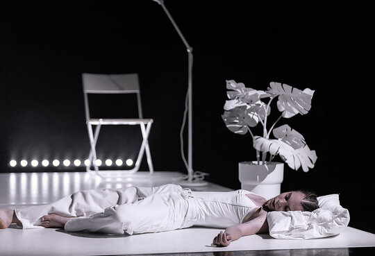 Spațiul performativ al spectacolului Morning Solitude este configurat ca un white-box, un dispozitiv scenografic neutru, minimalist, aproape aseptic. Această neutralitate arhitecturală devine ecranul pe care se proiectează trăirile Alexandrei. Povestea personală a dansatoarei – marcată de confruntarea cu diagnosticul de scleroză multiplă – este transpusă scenic printr-un proces de corporalizare a vulnerabilității și a rezilienței.