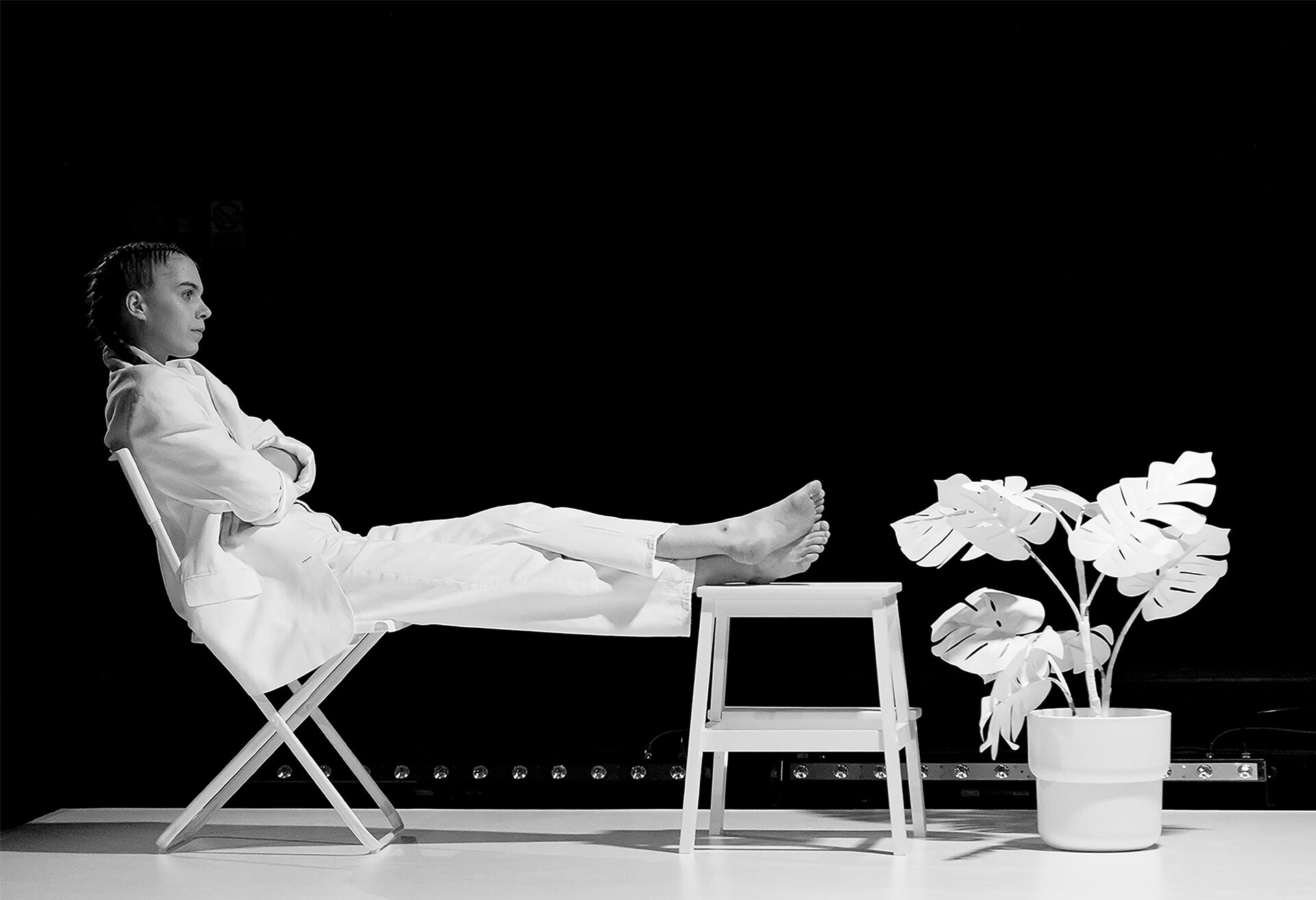 Amplasarea surselor luminoase în cele patru colțuri ale camerei, pe stative, evocă atmosfera unui studio de filmare. Această compoziție este completată de o linie continuă de LED bar, dispusă la nivelul pardoselii, care produce un efect de contre-jour și redefinește percepția volumetrică a scenei. Această dramaturgie luminoasă generează o topografie emoțională, capabilă să contracte sau să dilate spațiul, să inducă tensiune sau calm.