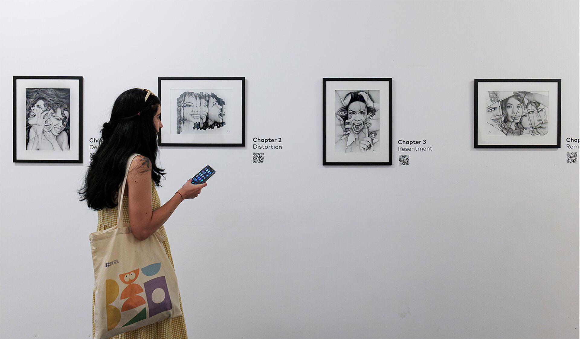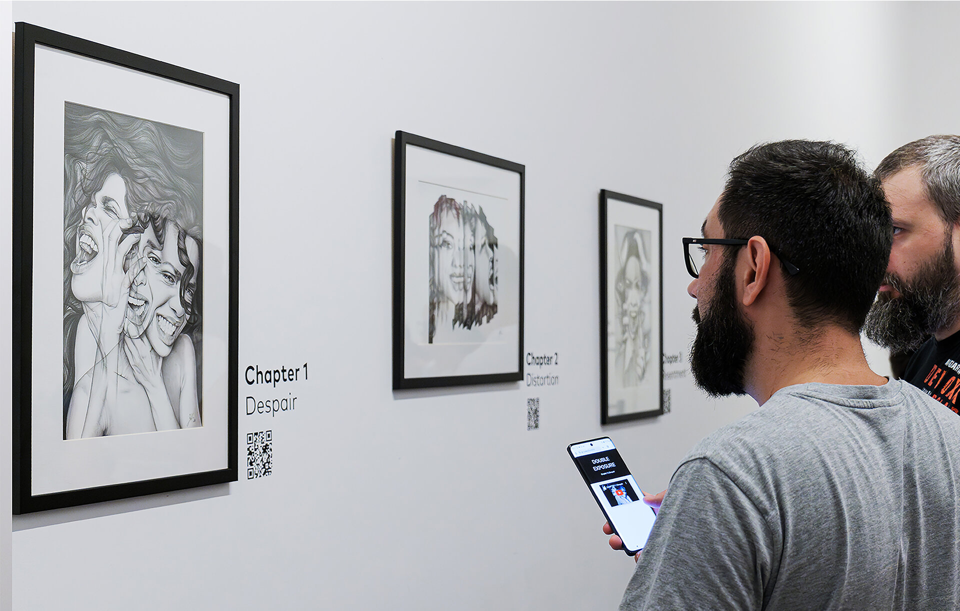 Desenele prind viață în 5 animații video cu sunet (muzică: Alexandru Suciu) în care privitorul poate auzi gândurile din spatele portretelor. Aceste inserții multimedia transformă lucrările bidimensionale în obiecte spațiale cu strat sonor și cinematic, generând o experiență imersivă. În procesul de creație a fost integrată inteligența artificială, utilizată nu ca substitut, ci pentru a crea un dialog între tradiția desenului și tehnologiile emergente.
