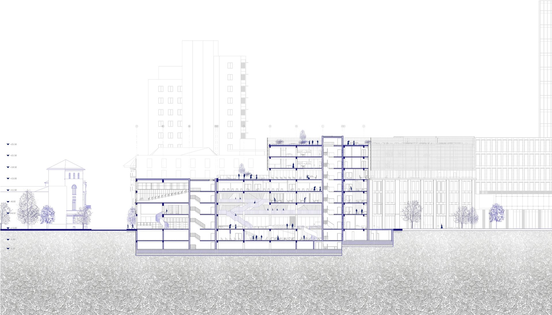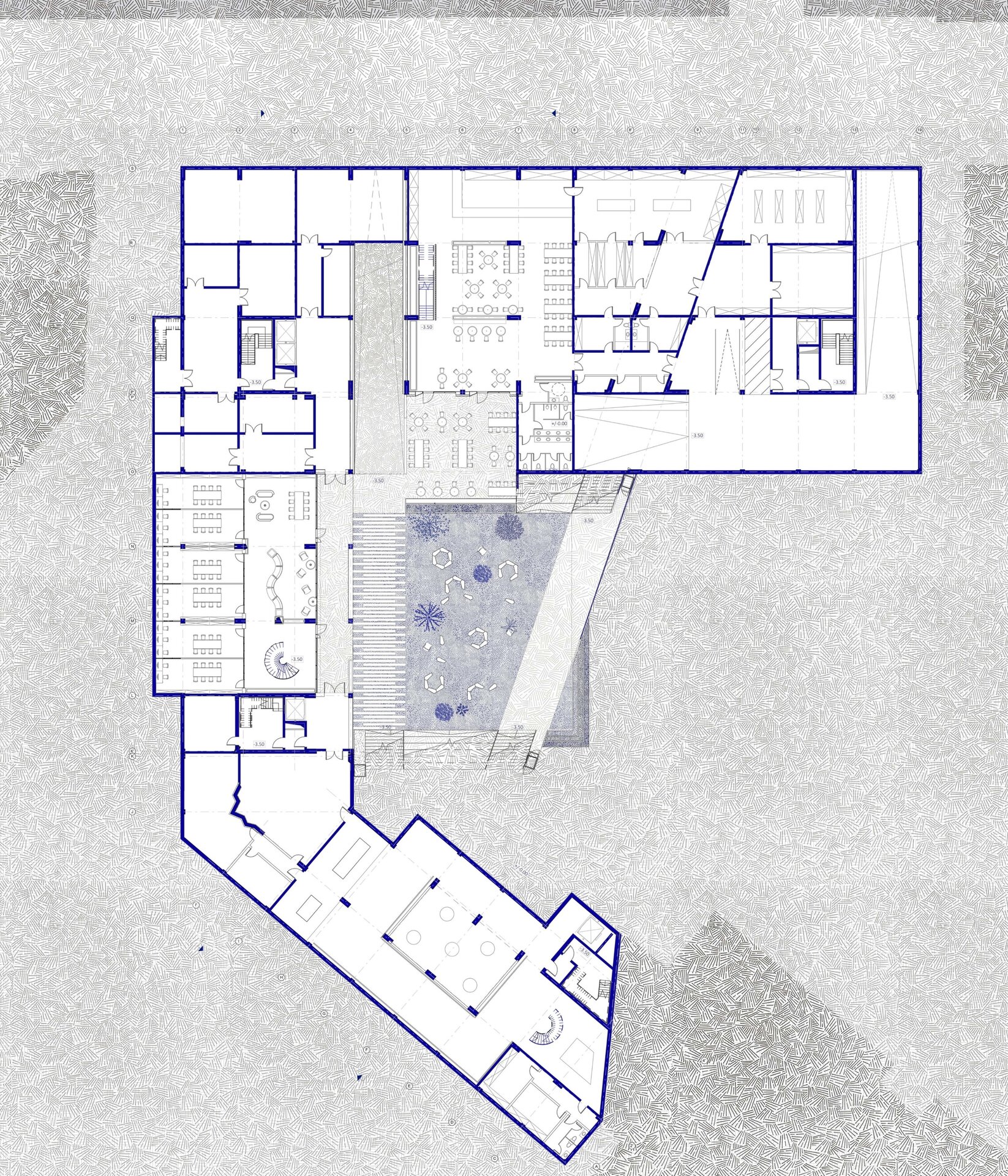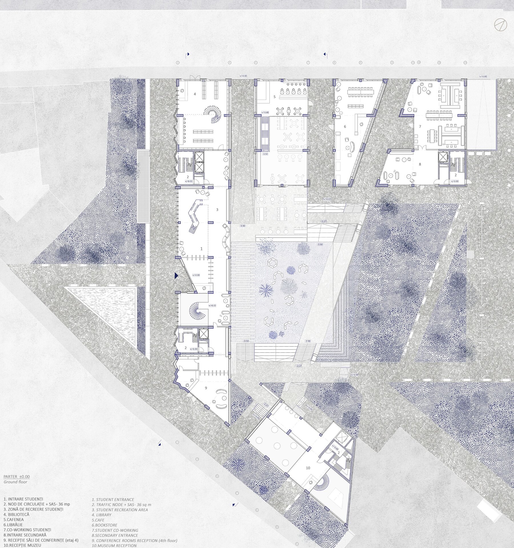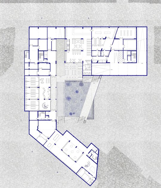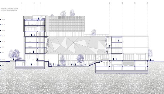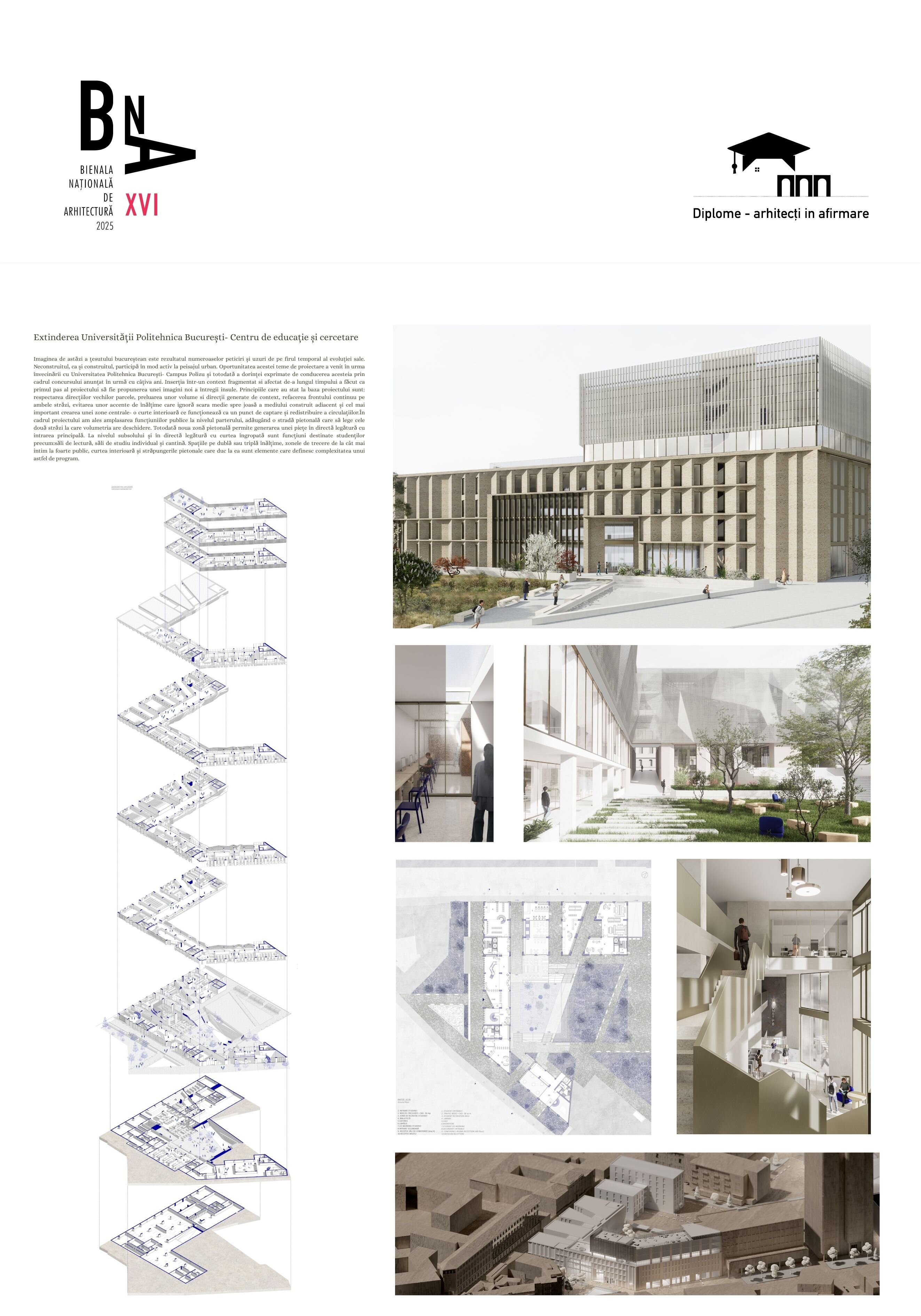 Imaginea de astăzi a țesutului bucureștean este rezultatul numeroaselor peticiri și uzuri de pe firul temporal al evoluției sale. Neconstruitul, ca și construitul, participă în mod activ la peisajul urban. Oportunitatea acestei teme de proiectare a venit în urma învecinării cu Universitatea Politehnica București- Campus Polizu și totodată a dorinței exprimate de conducerea acesteia prin cadrul concursului anunțat în urmă cu câțiva ani. Inserția într-un context fragmentat si afectat de-a lungul timpului a făcut ca primul pas al proiectului să fie propunerea unei imagini noi a întregii insule. Principiile care au stat la baza proiectului sunt: respectarea direcțiilor vechilor parcele, preluarea unor volume si direcții generate de context, refacerea frontului continuu pe ambele străzi, evitarea unor accente de înălțime care ignoră scara medie spre joasă a mediului construit adiacent și cel mai important crearea unei zone centrale- o curte interioară ce funcționează ca un punct de captare și redistribuire a circulațiilor.În cadrul proiectului am ales amplasarea funcțiuniilor publice la nivelul parterului, adăugând o stradă pietonală care să lege cele două străzi la care volumetria are deschidere. Totodată noua zonă pietonală permite generarea unei piețe în directă legătură cu intrarea principală. La nivelul subsolului și în directă legătură cu curtea îngropată sunt funcțiuni destinate studenților precum:săli de lectură, săli de studiu individual și cantină. Spațiile pe dublă sau triplă înălțime, zonele de trecere de la cât mai intim la foarte public, curtea interioară și străpungerile pietonale care duc la ea sunt elemente care definesc complexitatea unui astfel de program.