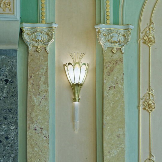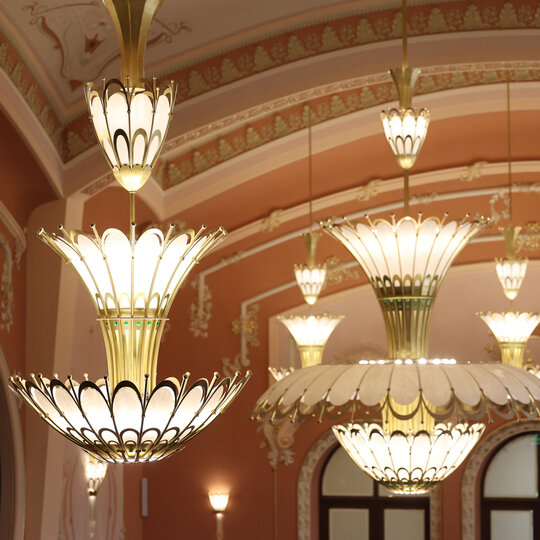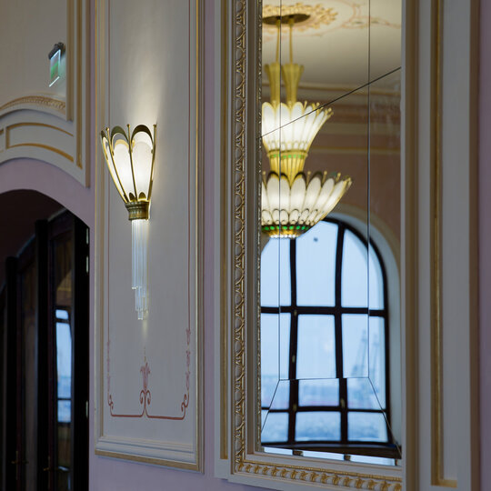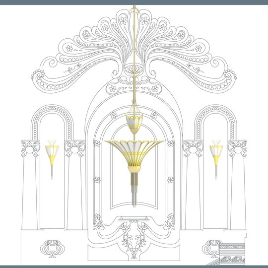 Forma candelabrelor s-a inspirat din curburile arcadelor ferestrelor din sala de spectacole