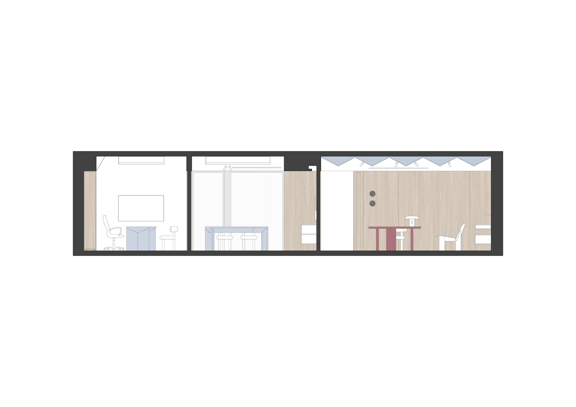 Paleta cromatică propune un contrast elegant și surprinzător: bleu-ul pal aplicat plafonului generează un fundal senin, în timp ce esența de lemn natural susține o senzație domestică și caldă. Accentele puternice precum vișiniul intens al biroului central, negrul scaunelor sau prezența obiectelor decorative în culori saturate conferă dinamism fundalului neutru.
