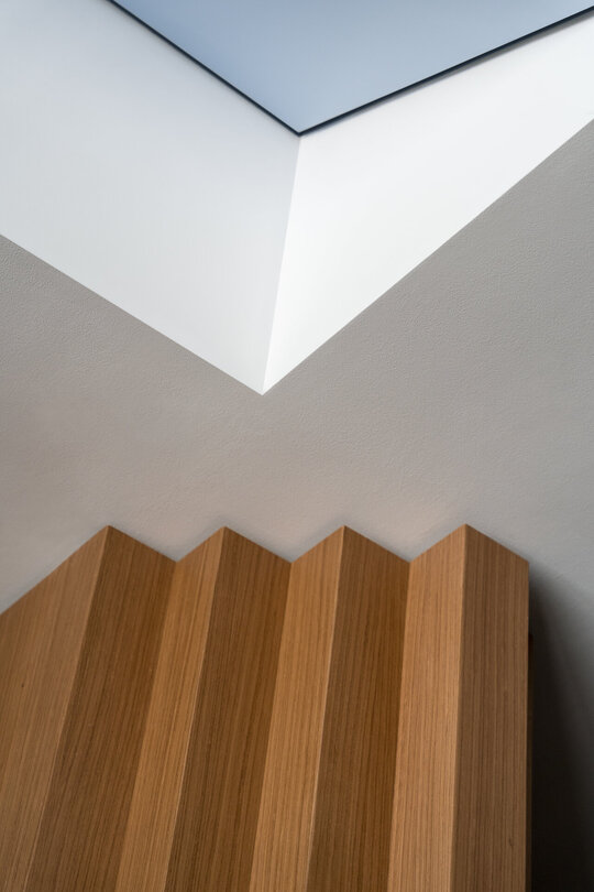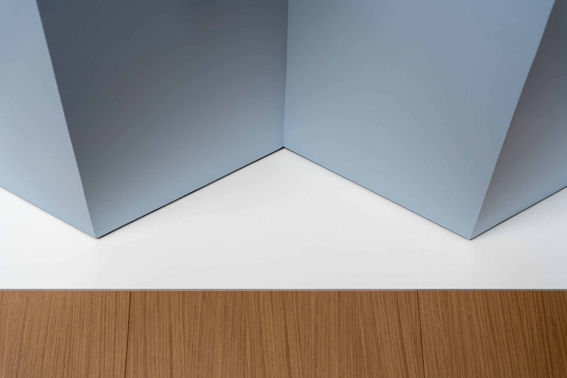 Punctul principal de interes al compoziției îl constituie plafonul, o desfășurare angulară care imprimă dinamism și profunzime încăperii. Formele în zig-zag cu muchii clar desenate și unghiuri regulate dau naștere unei secvențe plastice care modulează percepția spațiului și introduce o tensiune controlată între lumină și volum.