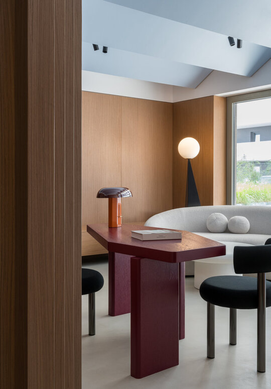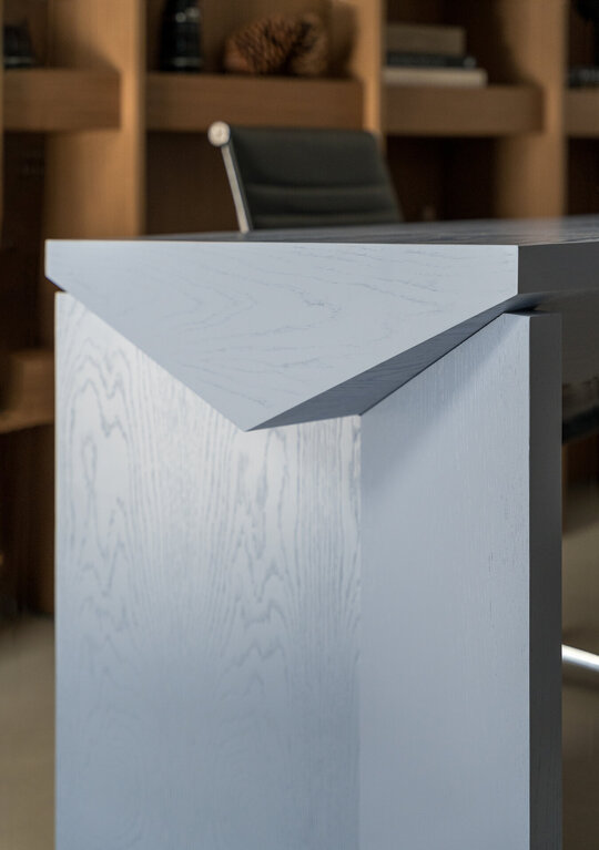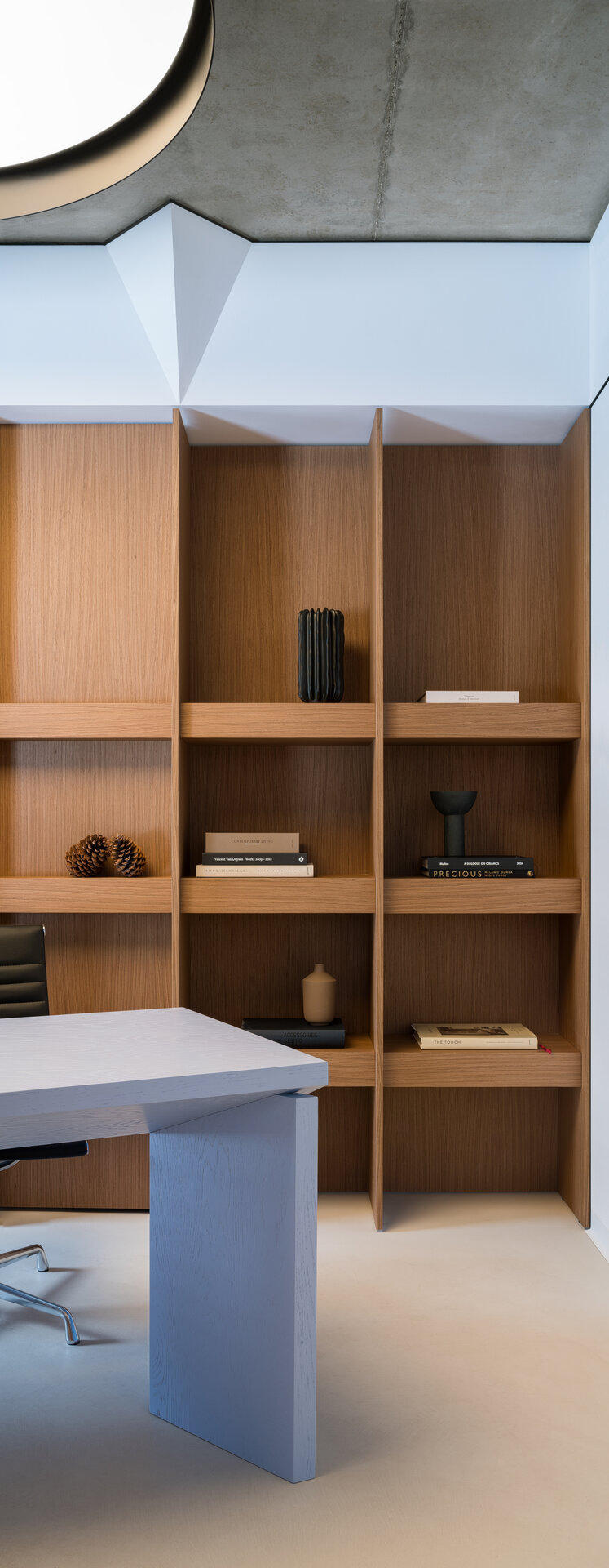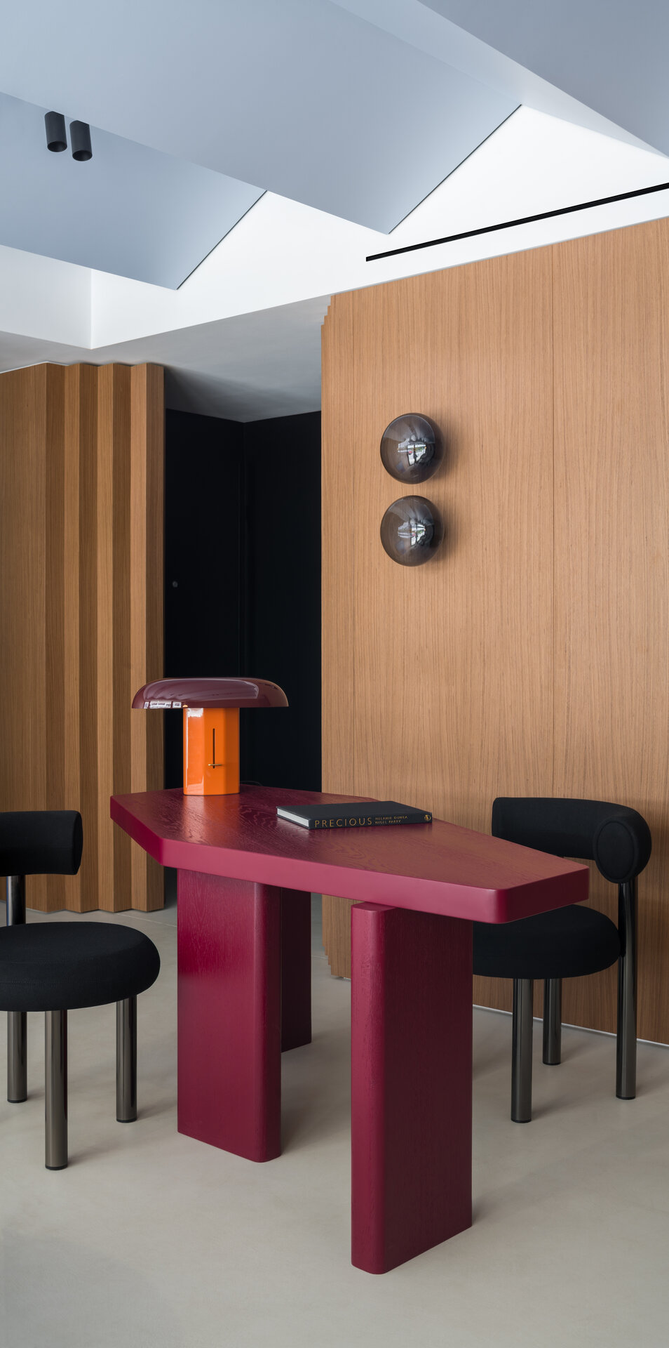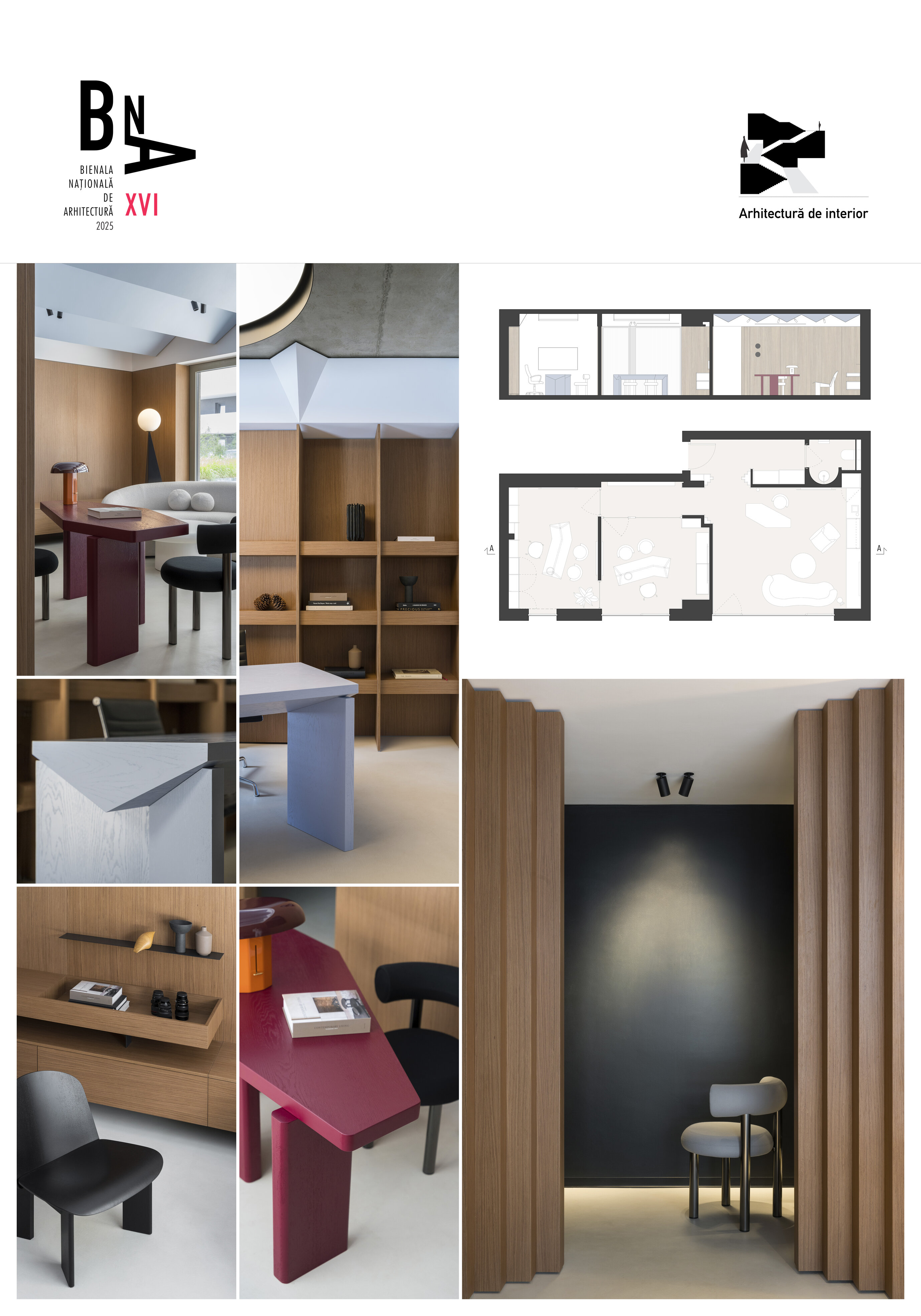 Trecerile între funcțiuni sunt marcate prin portaluri realizate din lamele verticale tratate cu furnir cald, care funcționează ca filtre vizuale ce adaugă ritm parietal. În această scenografie, piesele de mobilier realizate la comandă devin repere spațiale: birourile concepute de noi cu finisaje saturate și forme grafice sunt inserate în logica geometrică a ansamblului fără a perturba coerența formală.