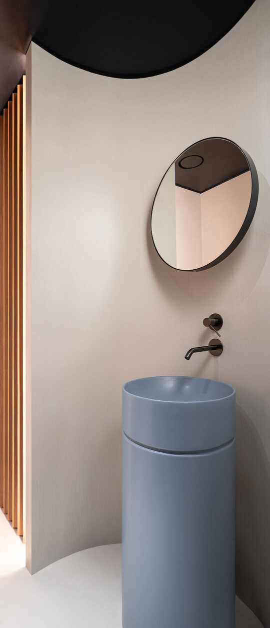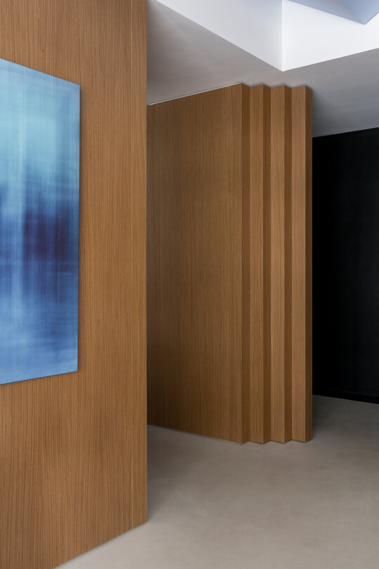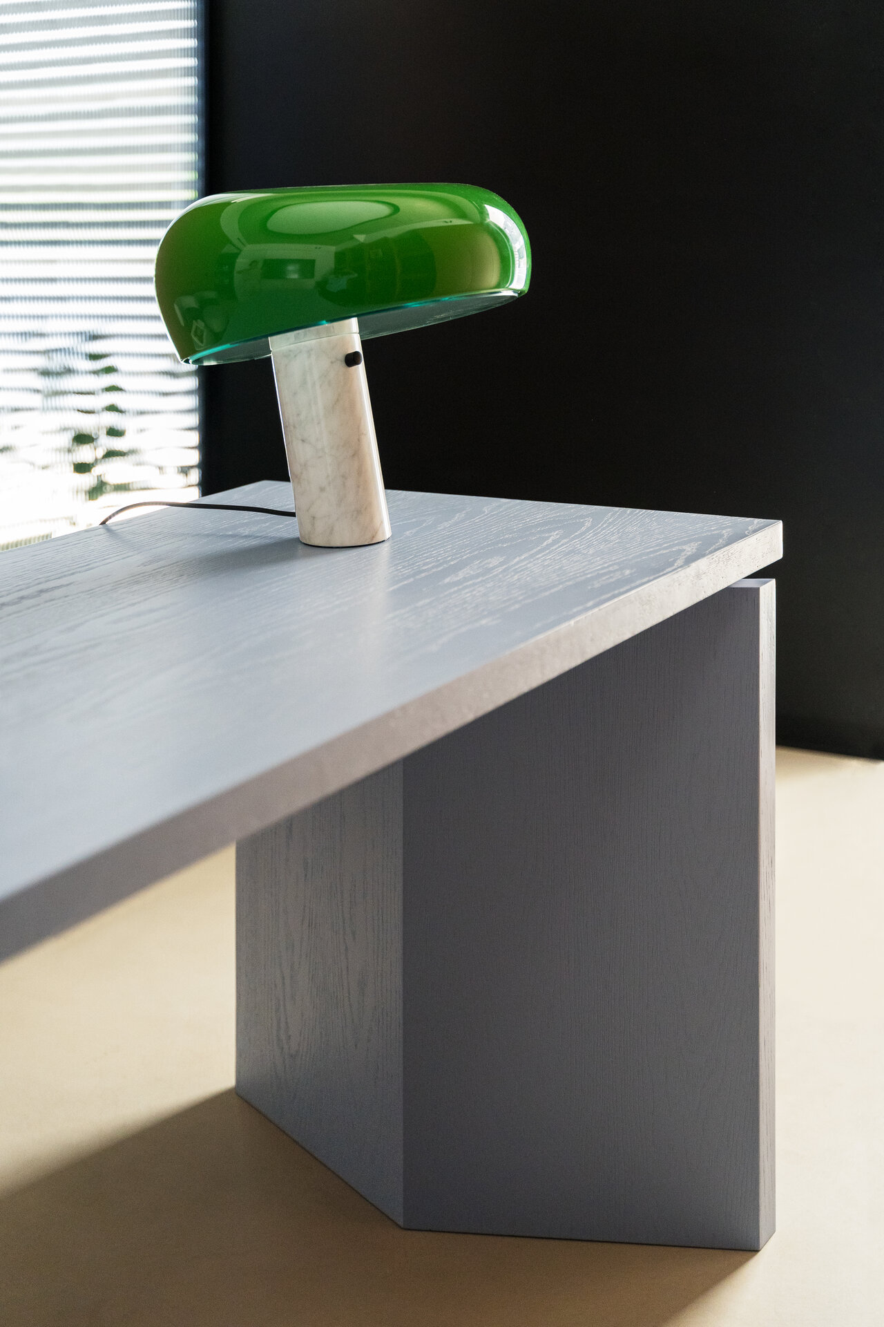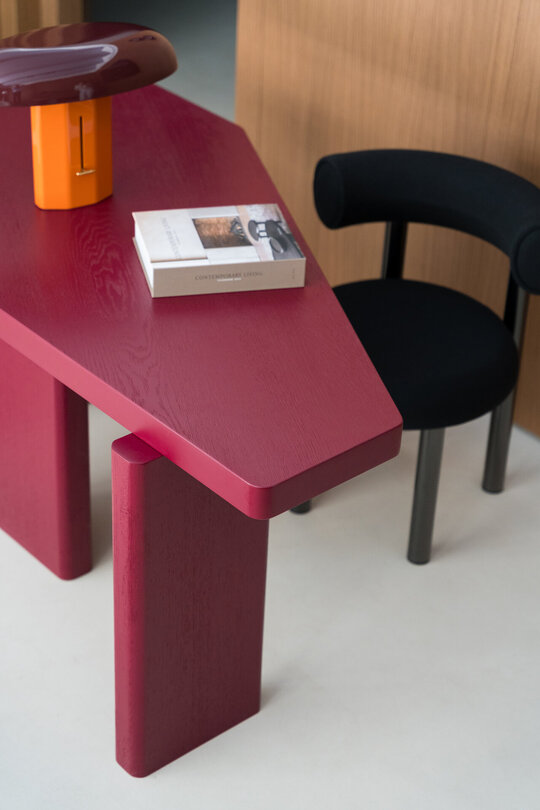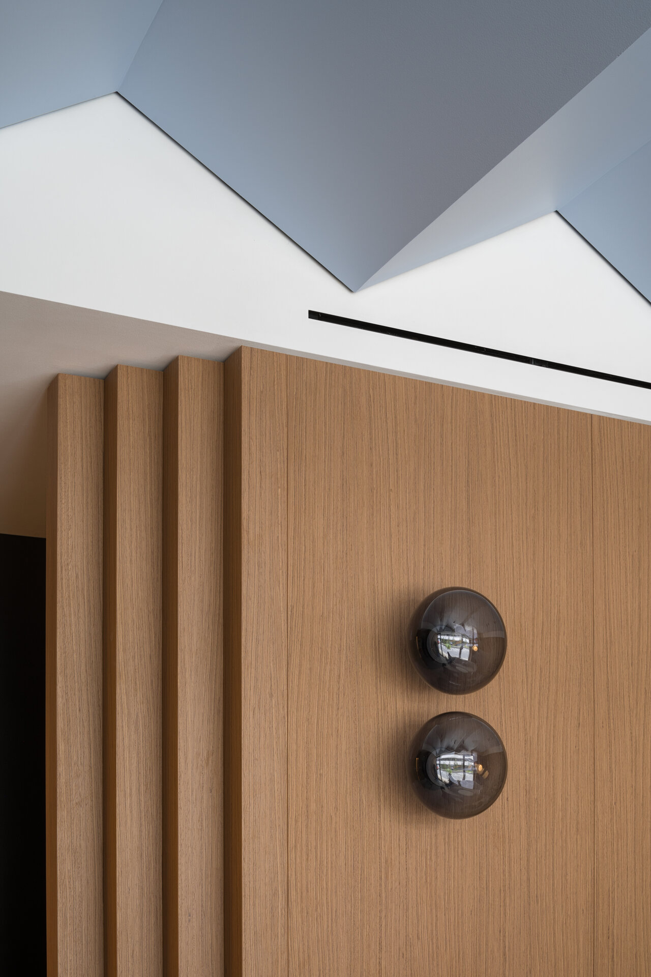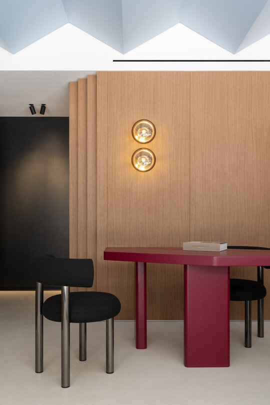 Trecerile între funcțiuni sunt marcate prin portaluri realizate din lamele verticale tratate cu furnir cald, care funcționează ca filtre vizuale ce adaugă ritm parietal. În această scenografie, piesele de mobilier realizate la comandă devin repere spațiale: birourile concepute de noi cu finisaje saturate și forme grafice sunt inserate în logica geometrică a ansamblului fără a perturba coerența formală.