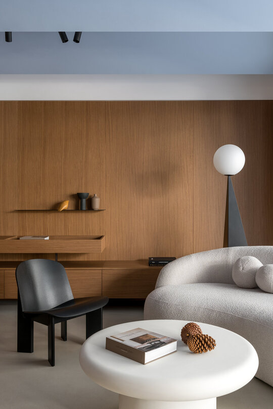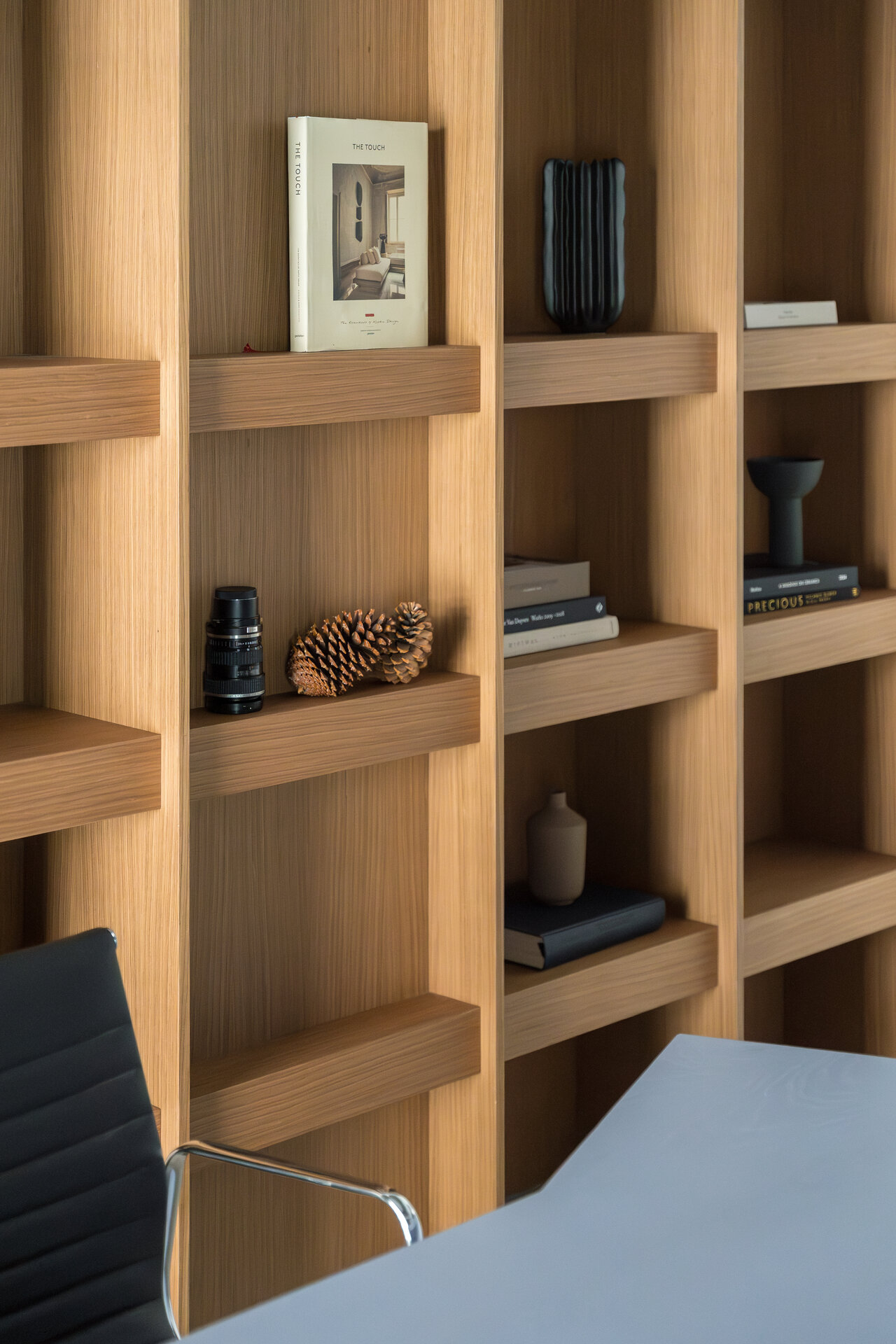 Depozitarea este integrată cu grijă în arhitectura interioară: mobilierul este încastrat iar rafturile devin parte integrată a placării. Rezultatul este o compoziție vizuală ordonată și fără discontinuități, generând o imagine clară, coerentă și aerisită.