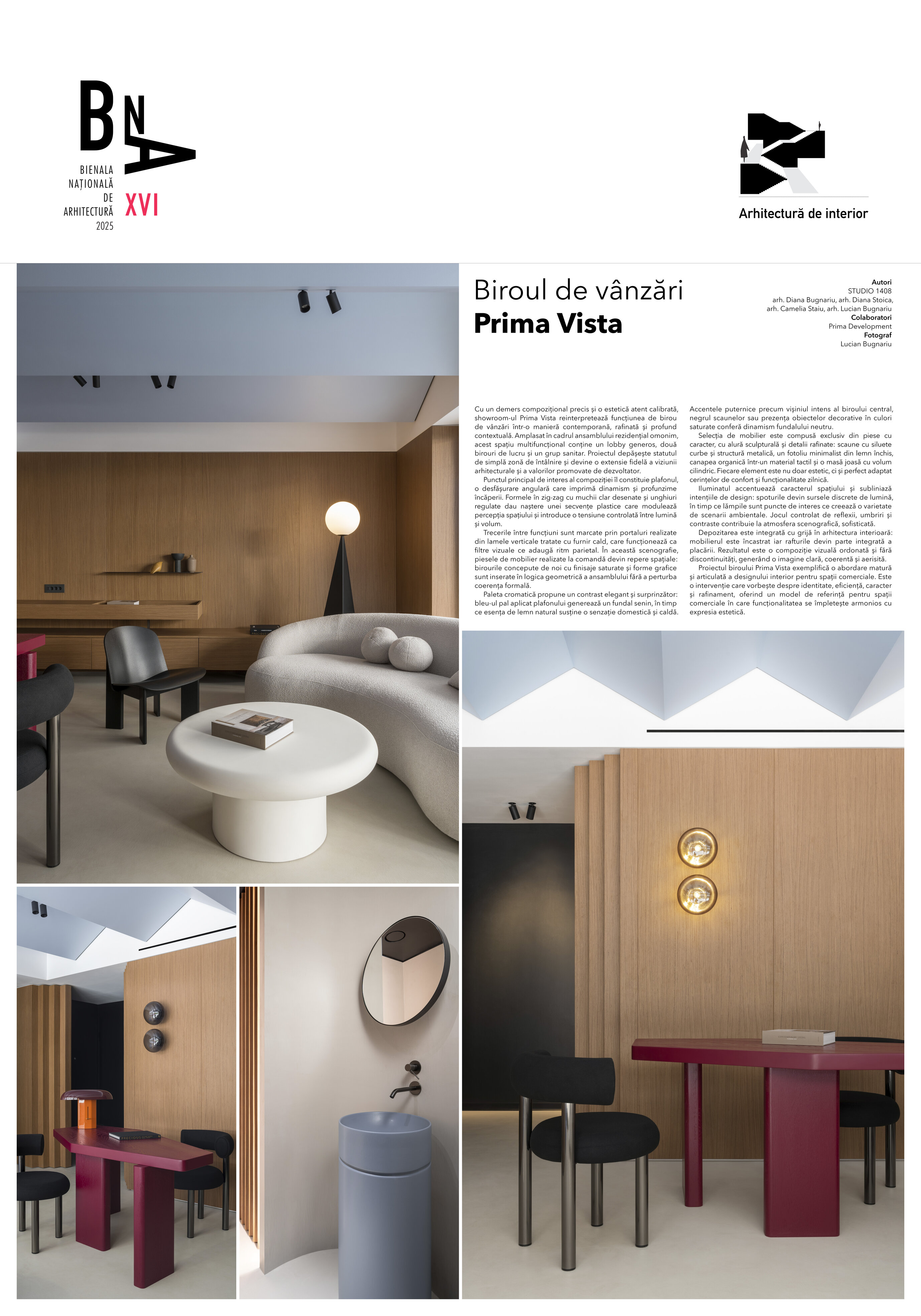 Cu un demers compozițional precis și o estetică atent calibrată, showroom-ul Prima Vista reinterpretează funcțiunea de birou de vânzări într-o manieră contemporană, rafinată și profund contextuală. Amplasat în cadrul ansamblului rezidențial omonim, acest spațiu multifuncțional conține un lobby generos, două birouri de lucru și un grup sanitar. Proiectul depășește statutul de simplă zonă de întâlnire și devine o extensie fidelă a viziunii arhitecturale și a valorilor promovate de dezvoltator.