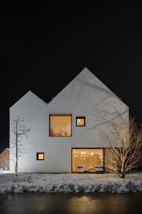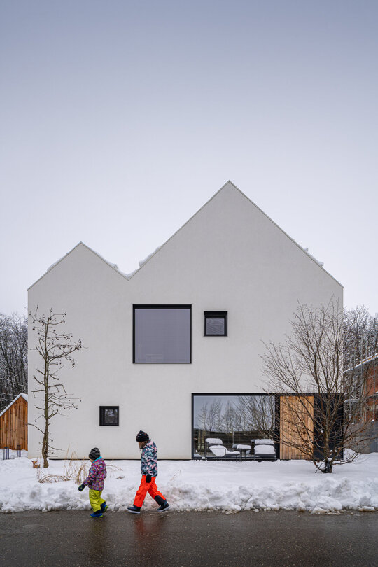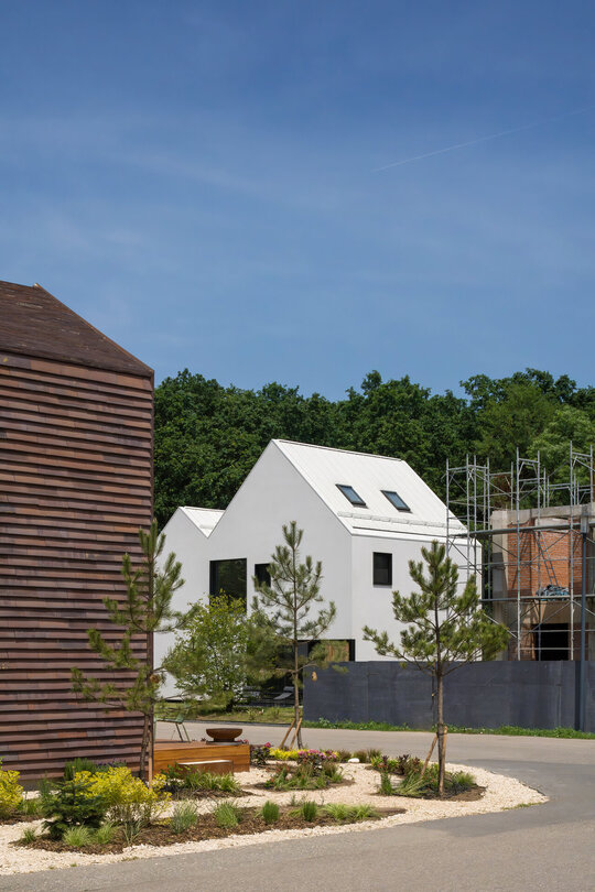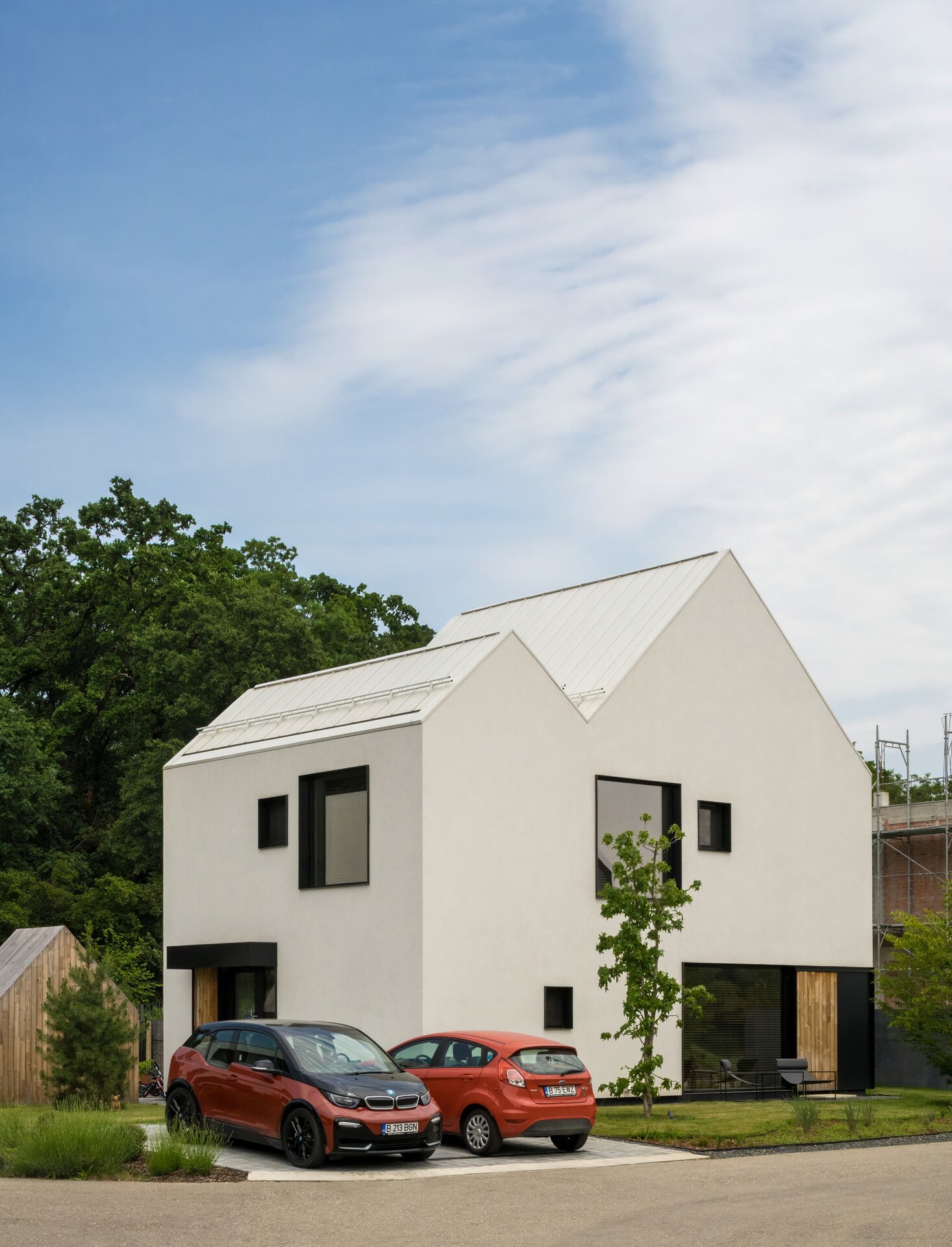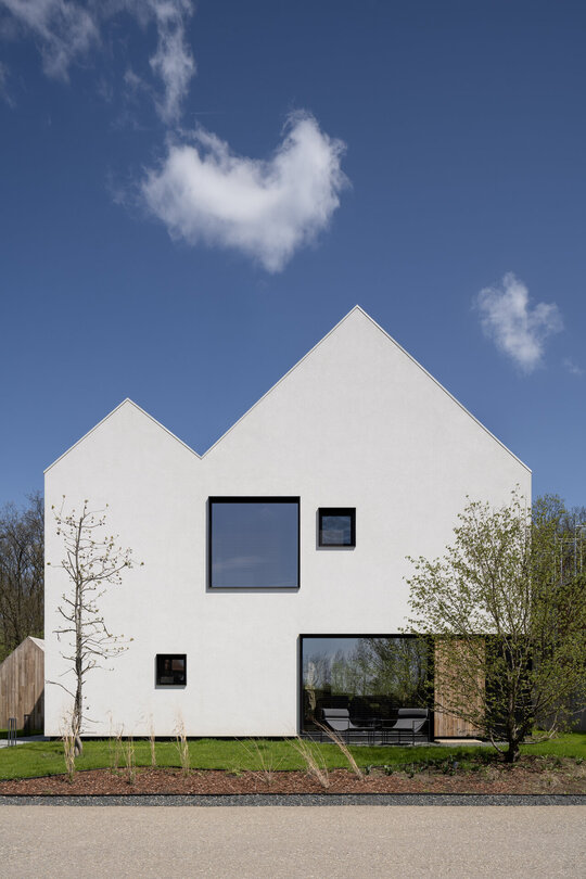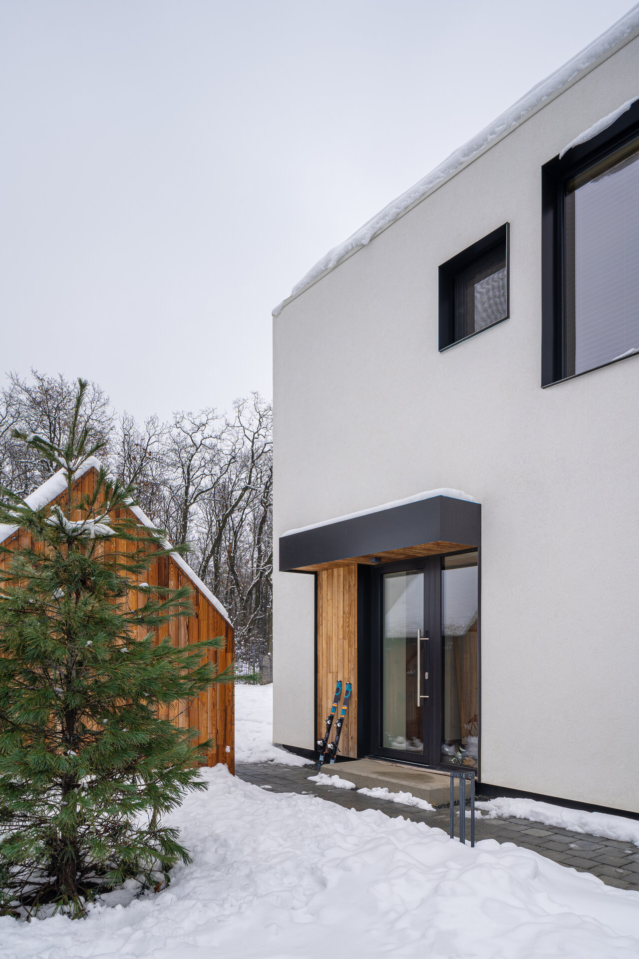 În primul rând, s-a urmărit integrarea în context și maximizarea peisajului foarte valoros. Proiectul este situat într-o dezvoltare rezidențială unică, numită Dumbrava Vlăsiei, definită de o pajiște înconjurată de păduri pe toate părțile. Prin urmare, prima direcție de proiectare a fost crearea unui exterior sensibil față de acest context. Construcția este modestă ca dimensuni, însă dinamică, cu două acoperișuri cu pante abrupte, care creează un dialog cu pădurea din jur.
