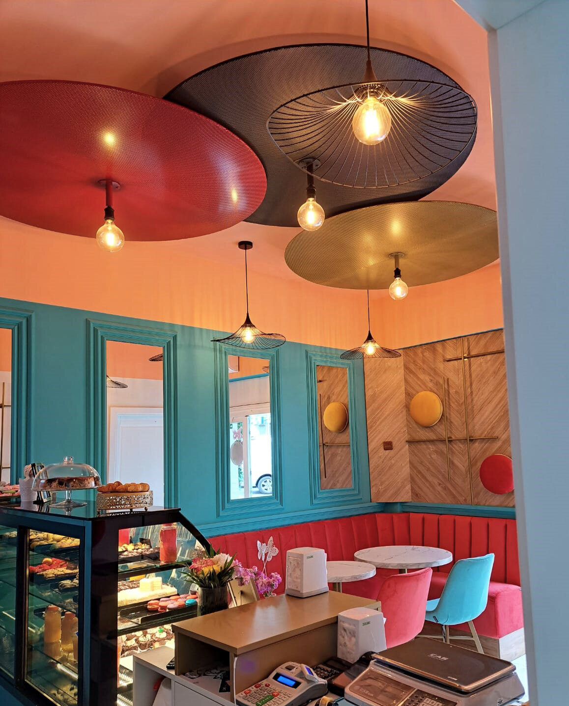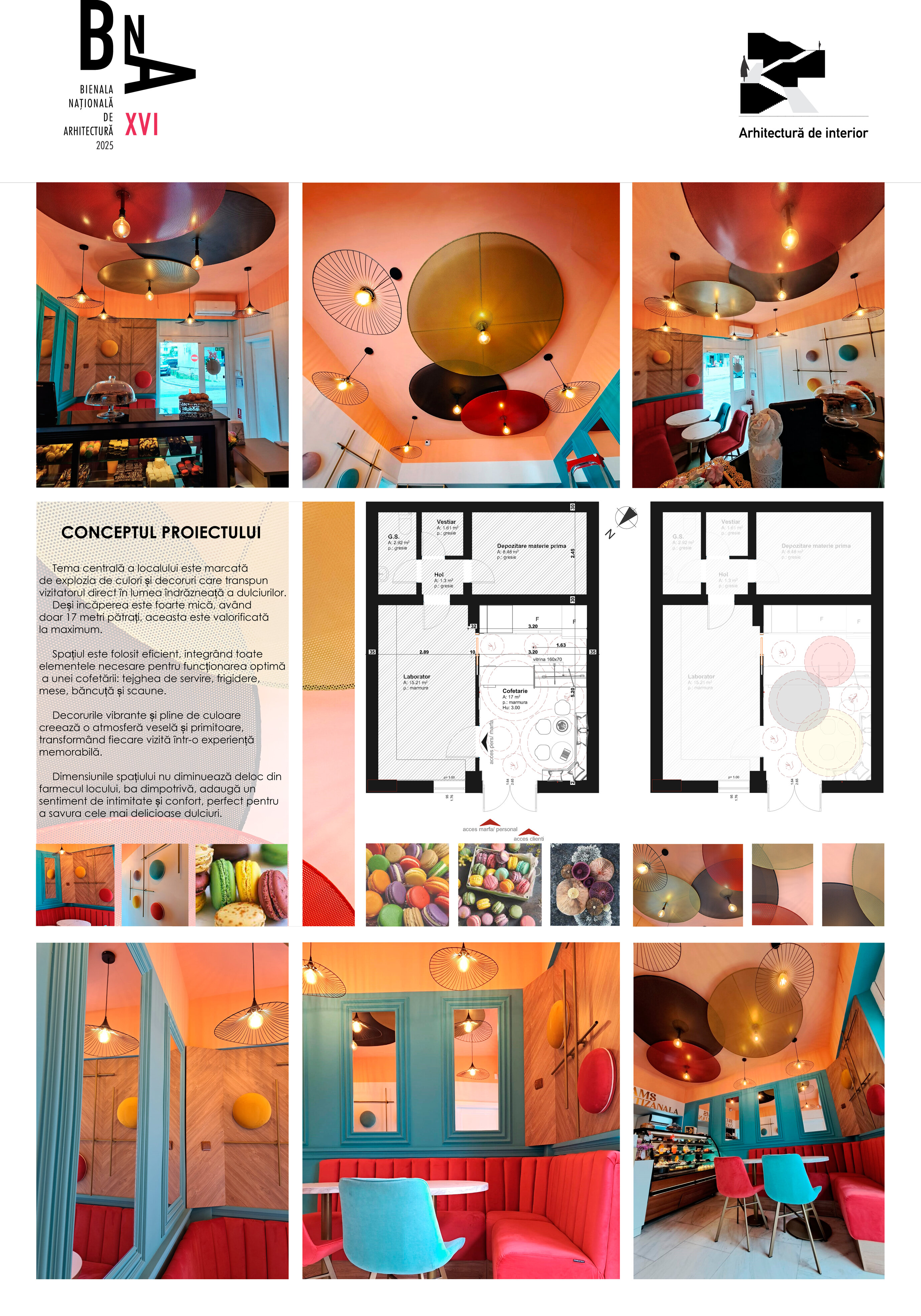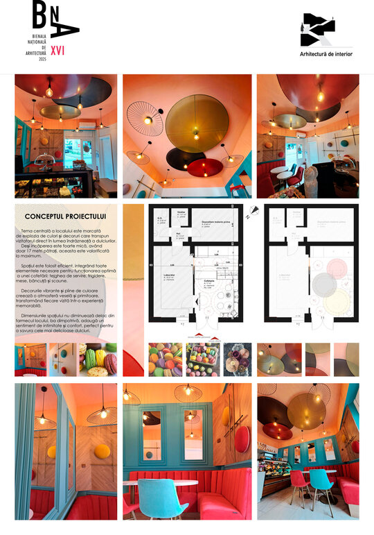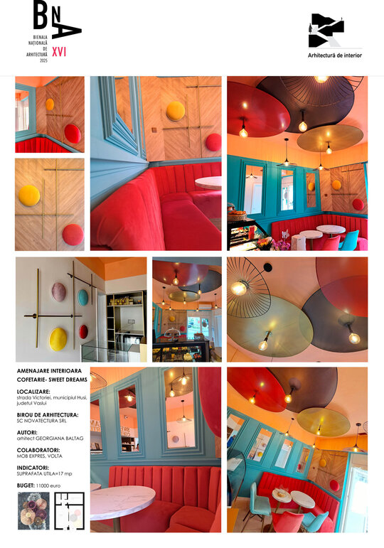 Spațiul este folosit eficient, integrând toate elementele necesare pentru funcționarea optimă a unei cofetării: tejghea de servire, frigidere, mese, băncuță și scaune.