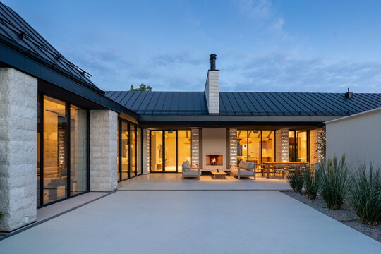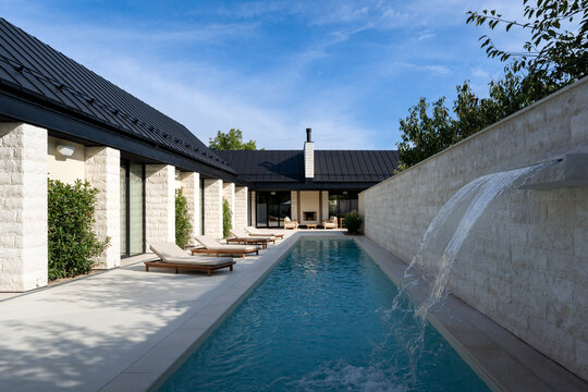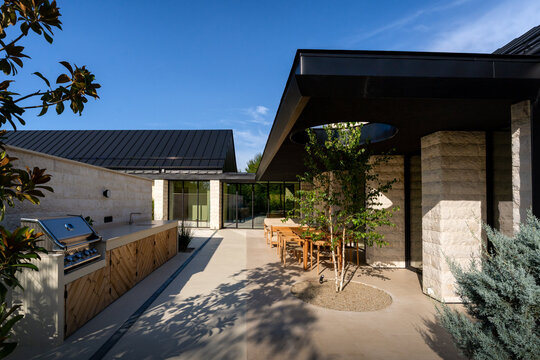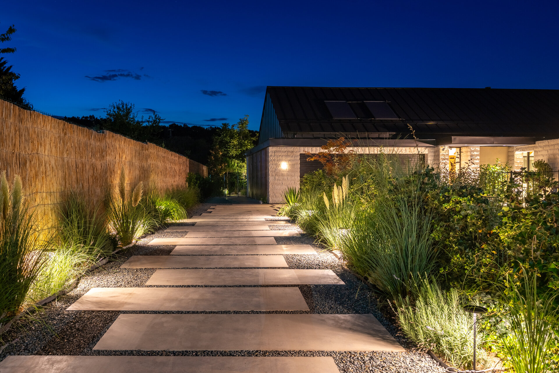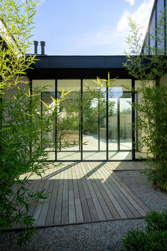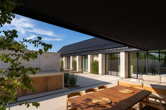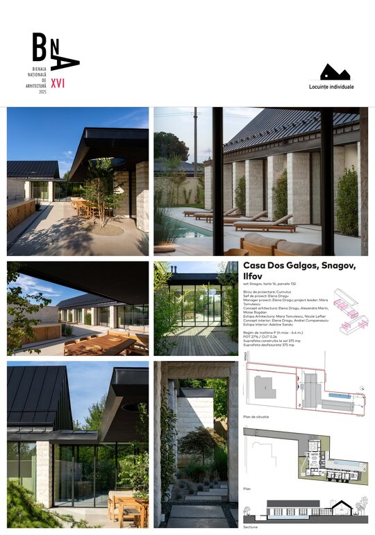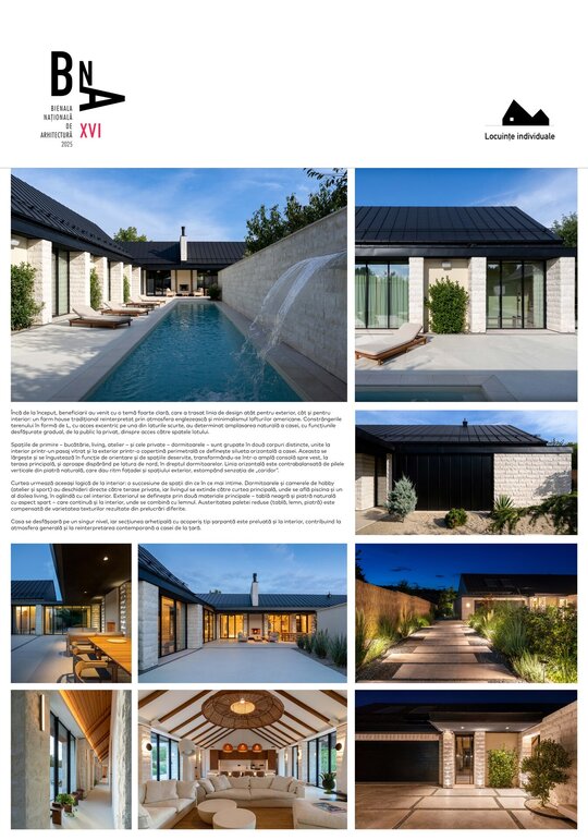 La nivelul amenajării exterioare, curtea urmărește aceleași principii de la interior, respectiv o cascadă de curți cu caracter din ce în ce mai intim, în funcție de spațiul căreia îi corespund: dormitoarele și cele două camere dedicate hobby-urilor (camera atelier și camera de sport) beneficiază fiecare de deschidere directă către o curte/terasă privată, în timp ce livingul se deschide amplu spre curtea principală îmbogățită cu piscină și cu un al doilea living, în oglinda cu cel interior.