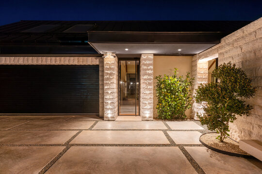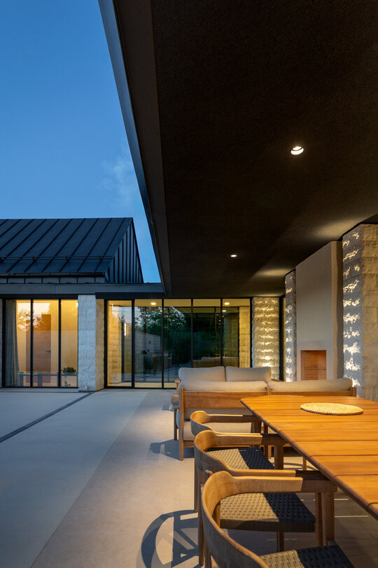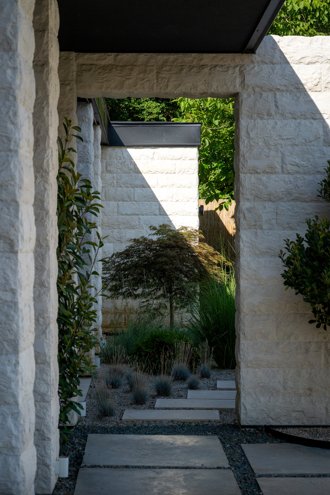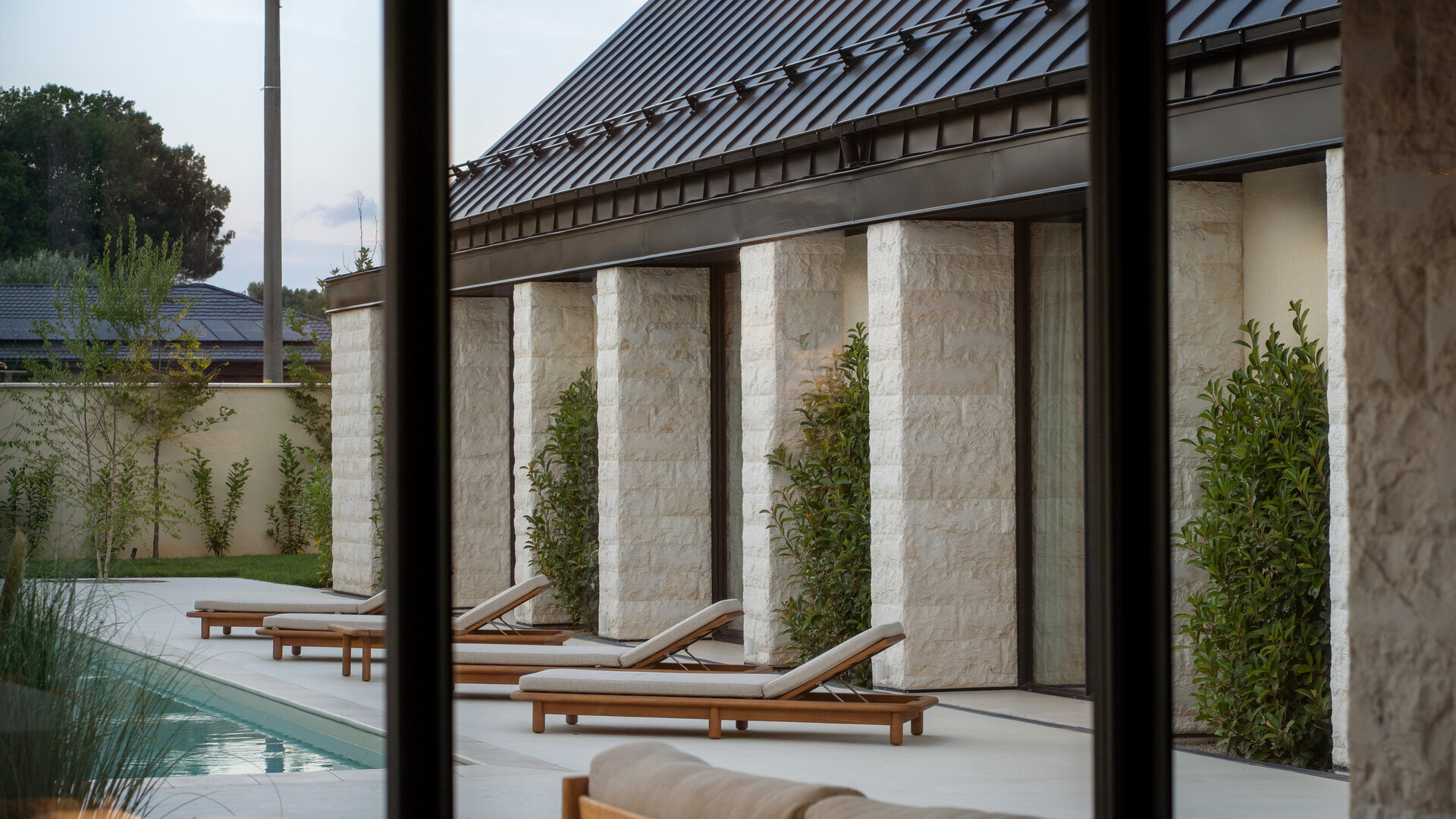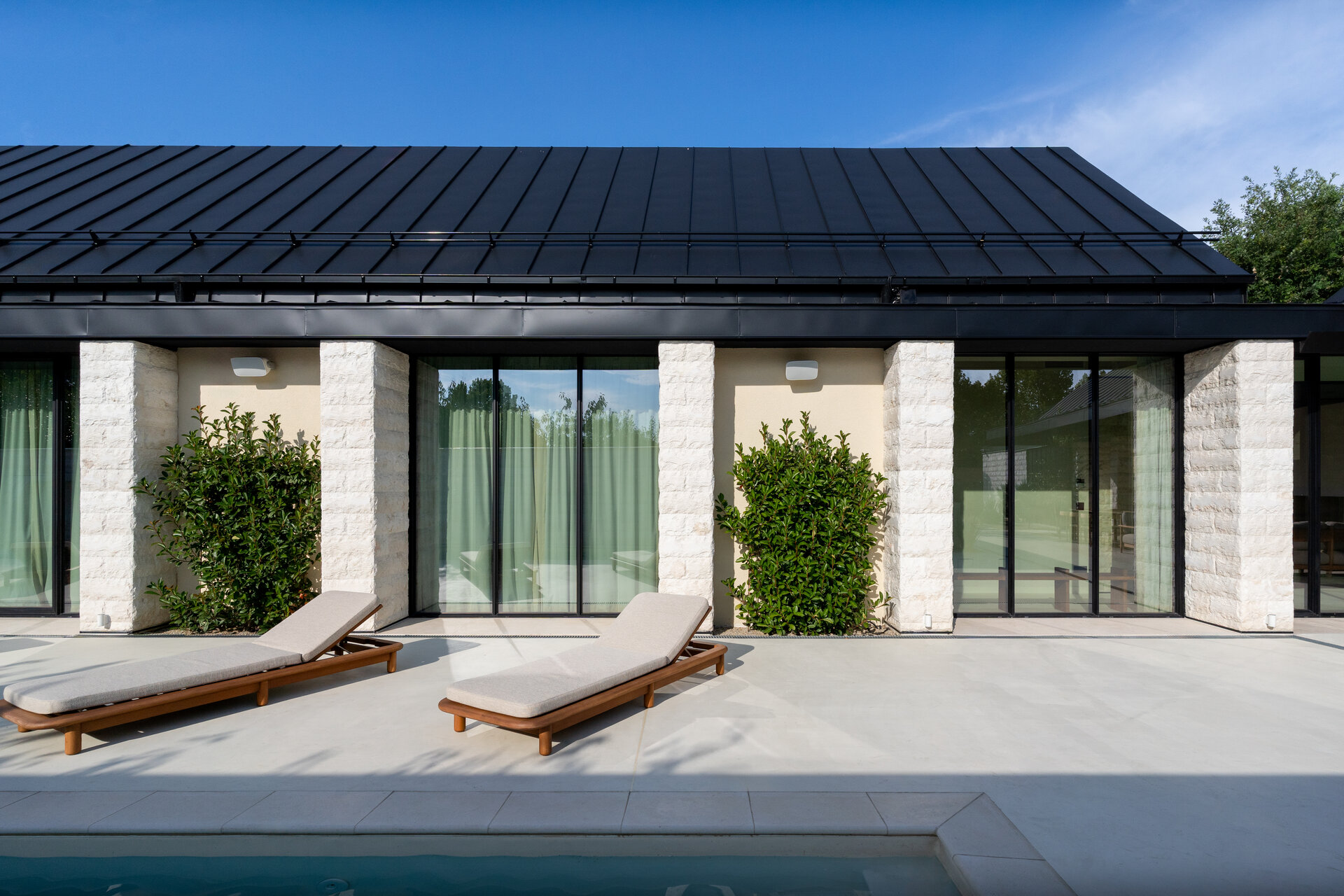 Această linie orizontală puternică este contrabalansată de ritmul vertical al pilelor structurale, îmbrăcate în piatră naturală. Elementele verticale ritmează fațada și spațiul exterior, anulând subtil senzația de „coridor”.