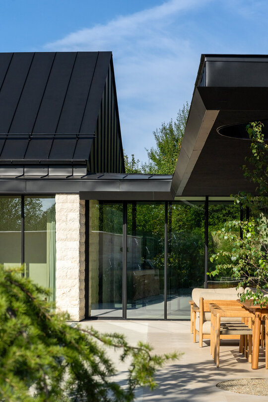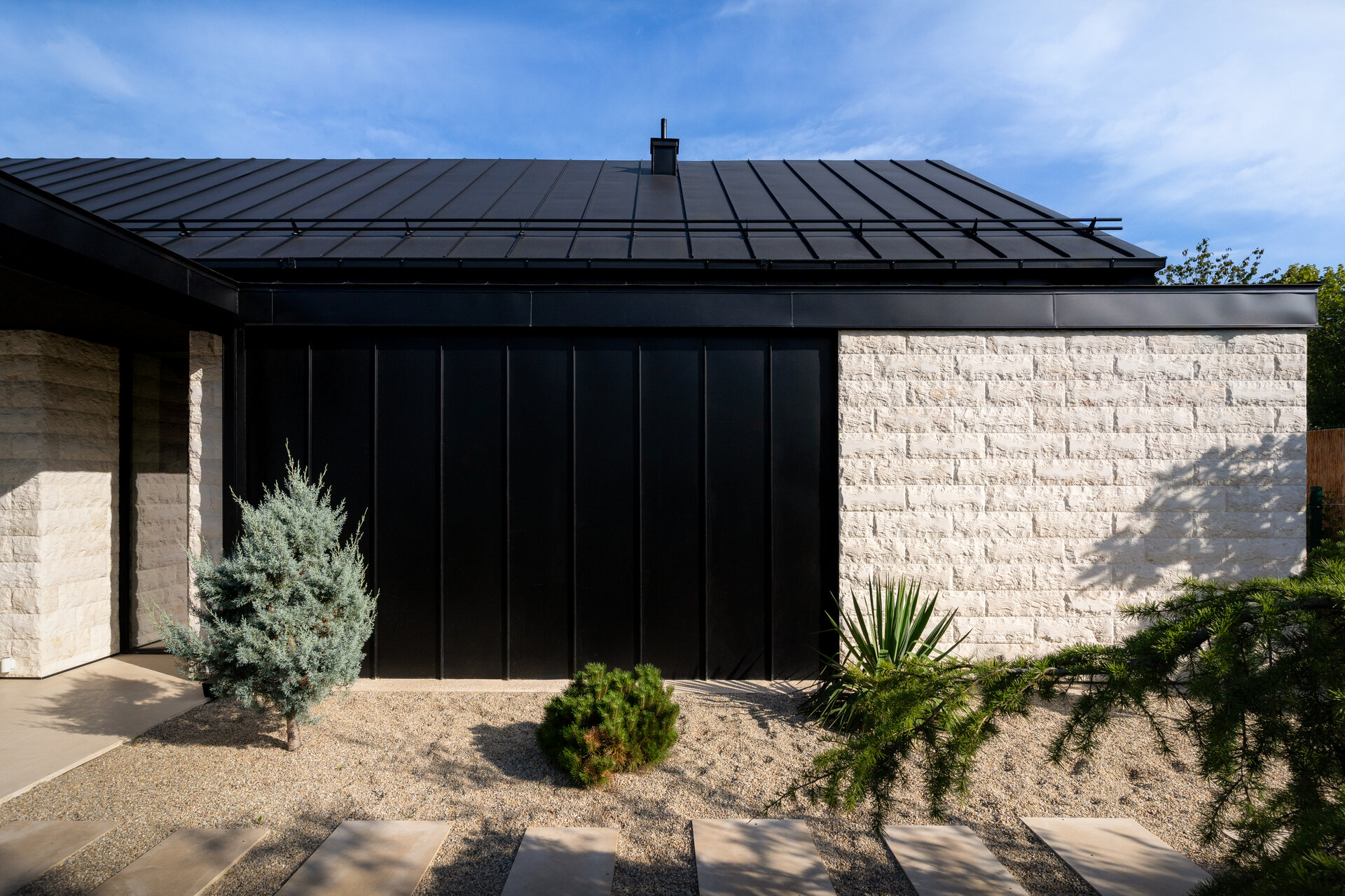 Un accent deosebit s-a pus nu doar pe materialele folosite, cât și pe textura acestora. Exteriorul este definit de doar două materiale principale: tabla neagră și piatră naturală, cu aspect spart. Piatra naturală se prelungește și la interior, unde se combină cu lemnul natural. Aparenta austeritate rezultată din folosirea aproape exclusiv a doar trei materiale – tablă, lemn, piatră – este compensată de un joc bogat de texturi rezultate din prelucrarea materialelor cu tehnici diferite.