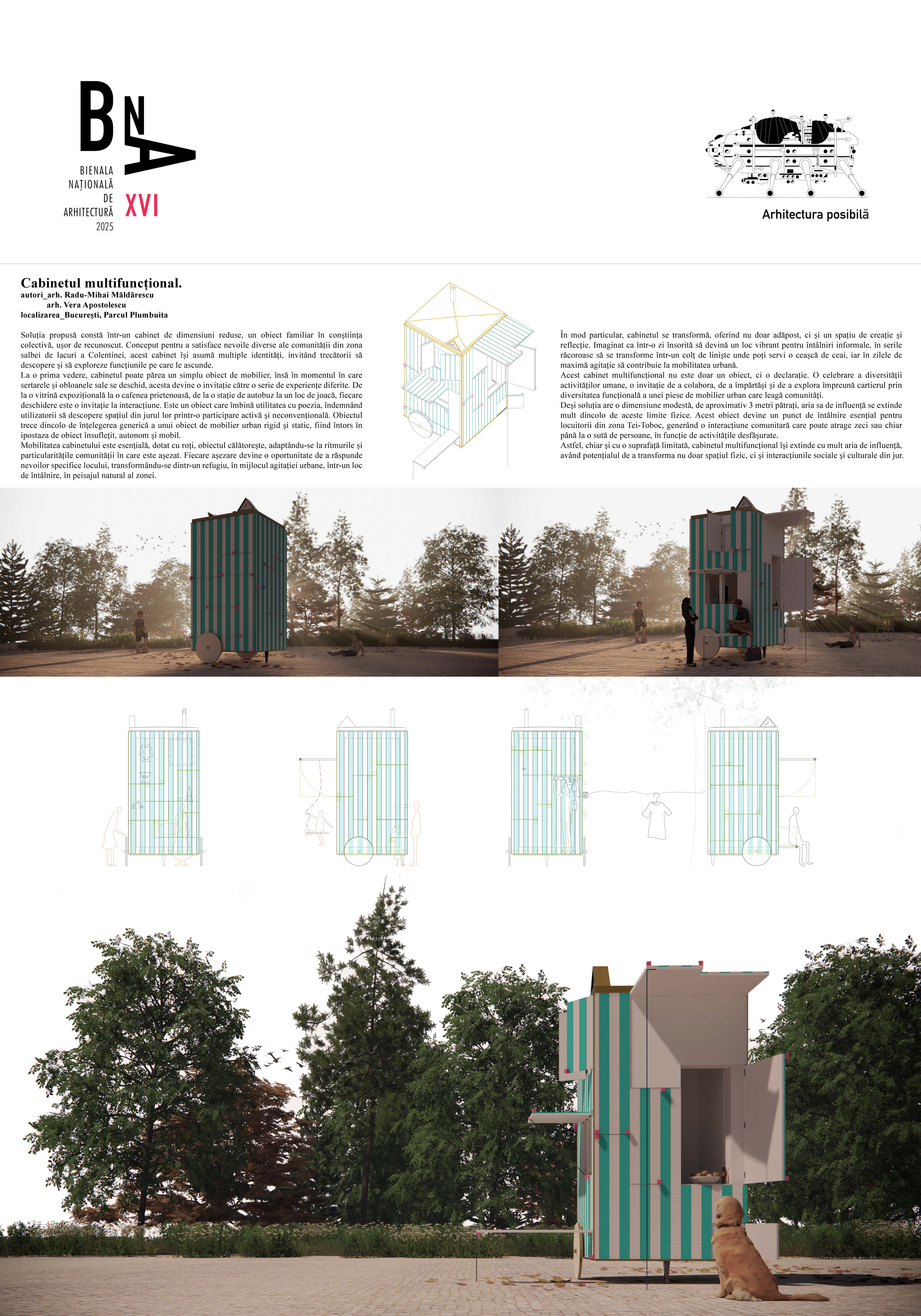 Acest cabinet multifuncțional nu este doar un obiect, ci o declarație. O celebrare a diversității activităților umane, o invitație de a colabora, de a împărtăși și de a explora împreună cartierul prin diversitatea funcțională a unei piese de mobilier urban care leagă comunități.