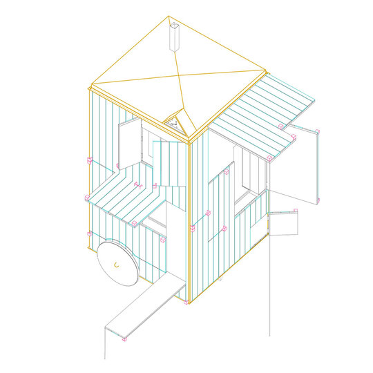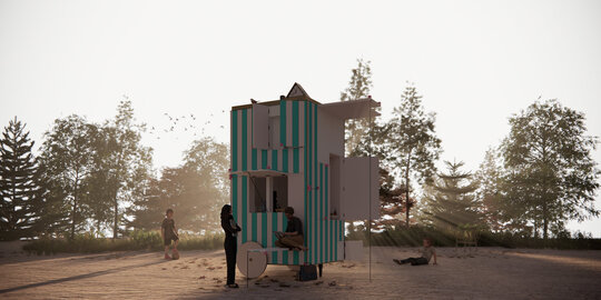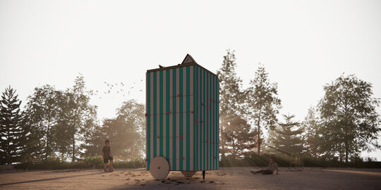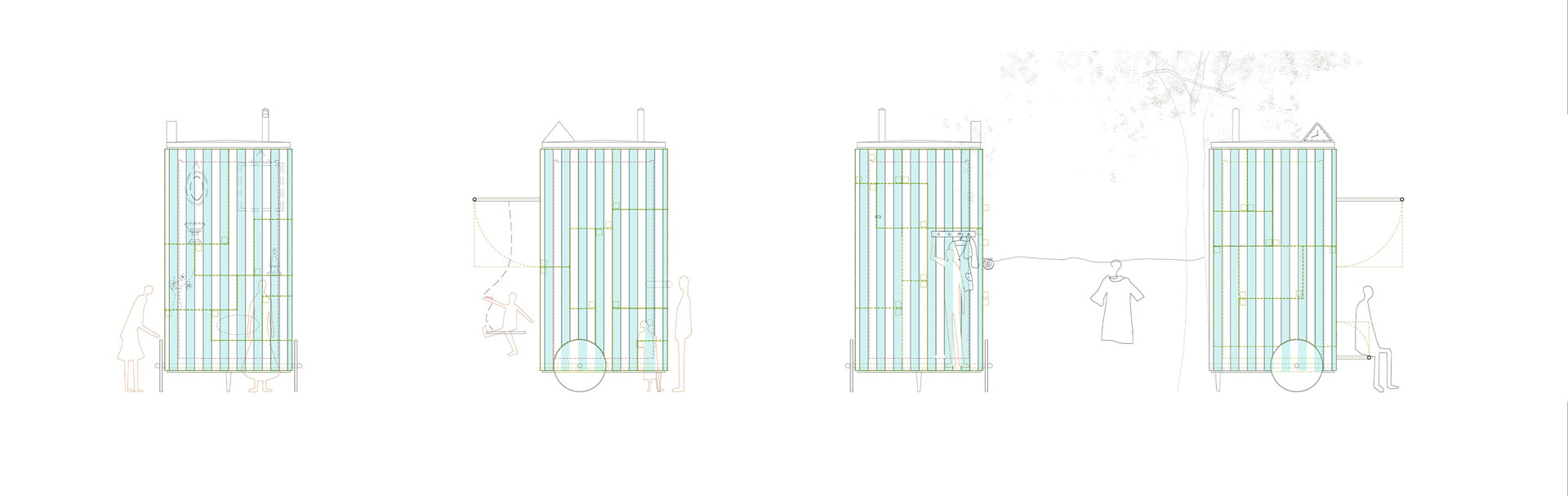 În mod particular, cabinetul se transformă, oferind nu doar adăpost, ci și un spațiu de creație și reflecție. Imaginat ca într-o zi însorită să devină un loc vibrant pentru întâlniri informale, în serile răcoroase să se transforme într-un colț de liniște unde poți servi o ceașcă de ceai, iar în zilele de maximă agitație să contribuie la mobilitatea urbană.