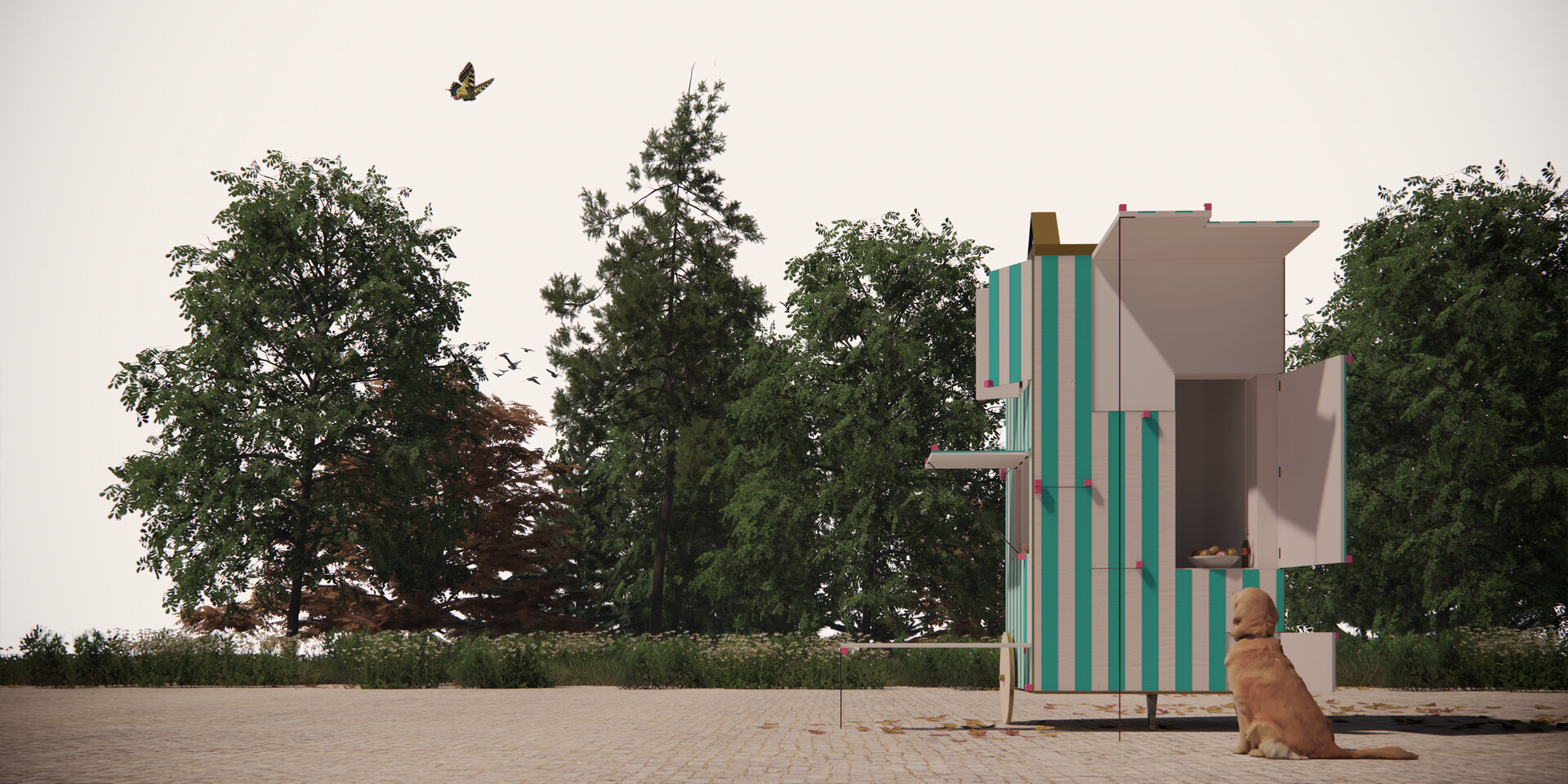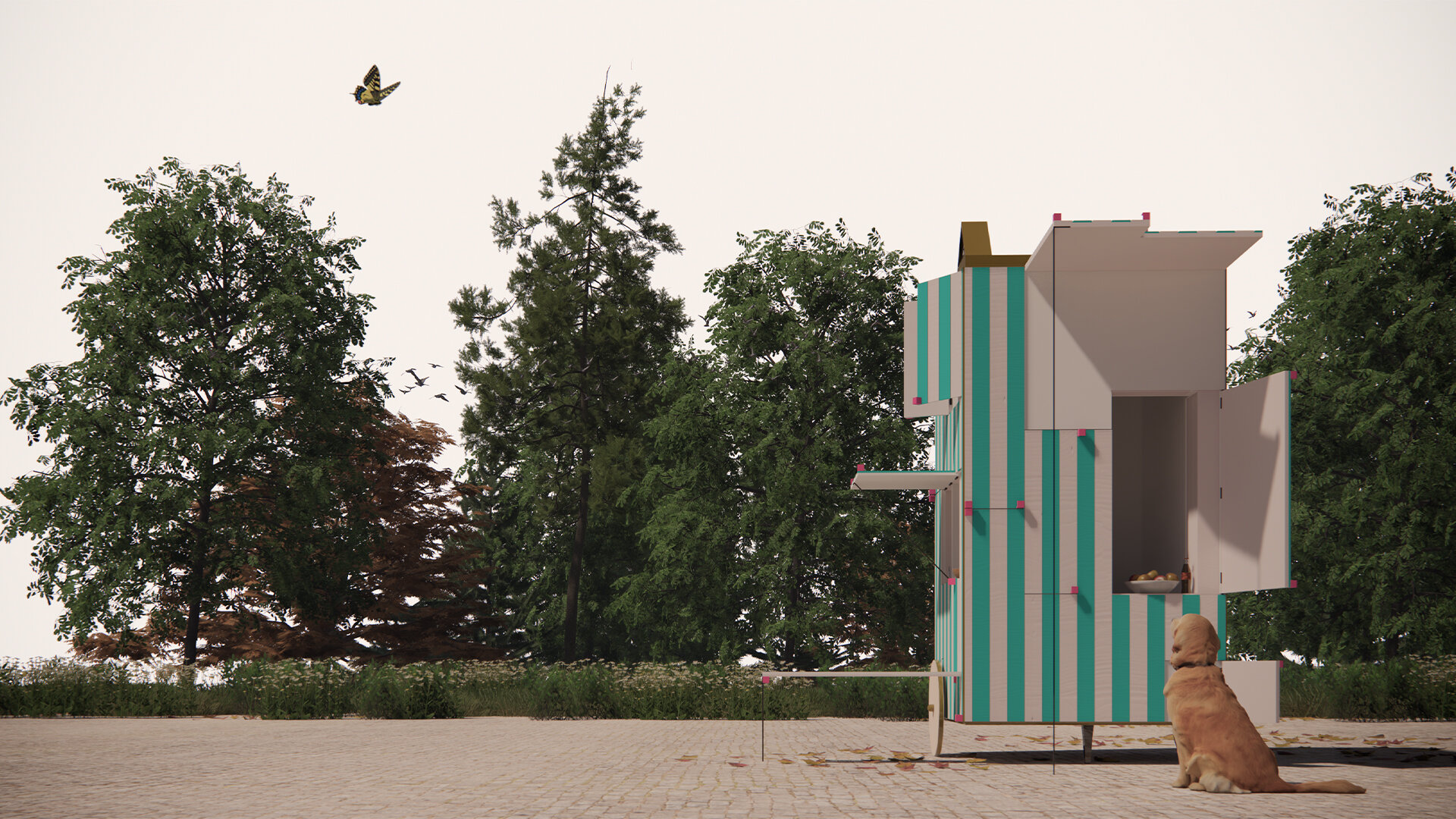 La o prima vedere, cabinetul poate părea un simplu obiect de mobilier, însă în momentul în care sertarele și obloanele sale se deschid, acesta devine o invitație către o serie de experiențe diferite. De la o vitrină expozițională la o cafenea prietenoasă, de la o stație de autobuz la un loc de joacă, fiecare deschidere este o invitație la interacțiune. Este un obiect care îmbină utilitatea cu poezia, îndemnând utilizatorii să descopere spațiul din jurul lor printr-o participare activă și neconvențională. Obiectul trece dincolo de înțelegerea generică a unui obiect de mobilier urban rigid și static, fiind întors în ipostaza de obiect însuflețit, autonom și mobil.