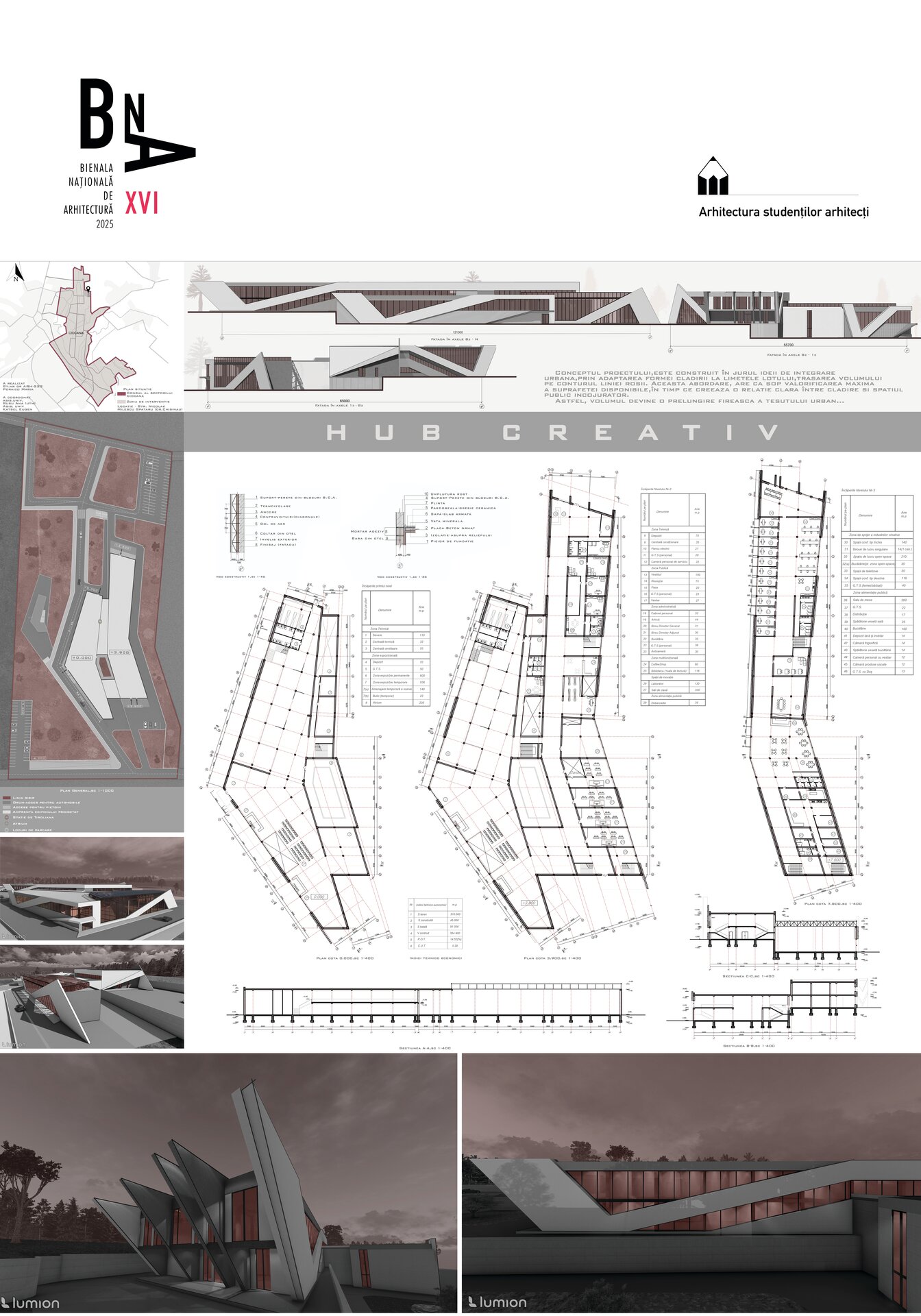 Conceptul proiectului „Hub Creativ” este construit în jurul ideii de integrare urbană prin adaptarea formei clădirii la limitele lotului (trasarea volumului pe conturul liniei roșii). Această abordare are ca scop valorificarea maximă a suprafeței disponibile, în timp ce creează o relație clară între clădire și spațiul public înconjurător. Astfel, volumul devine o prelungire firească a țesutului urban, închizând sau deschizând spațiile în mod strategic.