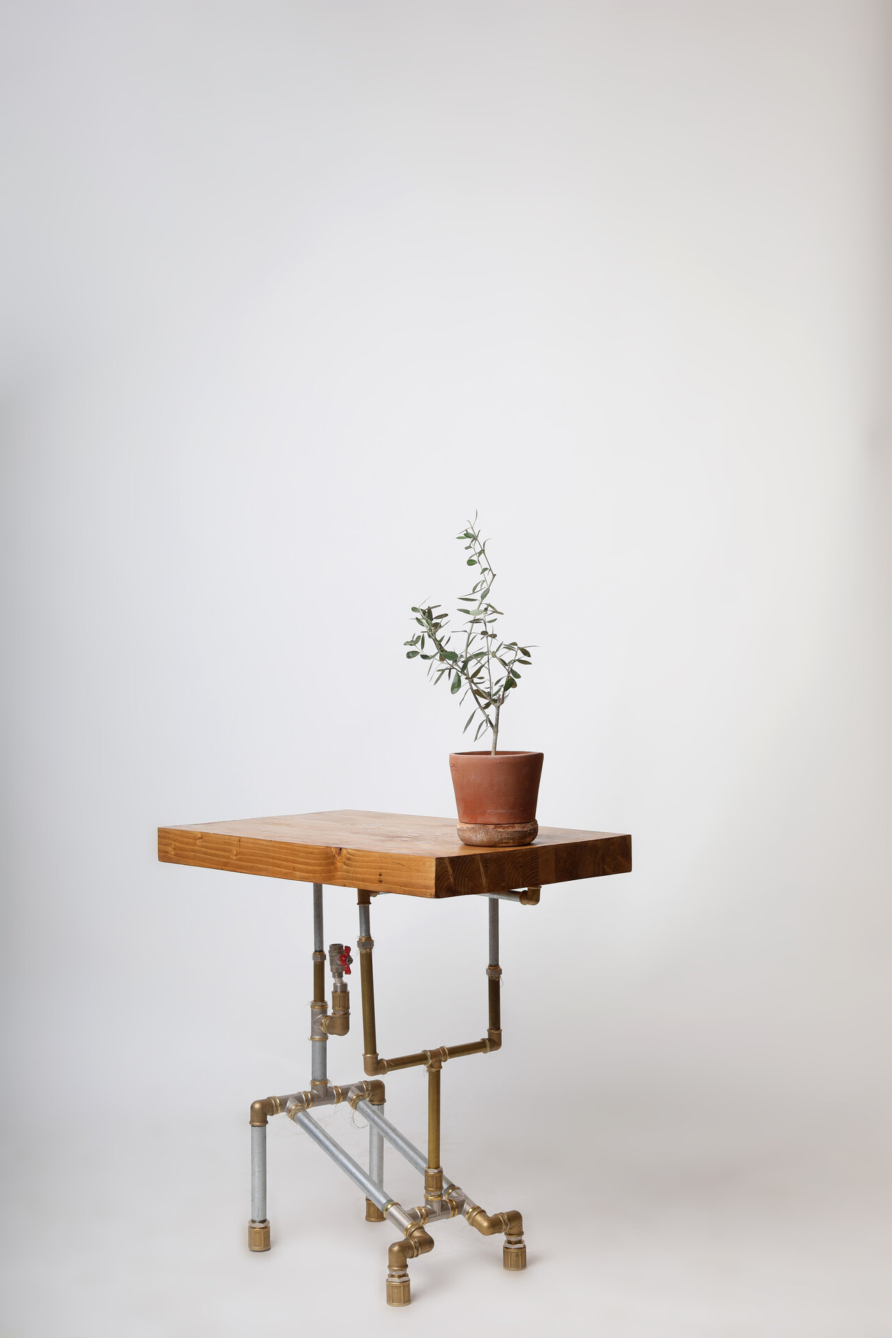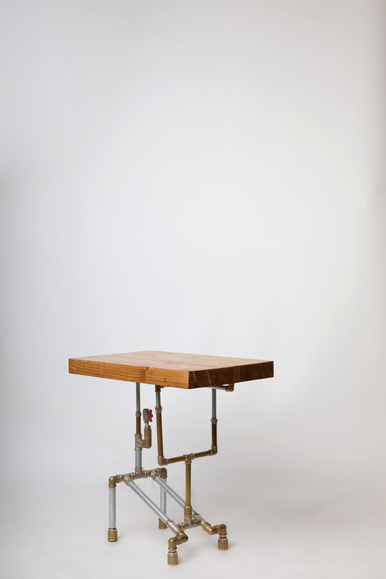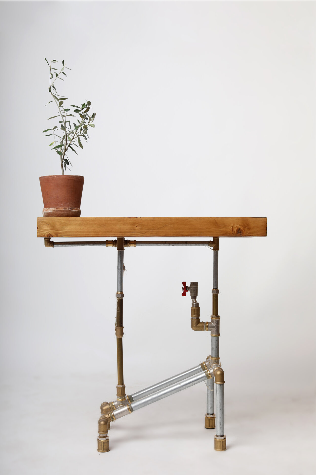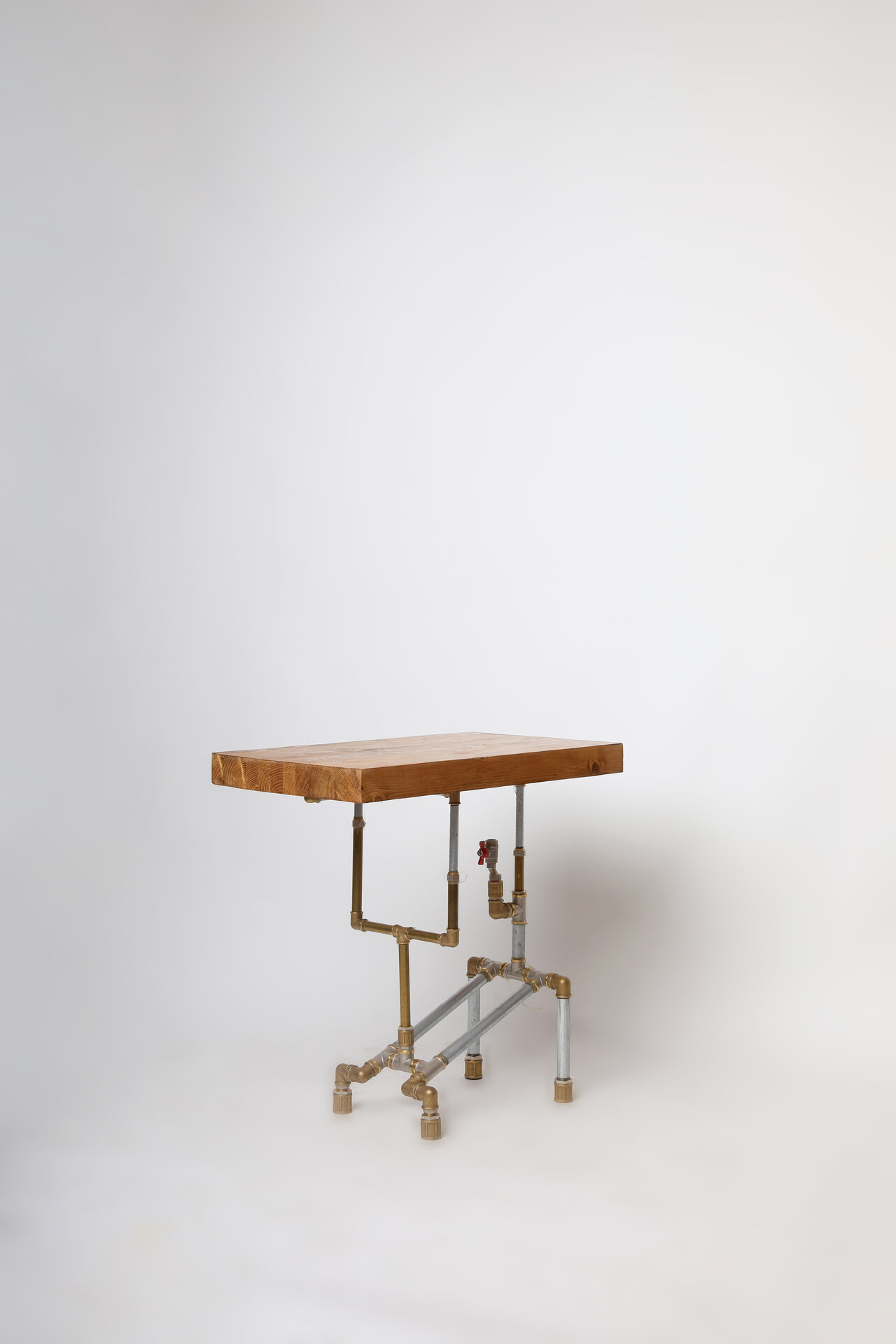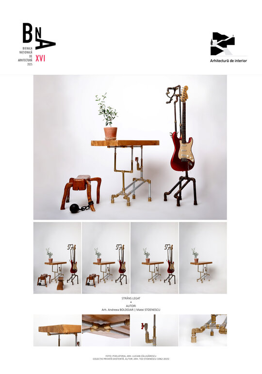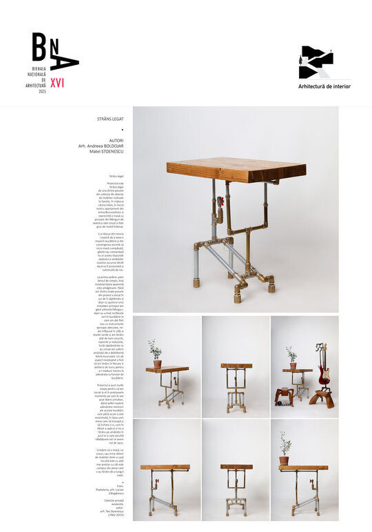Proiectul este Strâns.legat de una dintre piesele din colecția de obiecte de mobilier realizate în familie, în mijlocul căreia trăim, în micul nostru apartament din inima Bucureștiului și reprezintă o masă cu picioare din fittinguri de alamă și oțel zincat și blat gros de molid îmbinat.