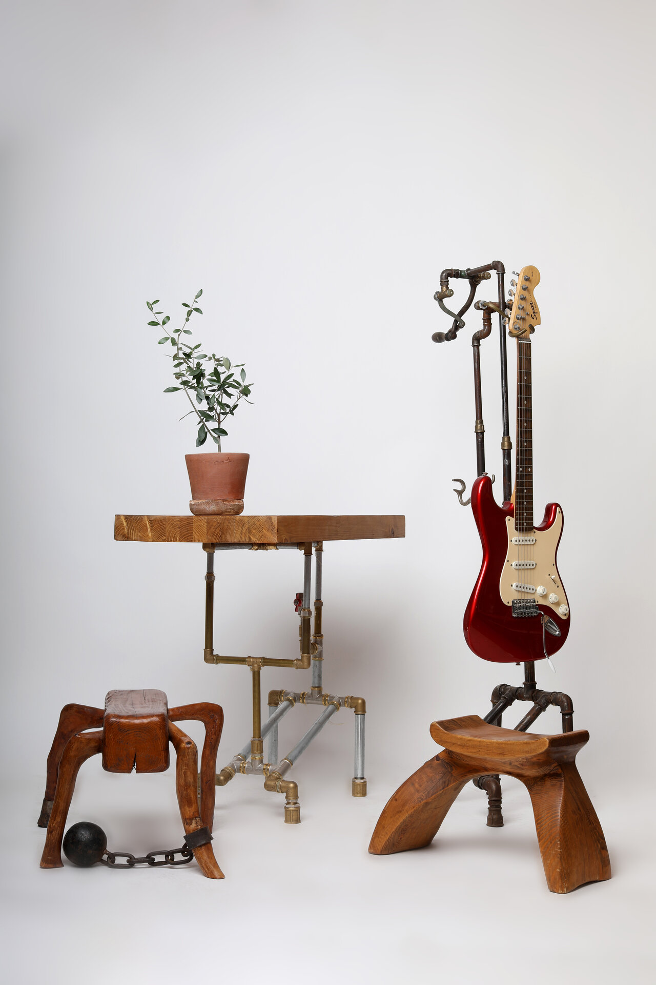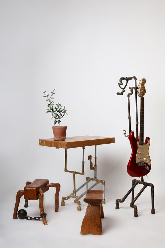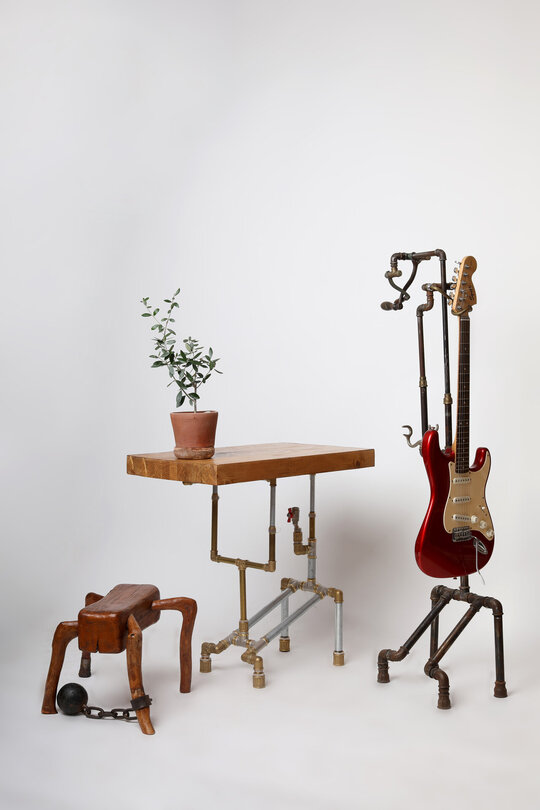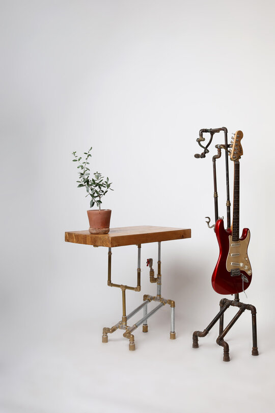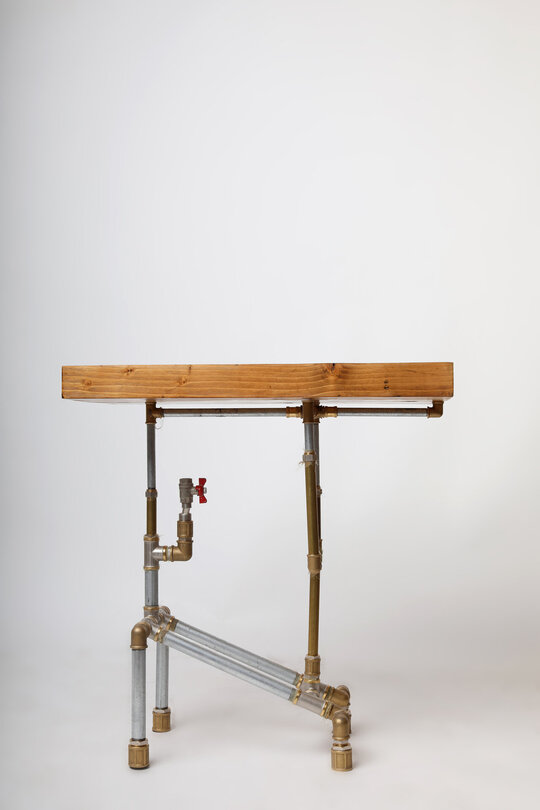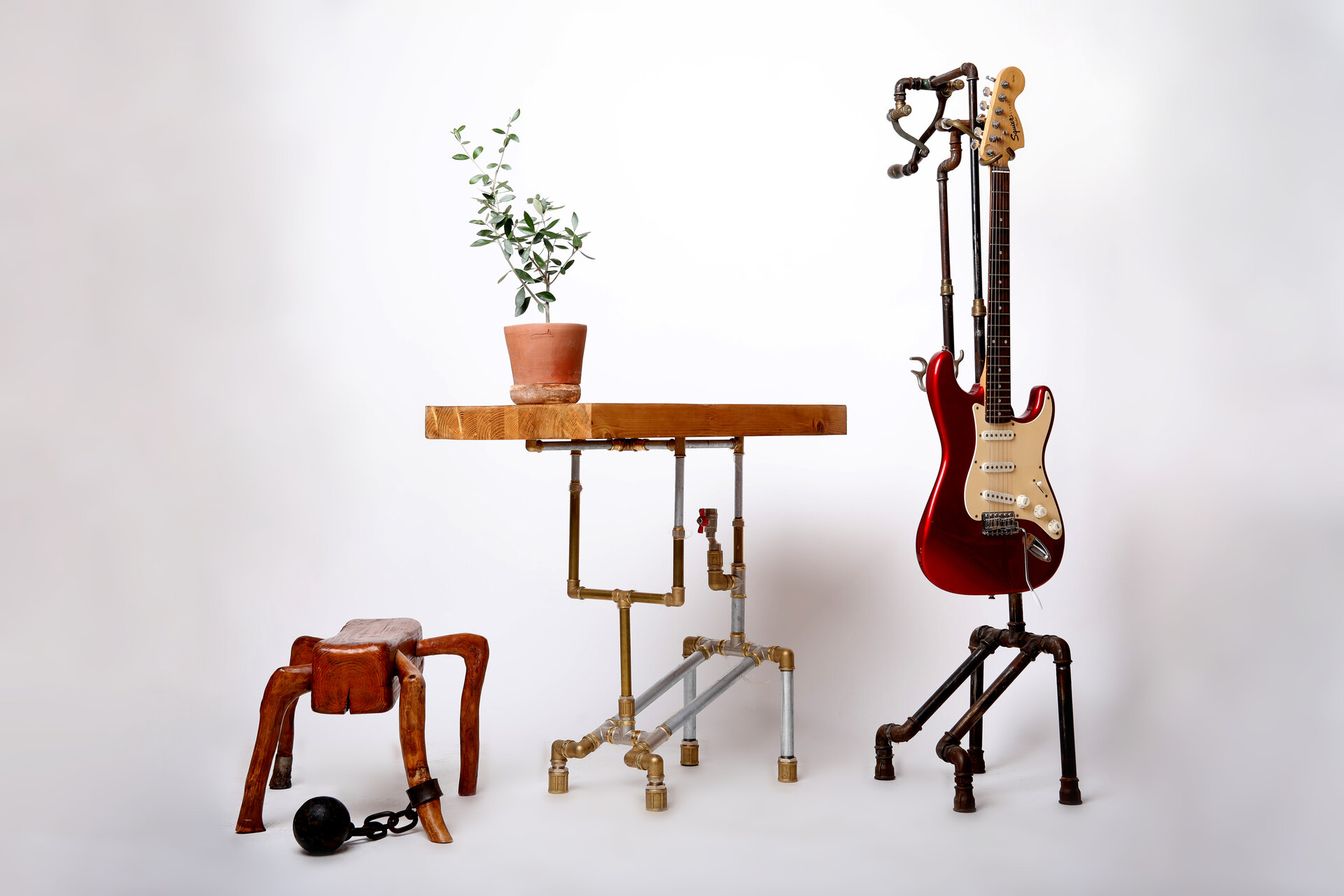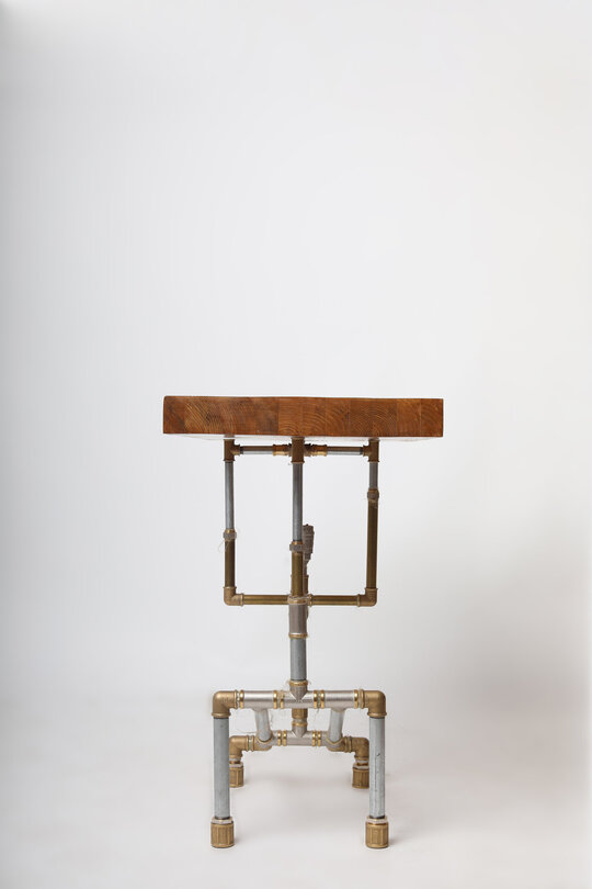 Proiectul este Strâns.legat de una dintre piesele din colecția de obiecte de mobilier realizate în familie, în mijlocul căreia trăim, în micul nostru apartament din inima Bucureștiului și reprezintă o masă cu picioare din fittinguri de alamă și oțel zincat și blat gros de molid îmbinat.