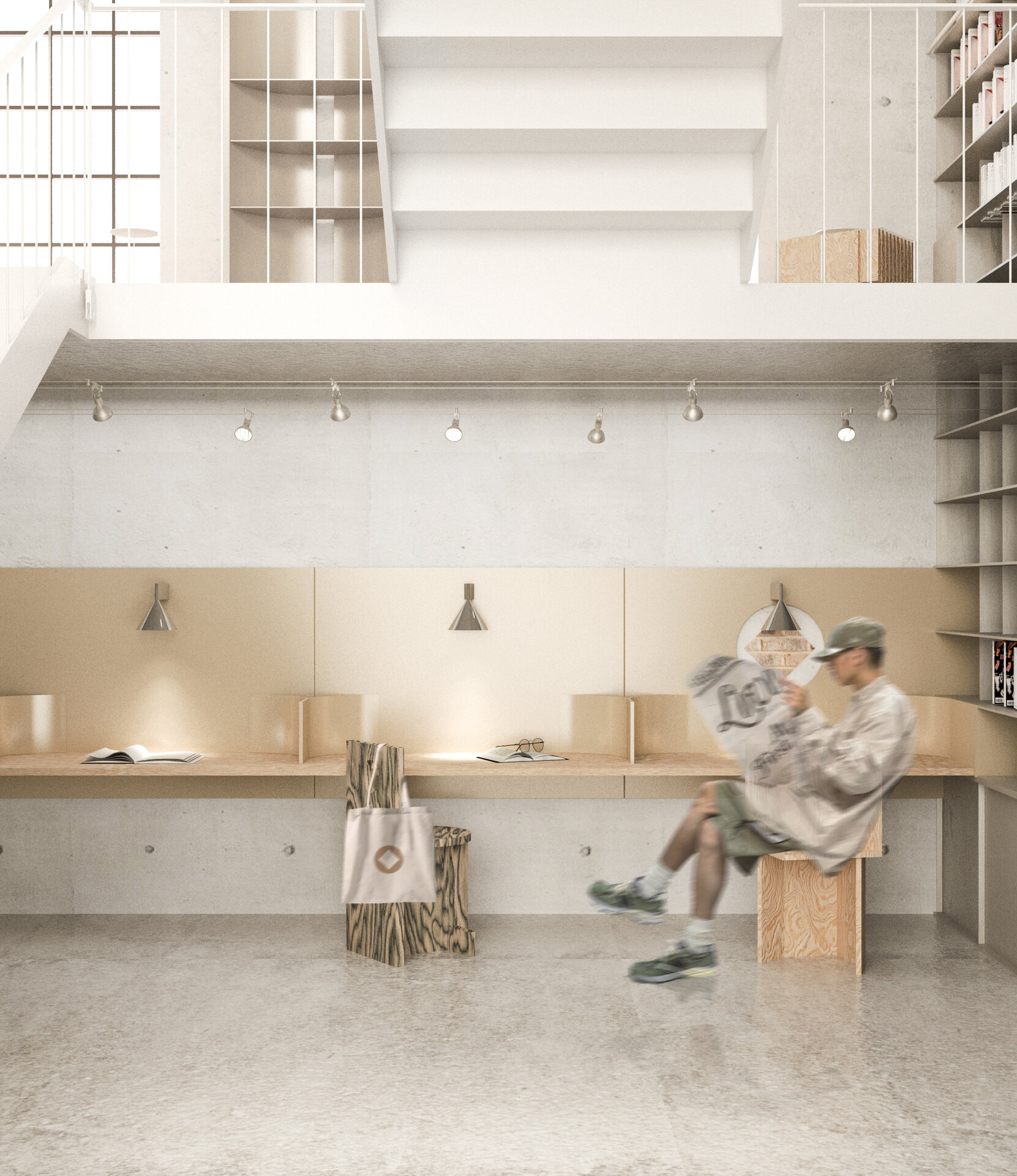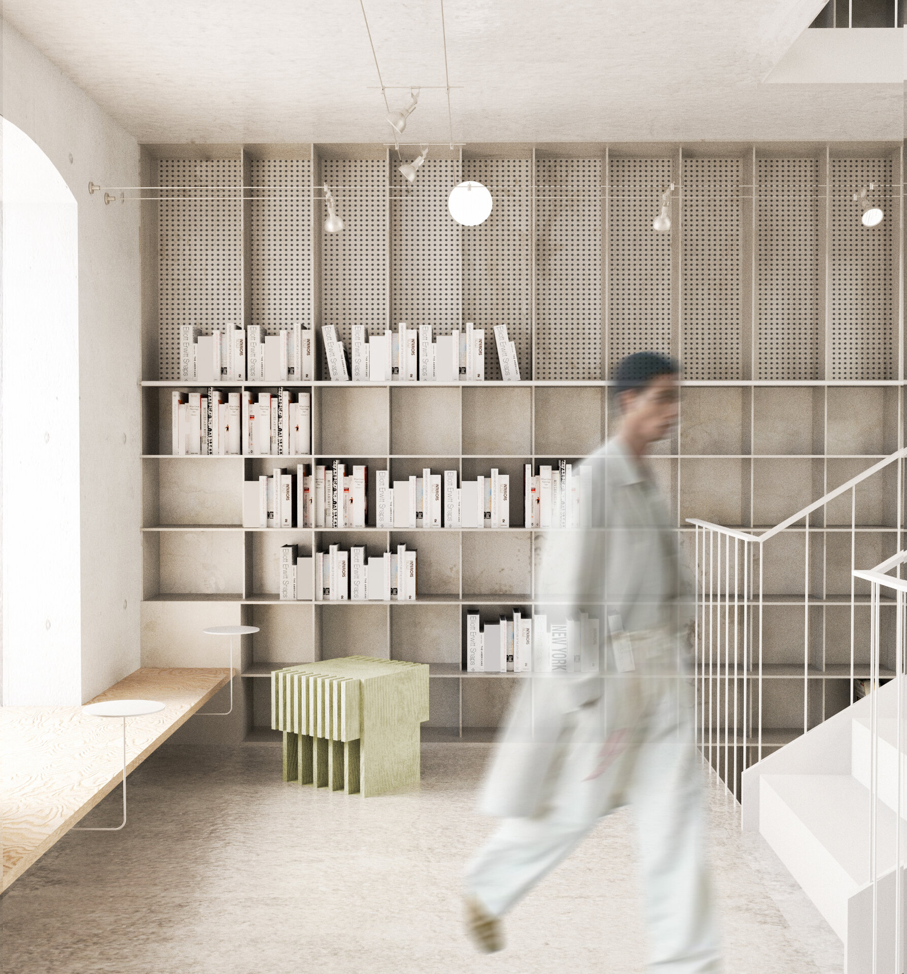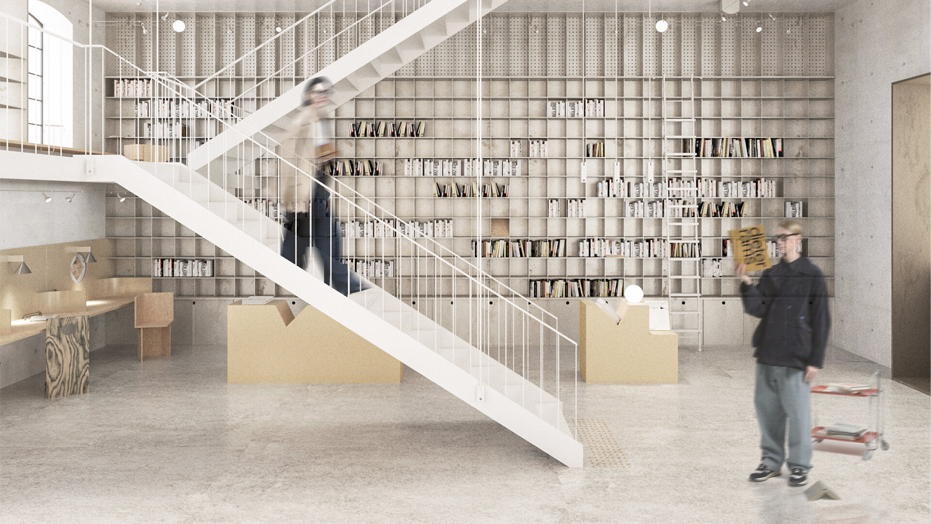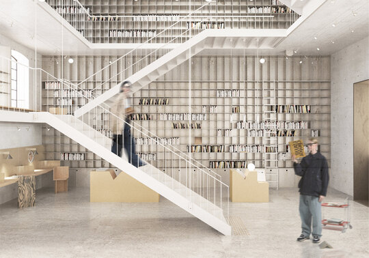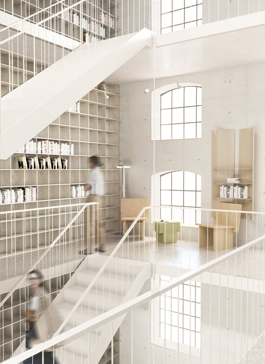 În siloz, o bibliotecă publică se întinde pe toată înălțimea acestuia printr-o serie de mezanine adăugate, cu acces din fiecare etaj al atelierului. Spațiul de cărți oferă resurse creative în disciplinele artelor vizuale și designului. Mezaninele cu centru liber permit vizitatorului să admire spațiul silozului ca un întreg. Scara adăugată creează o cale pentru vizitator care îl invită să descopere fiecare etaj treptat. Păstrând luminatorul existent, lumina naturală pătrunde prin golul central până la parter.