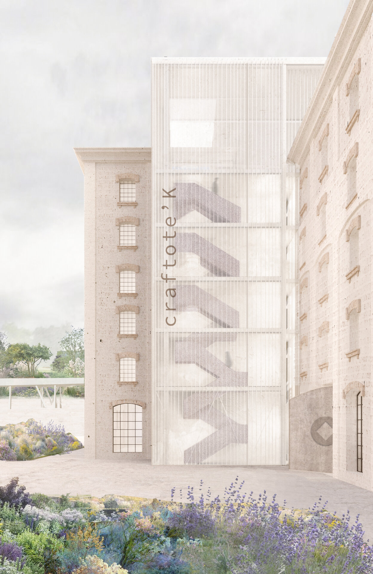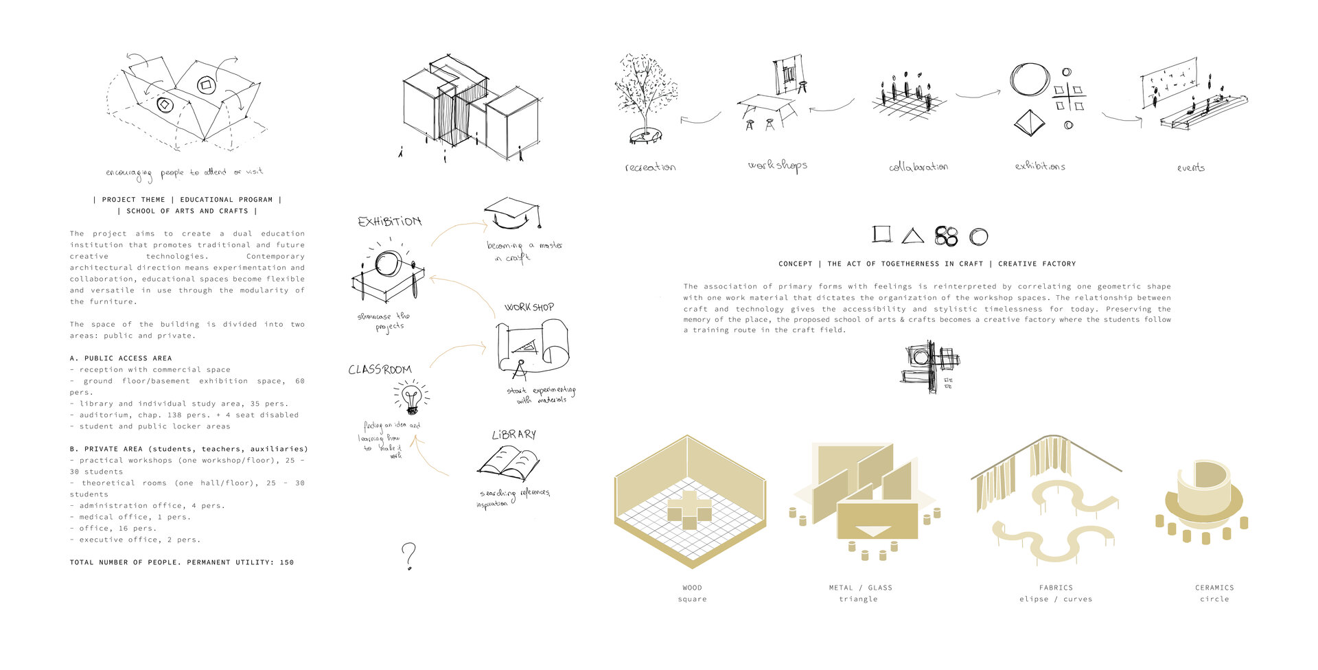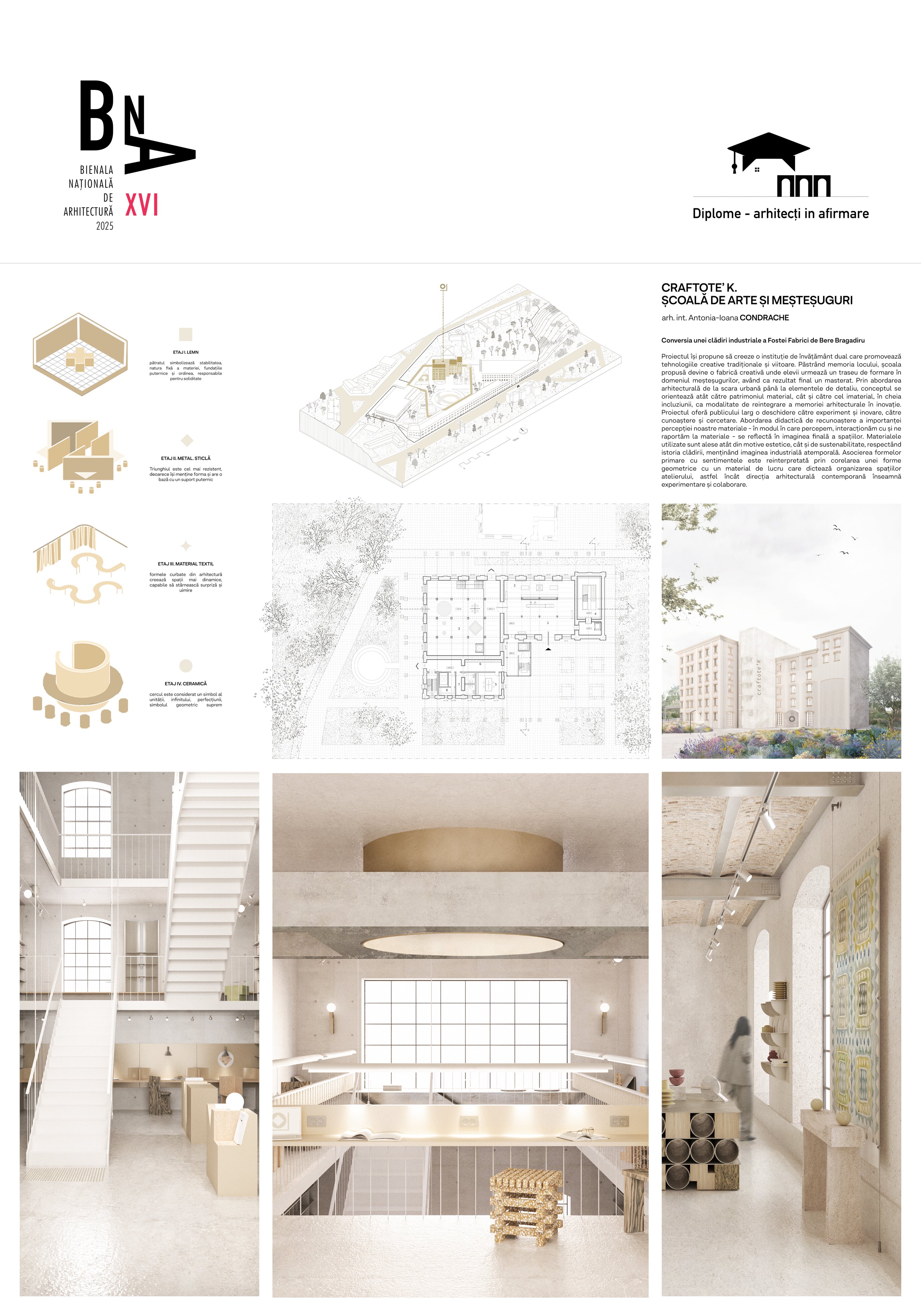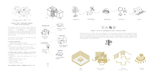 Proiectul își propune să creeze o instituție de învățământ dual care promovează tehnologiile creative tradiționale și de viitor. Păstrând memoria locului, CRAFTOTE’K devine o fabrică de creație unde studenții urmează un traseu de formare în domeniul meșteșugurilor. Proiectul oferă publicului larg o deschidere către experiment și inovație, către cunoaștere și cercetare. Întrucât arhitectura înseamnă experimentare și flexibilitate, am asociat fiecărui material de studiu o formă care m-a inspirat și care va dicta organizarea spațială a fiecărui atelier de pe fiecare etaj (lemn, hârtie – pătrat, metal, sticlă – triunghi, materiale textile – forme curbe, ceramică – cerc). Atelierele sunt caracterizate de motivul simbolic care se transformă în camere „cutie în cutie” și sunt poziționate astfel încât să creeze zone de lucru diferite. Pereții despărțitori au rolul de a separa restul atelierului de alte activități zgomotoase, iar pereții sunt proiectați ca spații de depozitare.
