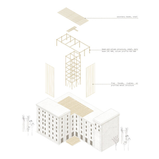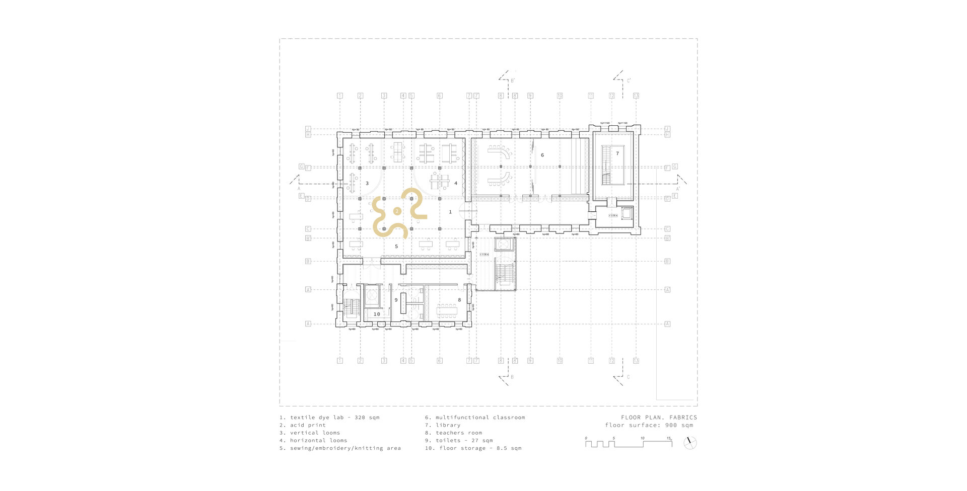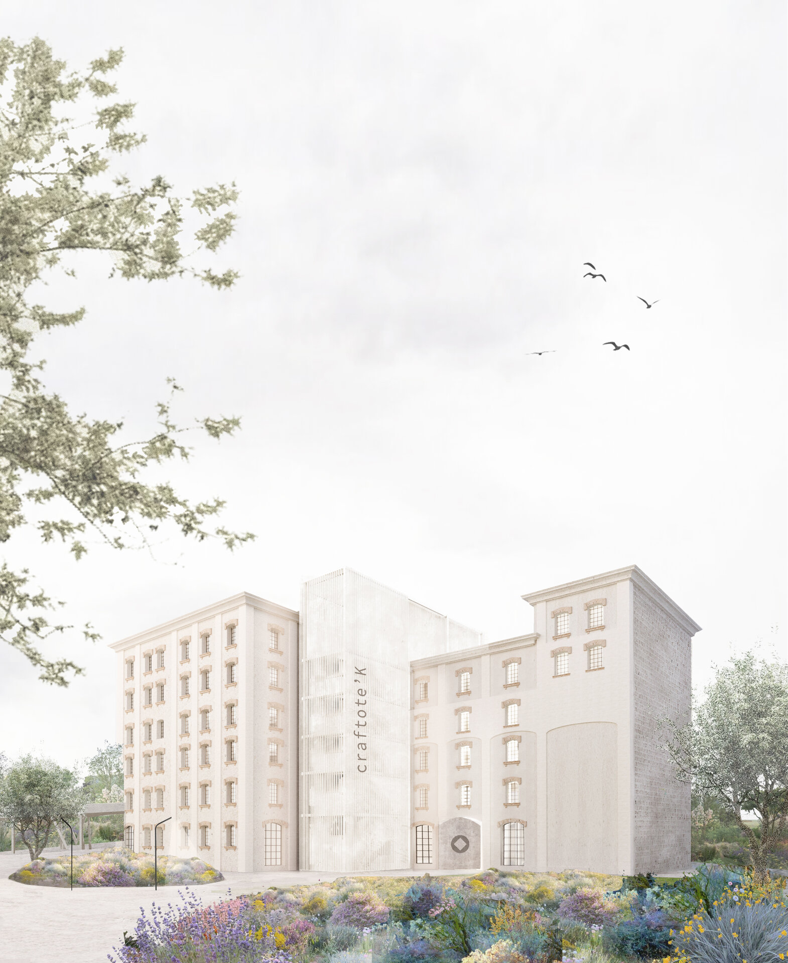 Proiectul își propune să creeze o instituție de învățământ dual care promovează tehnologiile creative tradiționale și de viitor. Păstrând memoria locului, CRAFTOTE’K devine o fabrică de creație unde studenții urmează un traseu de formare în domeniul meșteșugurilor. Proiectul oferă publicului larg o deschidere către experiment și inovație, către cunoaștere și cercetare. Întrucât arhitectura înseamnă experimentare și flexibilitate, am asociat fiecărui material de studiu o formă care m-a inspirat și care va dicta organizarea spațială a fiecărui atelier de pe fiecare etaj (lemn, hârtie – pătrat, metal, sticlă – triunghi, materiale textile – forme curbe, ceramică – cerc). Atelierele sunt caracterizate de motivul simbolic care se transformă în camere „cutie în cutie” și sunt poziționate astfel încât să creeze zone de lucru diferite. Pereții despărțitori au rolul de a separa restul atelierului de alte activități zgomotoase, iar pereții sunt proiectați ca spații de depozitare.
