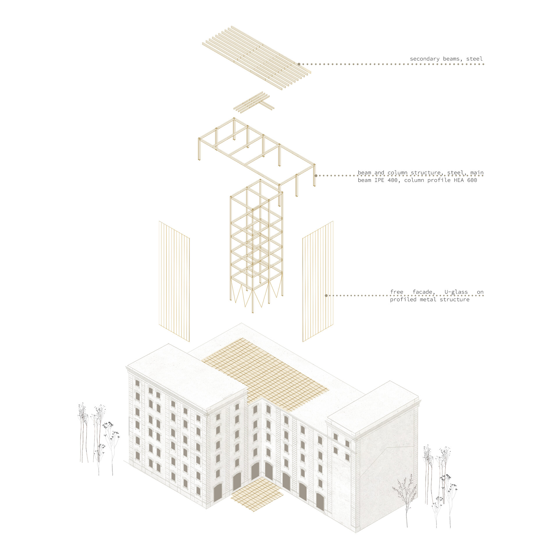 Clădirea propusă pentru proiect este una dintre cele mai vechi ale fabricii din ansamblul Fabricii de bere Bragadiru, construită în 1908. În acest context urban istoric fragmentat este necesară obținerea unui răspuns semnificativ pentru viitor. Prin abordarea arhitecturală de la scara urbană la elementul arhitectural, conceptul este orientat atât către patrimoniul tangibil, cât și către cel imaterial, în cheia incluziunii, ca modalitate de reintegrare a memoriei arhitecturale într-un context nou.