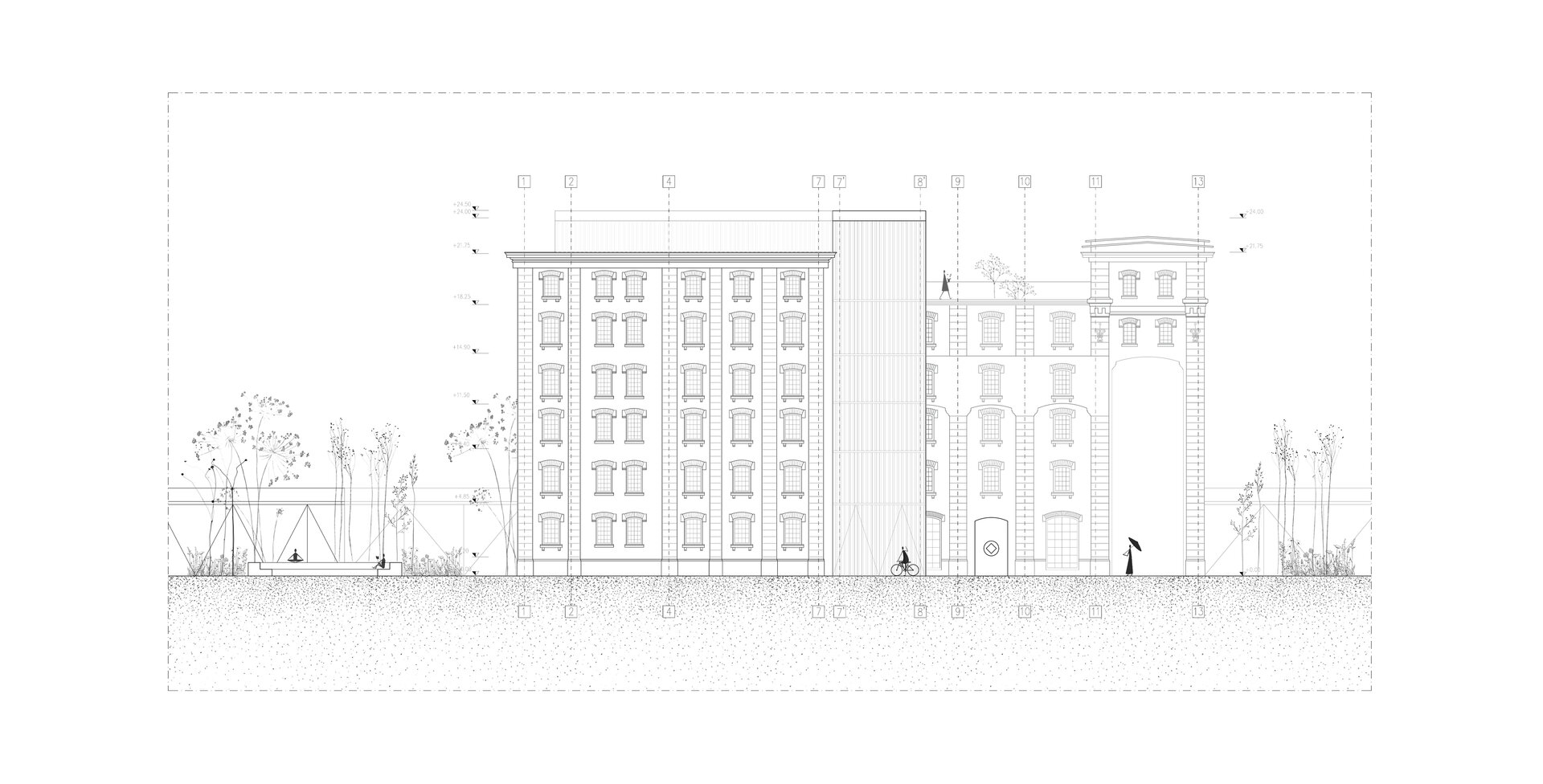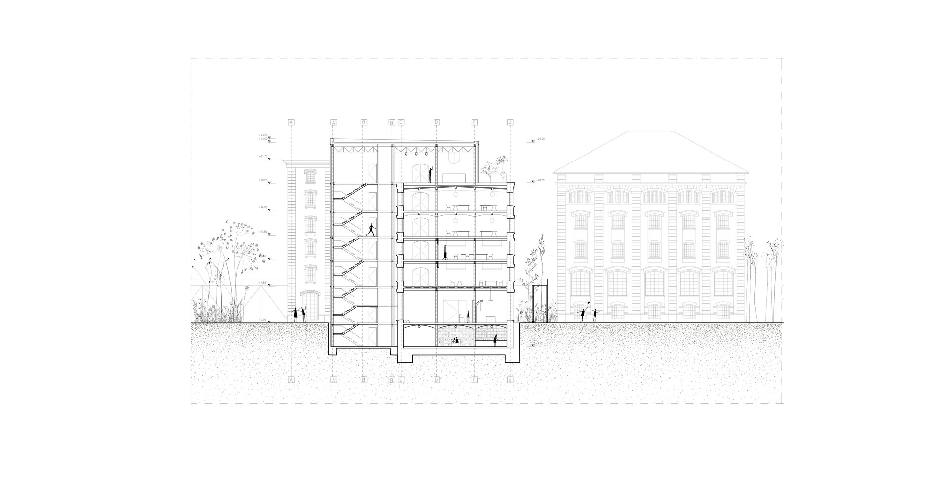 În ceea ce privește intervenția arhitecturală, clădirea este restaurată pentru a-și păstra caracterul istoric. Din motive structurale, pereții interiori sunt cămășuiți. Din cauza deteriorării scărilor existente, o nouă extindere are ia locul casei scării principale ce continuă pe terasă cu o sală multifuncțională. Extinderea are o structură independentă de clădirea originală, adăugând un limbaj industrial contemporan prin sticlă sablată care creează un efect uniform.