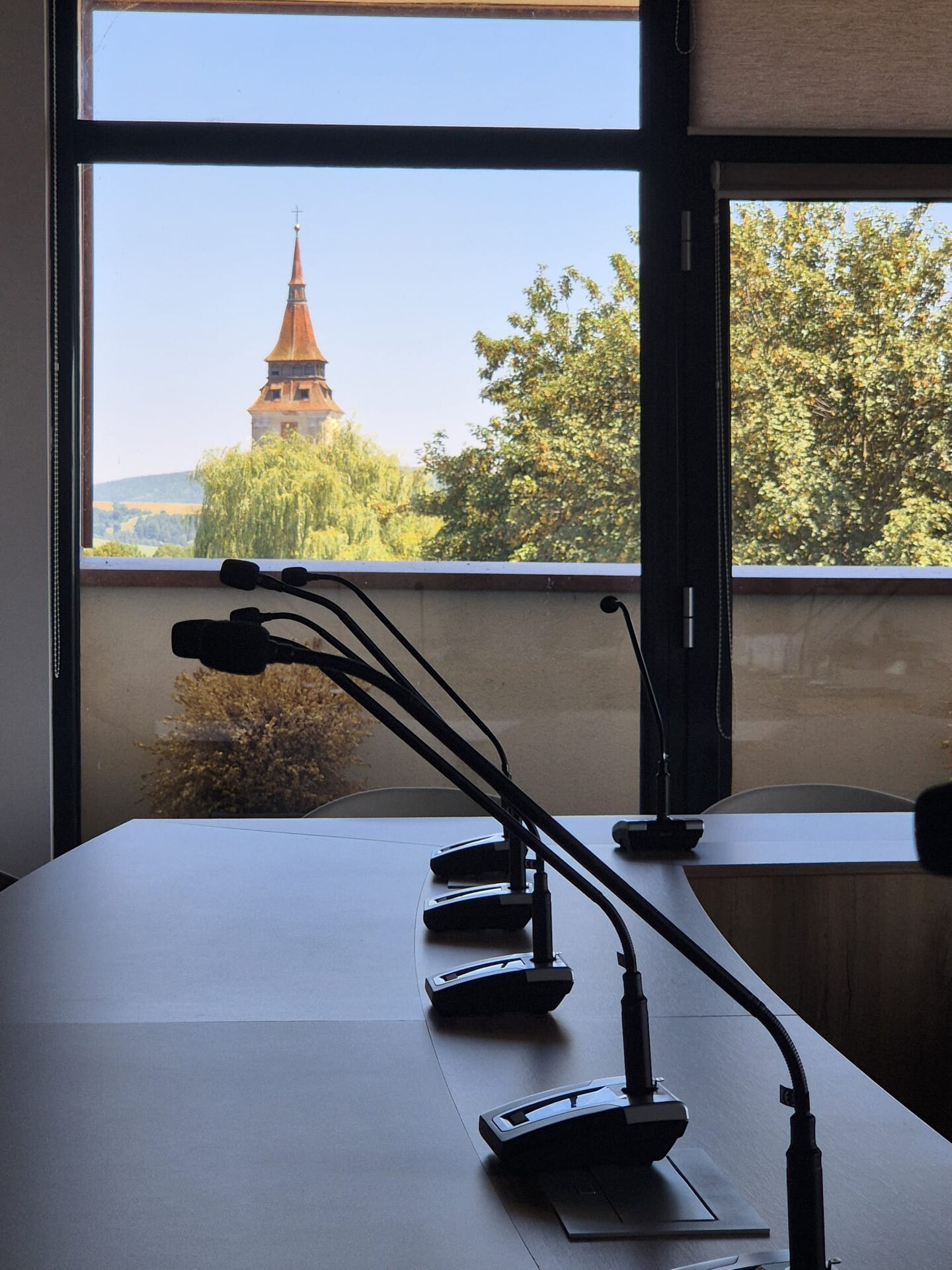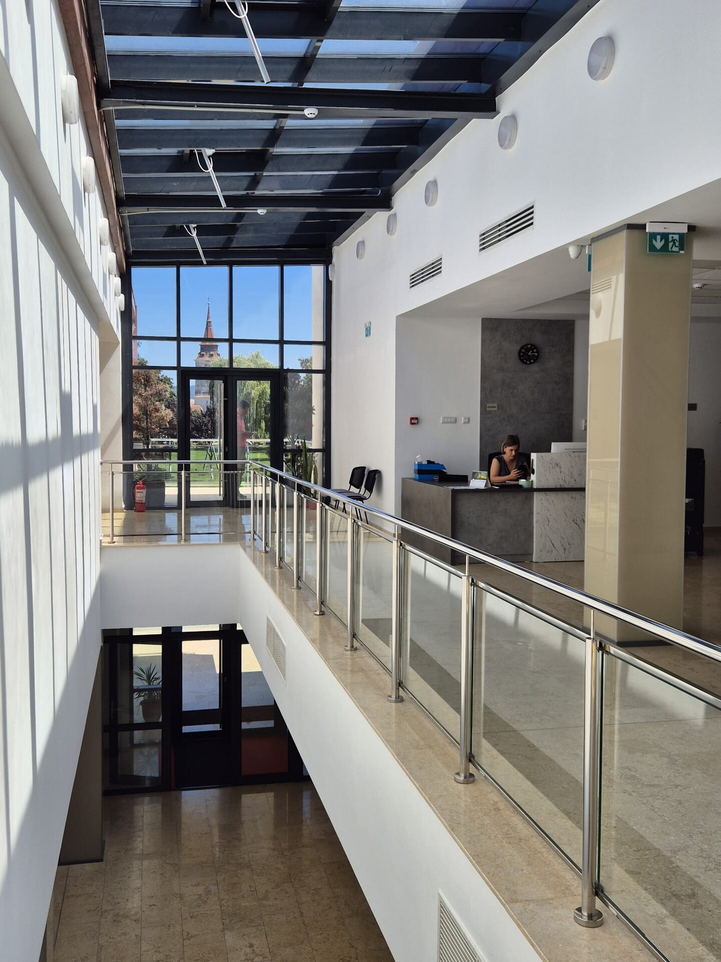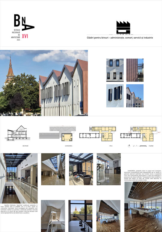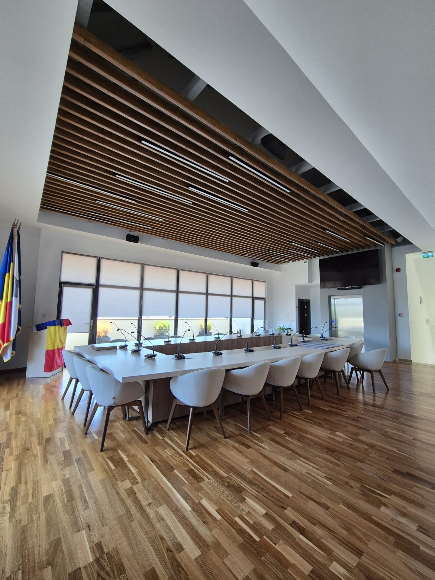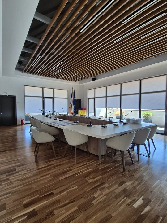 Arhitectura interioara a fost gandita sa reprezinte o administratie moderna, deschisa spre comunitate si in legatura stransa cu bogatia patrimoniala a localitatii. Finisajele si instalatiile interioare moderne, mobilierul nou proiectat ca linie estetica-ergonomica unitara contribuie la climatul lucrativ de colaborare cu publicul, reprezentand si un gest de educatie culturala si civica. Solutiile aplicate pentru sustenabilitate si energii alternative completeaza grija pentru folosire decenta a finantelor publice.