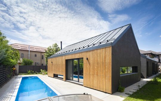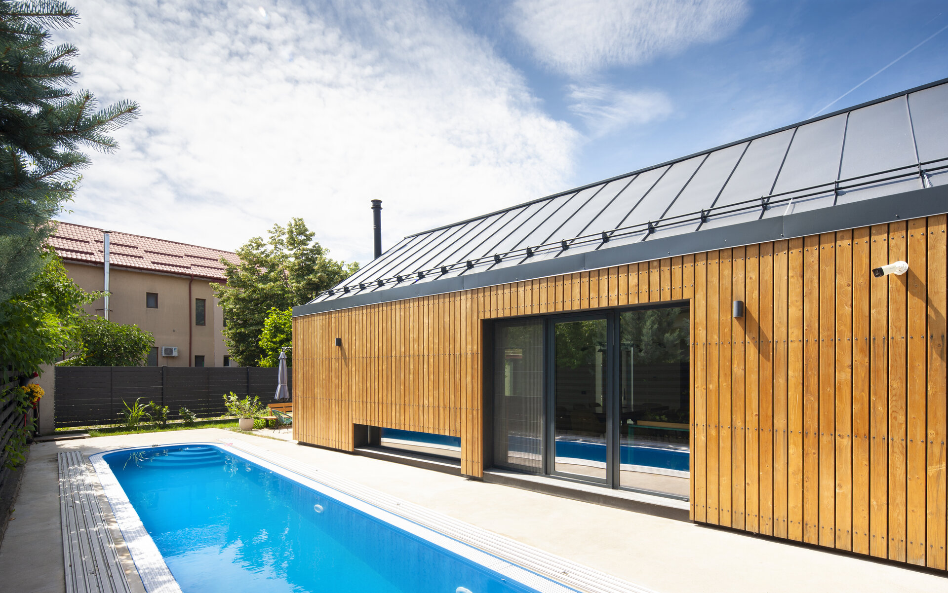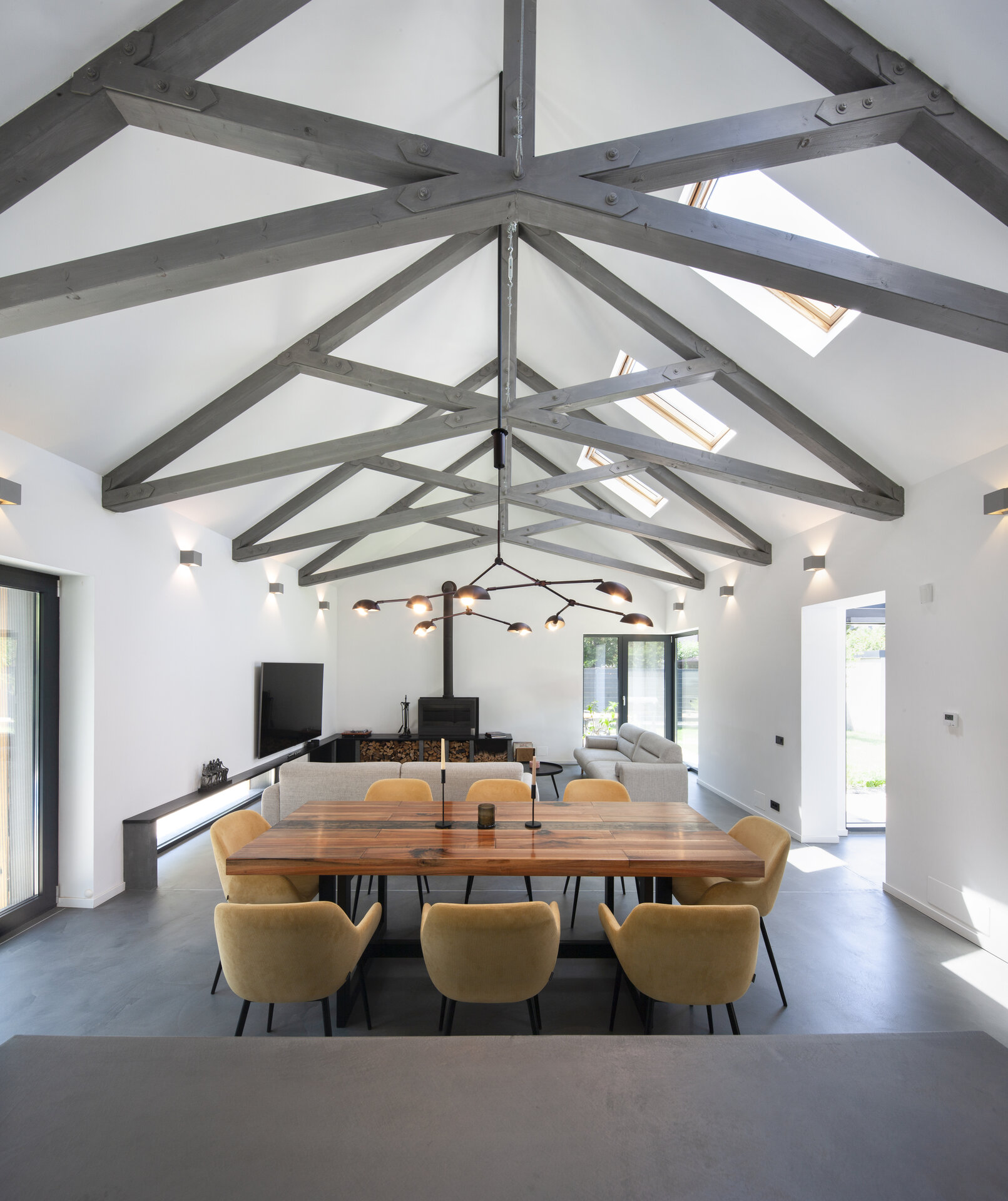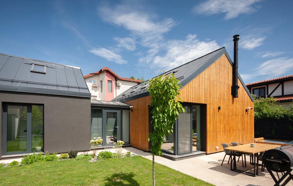 Proiectul recuperează arhetipul casei de țară – cu acoperiș în două ape, de tip șarpantă – dar îl reinterpretează într-o cheie contemporană. Această geometrie este adusă în interior, unde contribuie la definirea unor spații ample, aerisite și luminoase. Astfel, arhitectura nu doar că evită monumentalitatea, dar valorifică subtil expresia estetică a unei locuințe calme, echilibrate și profund funcționale.